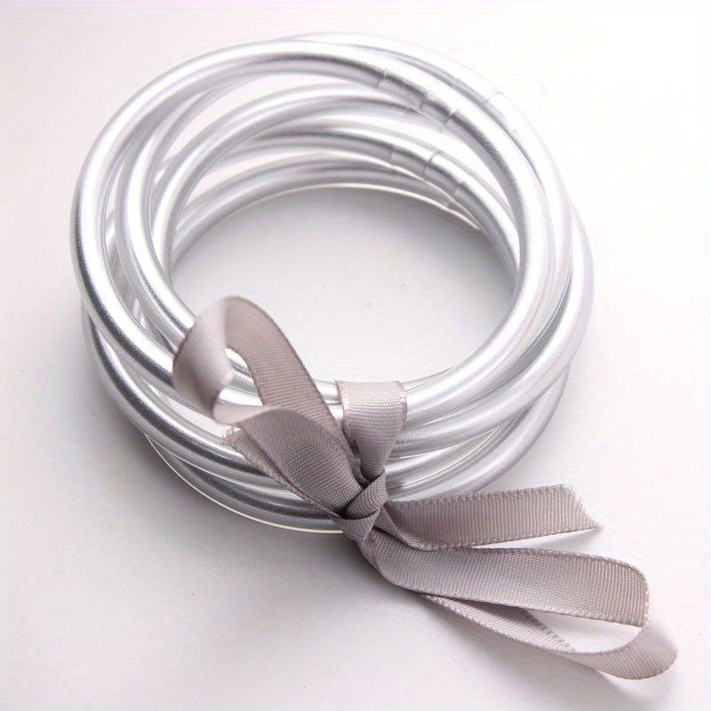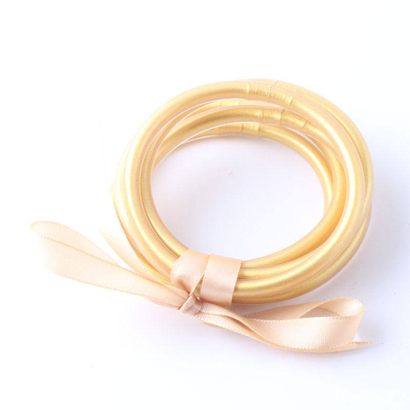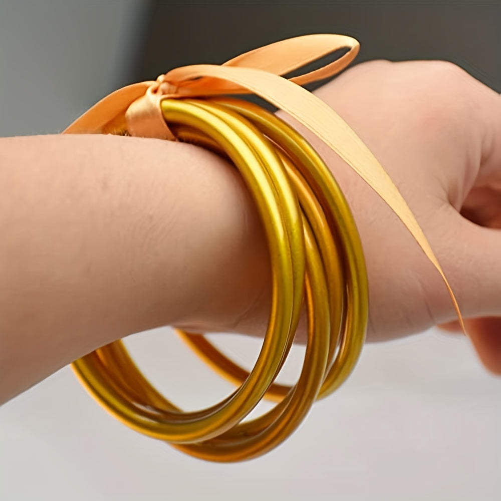 Shine bright with this 5-piece set of glitter golden jelly bracelets featuring a bowknot design. Perfect for beach vacations, parties, and everyday wear.