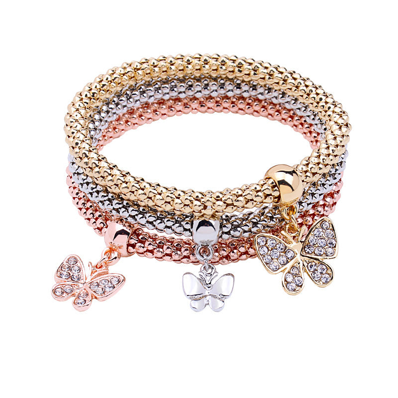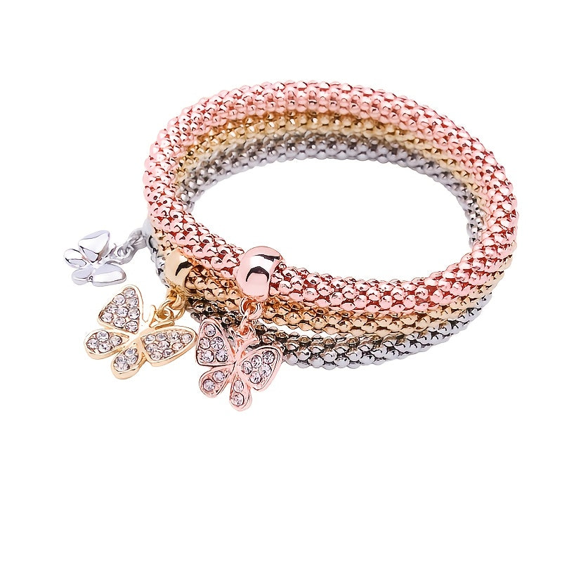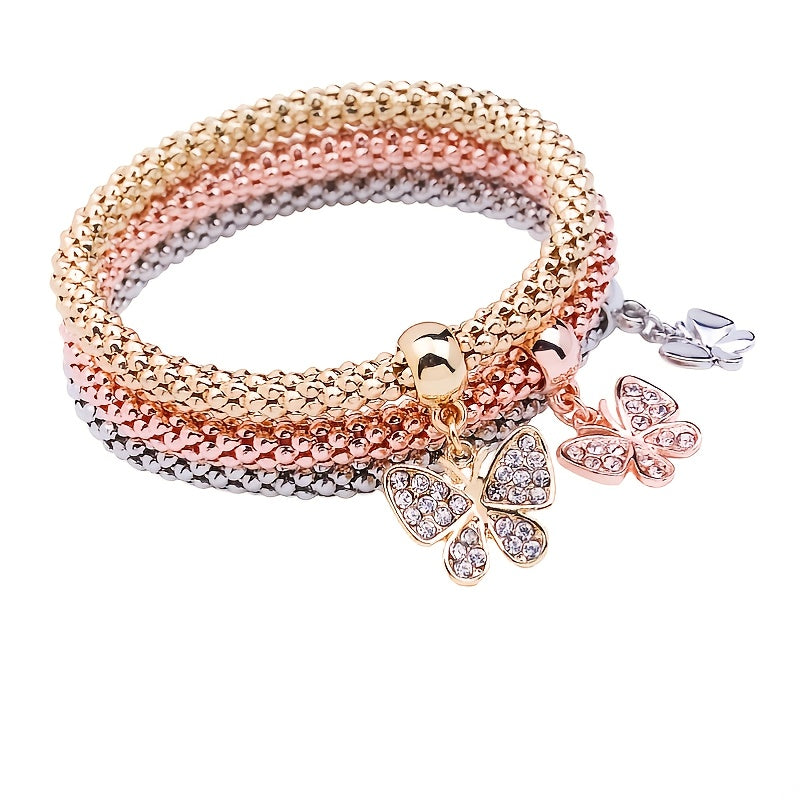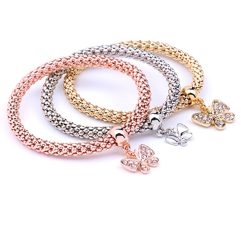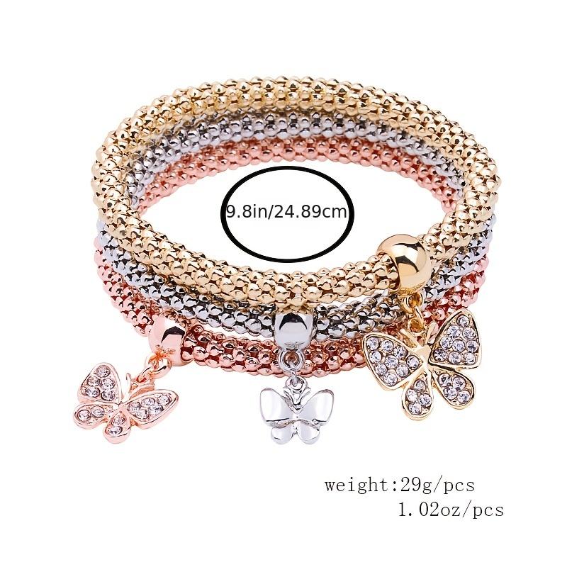 Add a touch of charm and elegance to your look with this 3pcs combo butterfly rhinestone bracelet. Perfect for ladies who love a bit of sparkle.