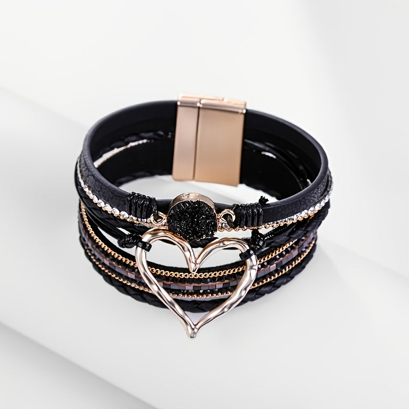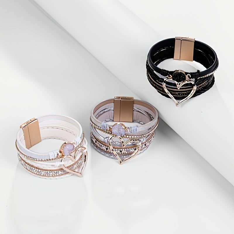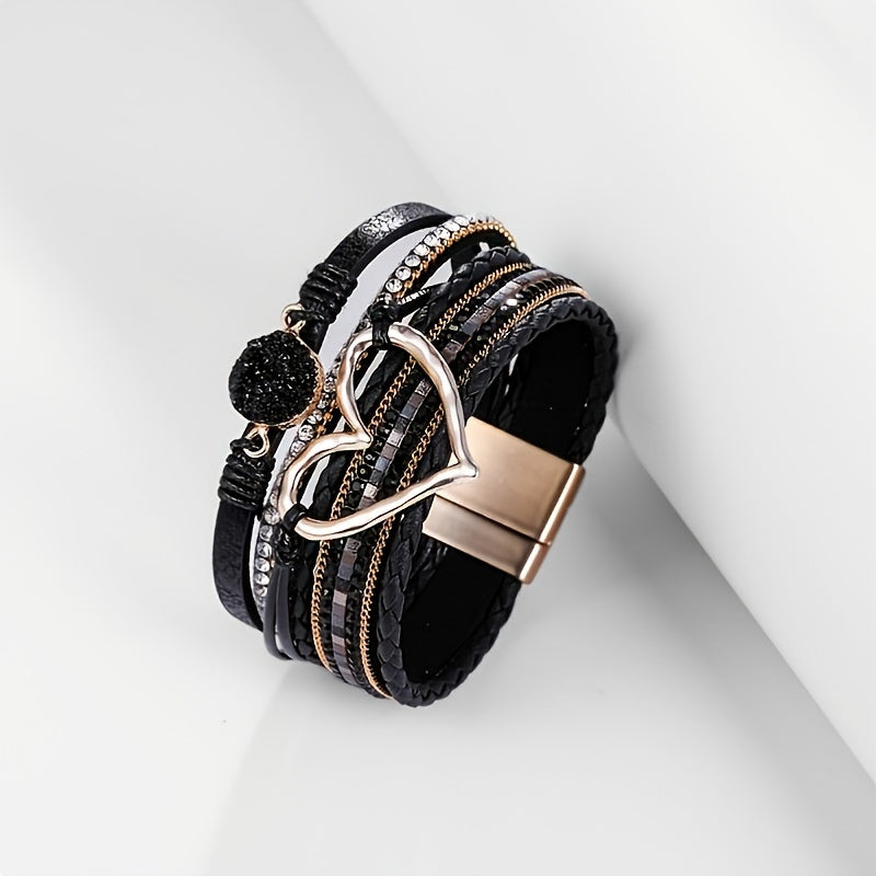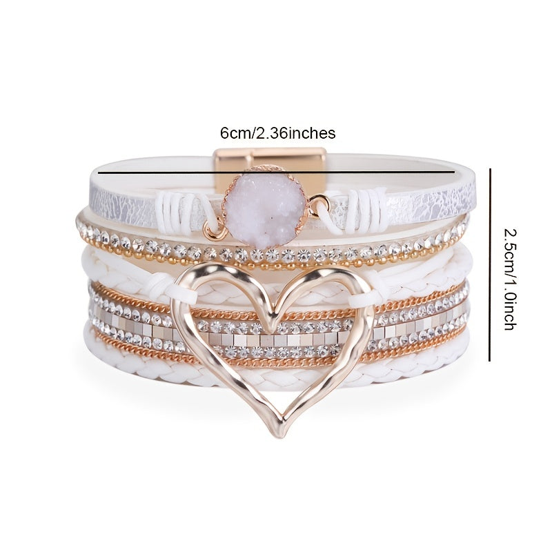 Add a touch of bohemian style with this multilayer wrap bracelet featuring heart and rhinestone circle charms. The braided PU leather adds a trendy touch to your look.