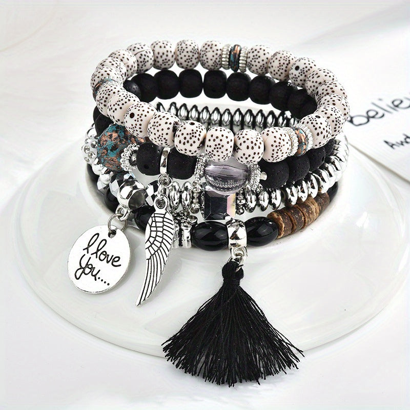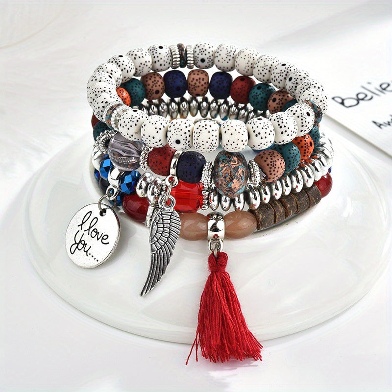 Elevate your style with this 4-piece set of men's bracelets featuring a bohemian design with crystals, turquoise, tassels, and wings. Perfect for parties and special occasions.