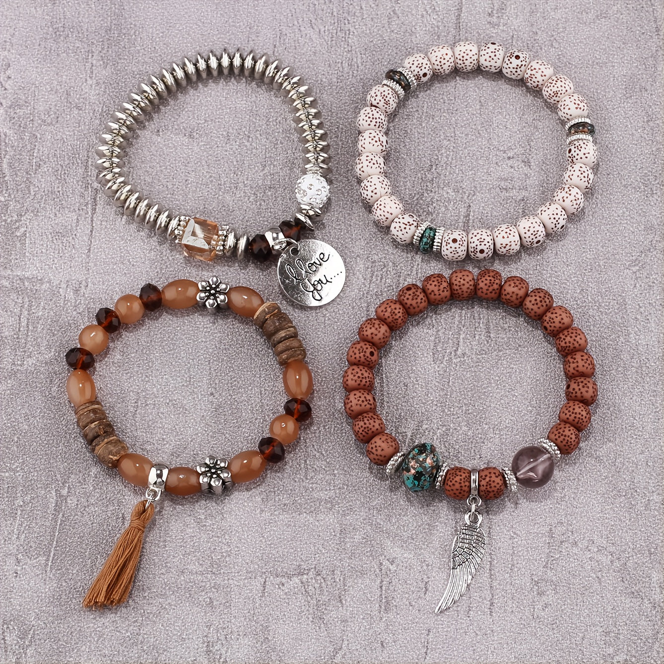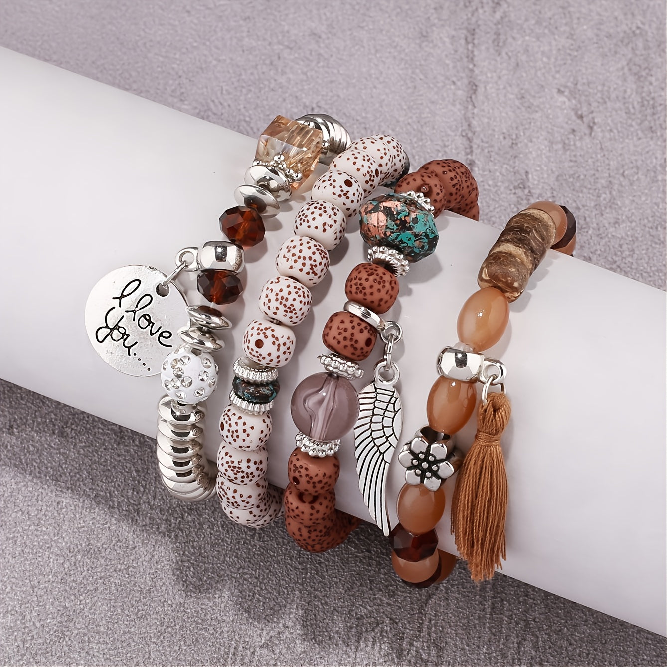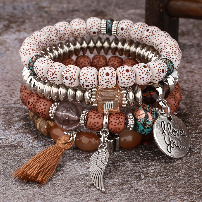 Enhance your party look with this bohemian-style bracelet featuring creative crystal details, multiple layers, turquoise accents, tassel charm, and wing elements.