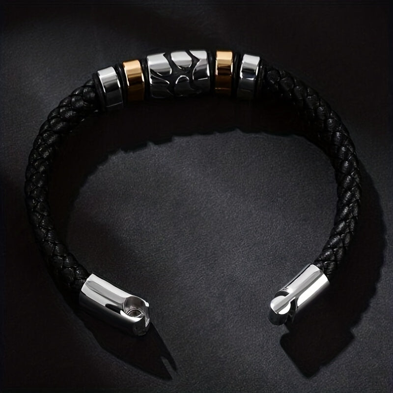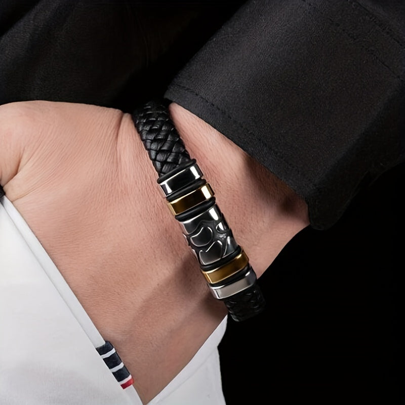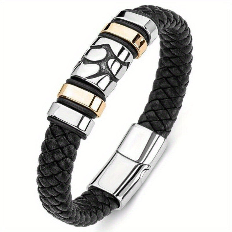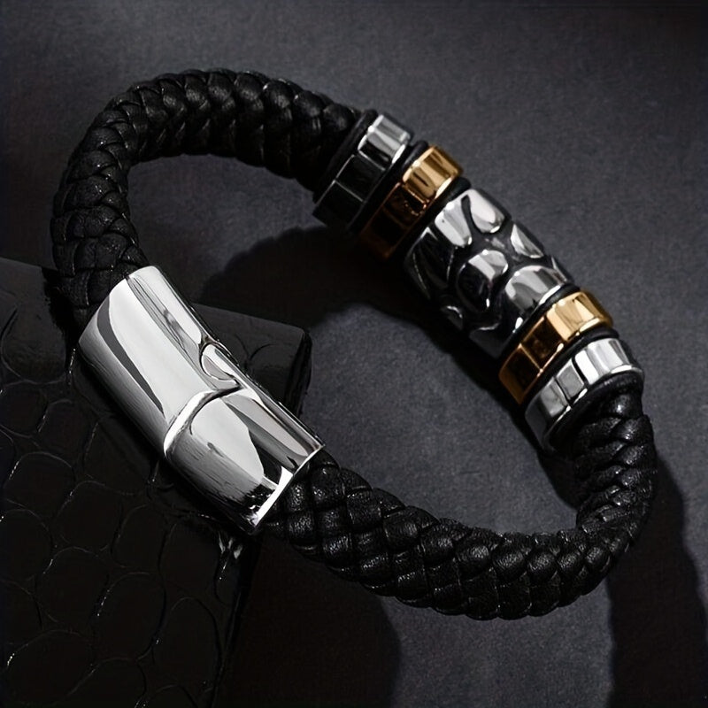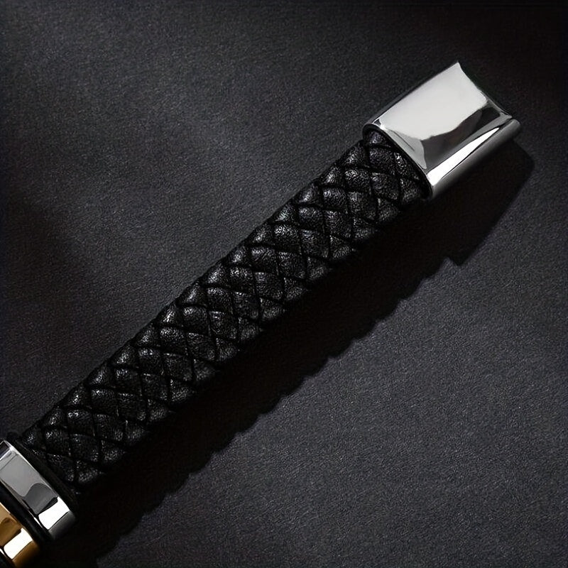 This classic men's bracelet features a braided leather design with a metal magnetic buckle closure. It adds a touch of personality to your look and is perfect for casual wear.
