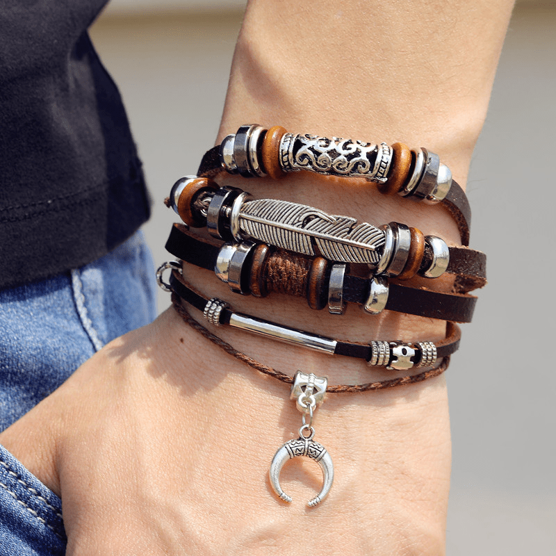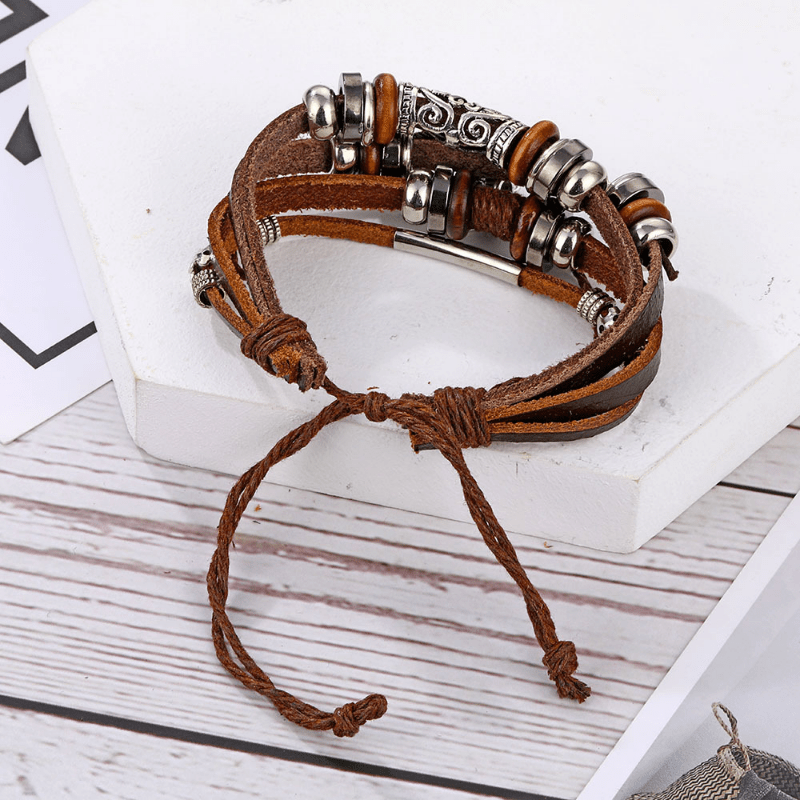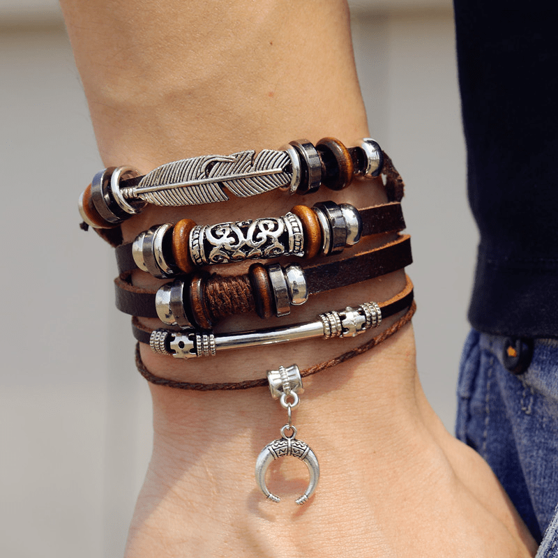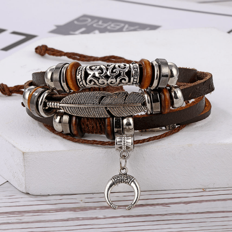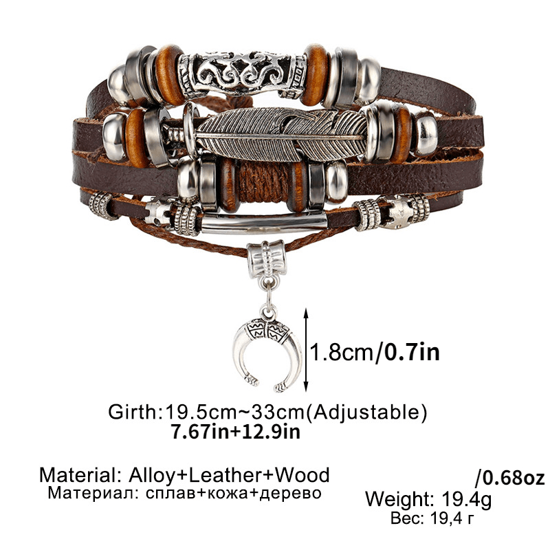 Enhance your style with this vintage brown leather bracelet featuring intricate feather and bead design.
