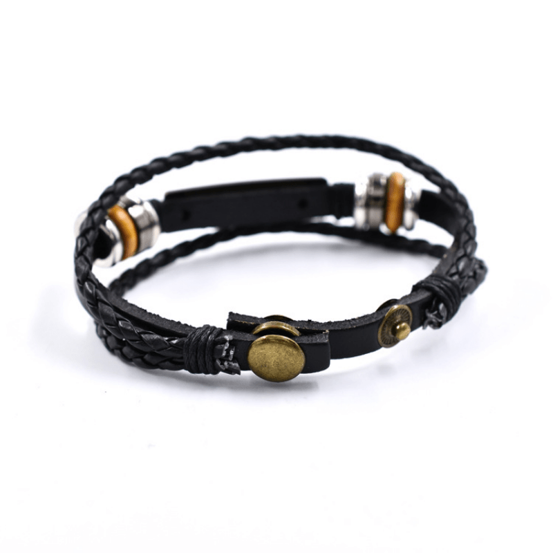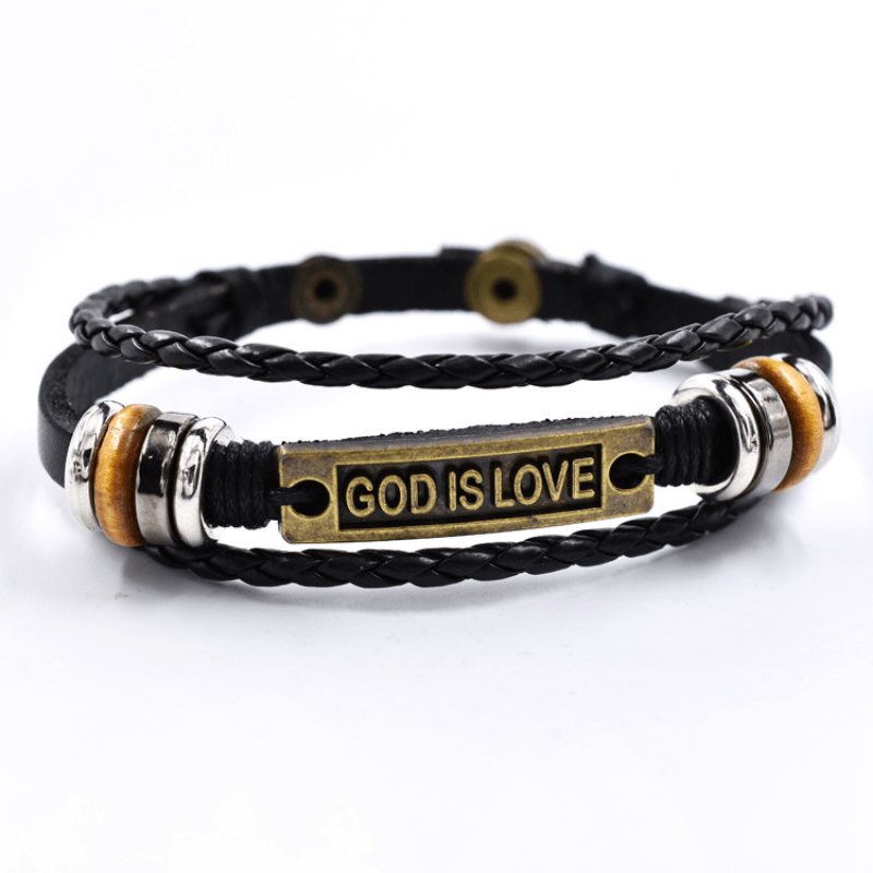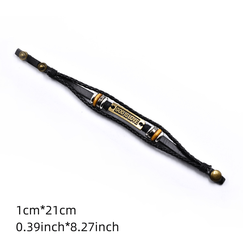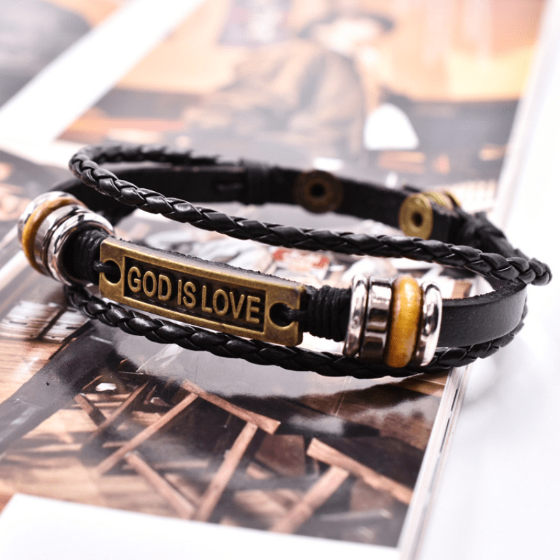 This bracelet features a layer of PU leather with woven design and 'God Is Love' letter charm. It is a stylish accessory for men.