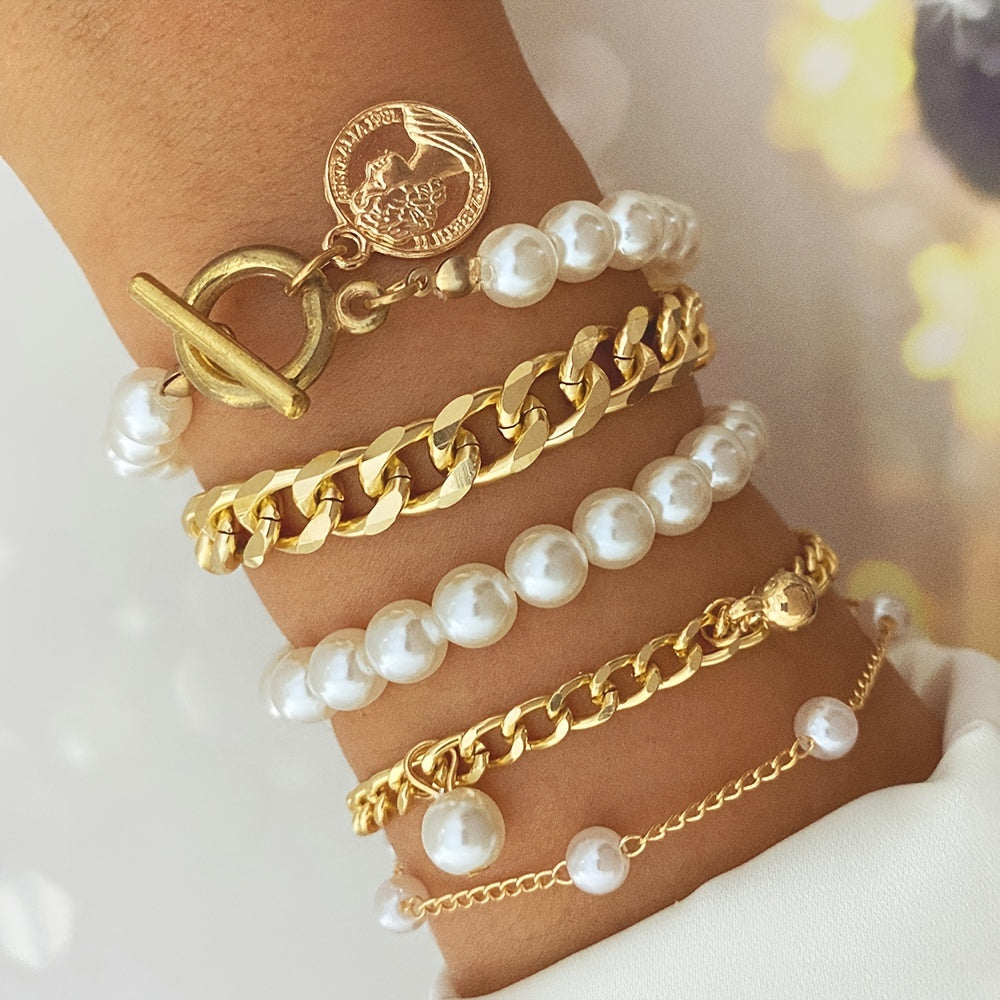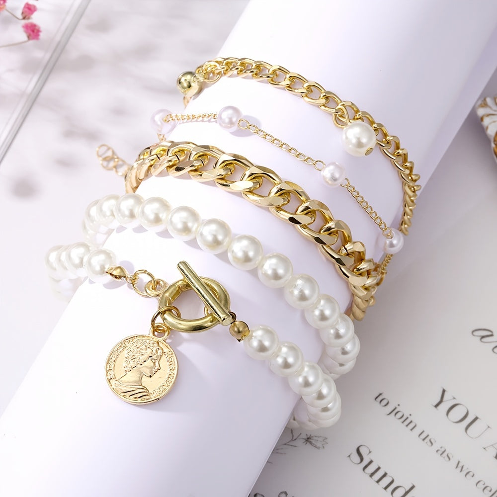Create your unique look with this stackable faux pearls chain bracelet set. Detachable and freely combinable, add personality to your style.