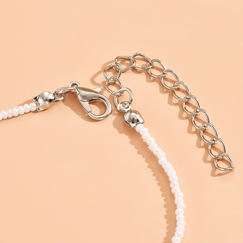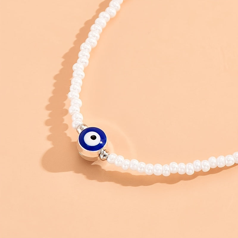 This bracelet features a devil's eye shape pattern on a rice beads chain. It is believed to bring good luck and charm. A stylish accessory for women.