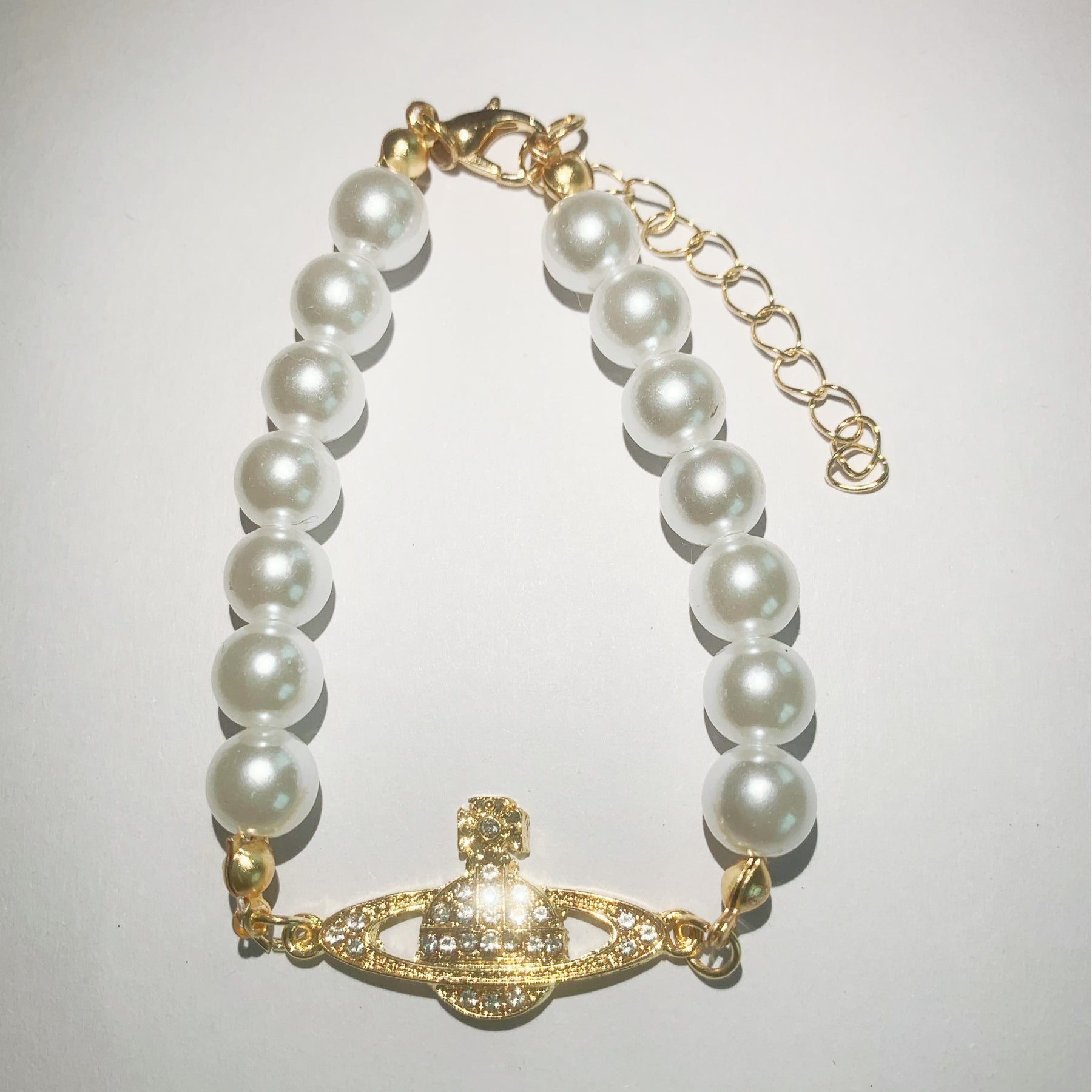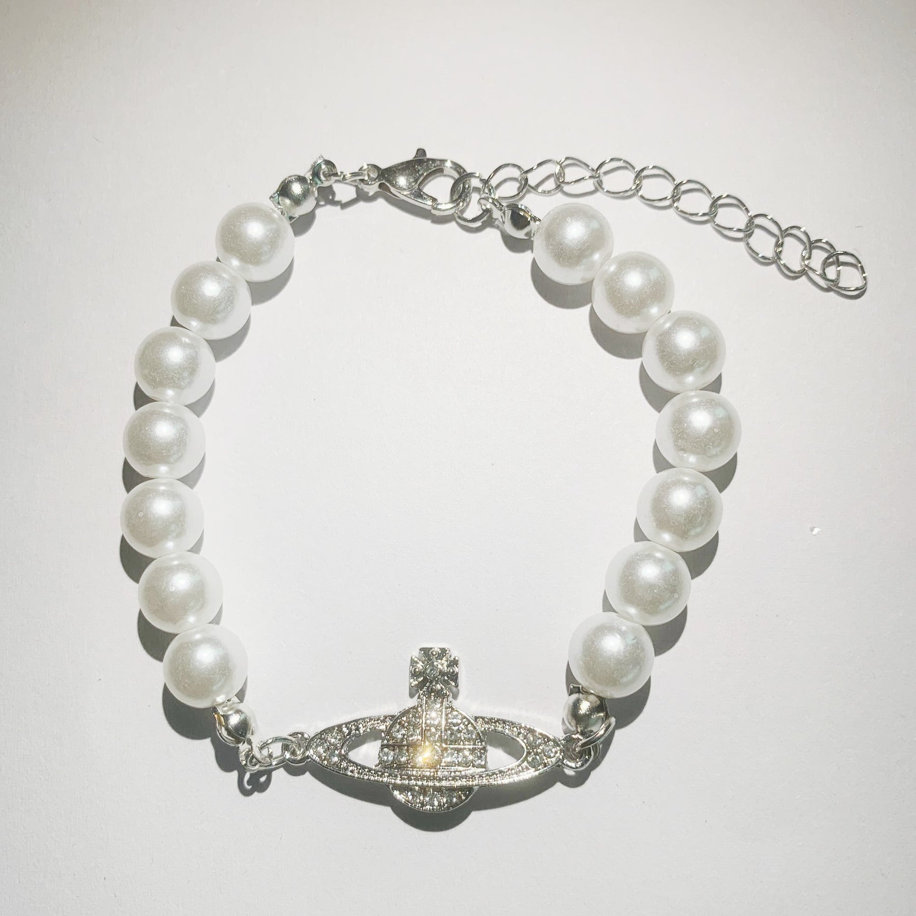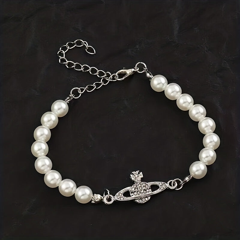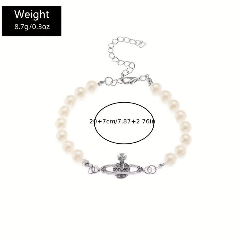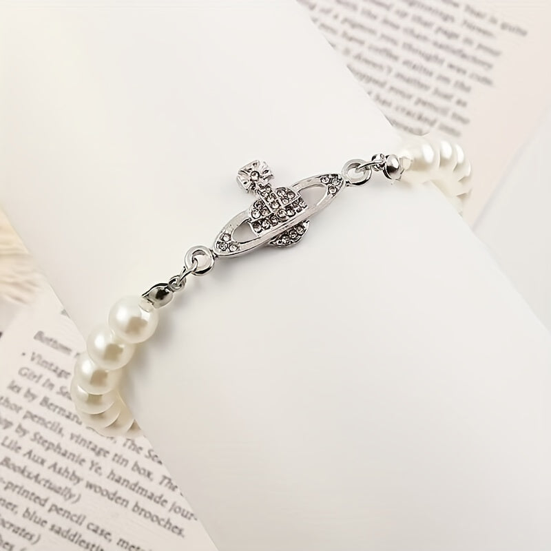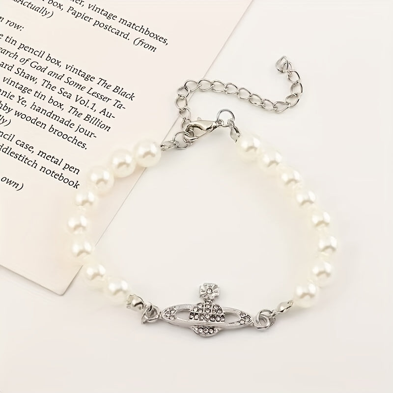 Add a touch of fantasy with this elegant bracelet featuring a Saturn pendant adorned with sparkle rhinestones and a faux pearl. It makes a perfect hand jewelry gift for ladies.
