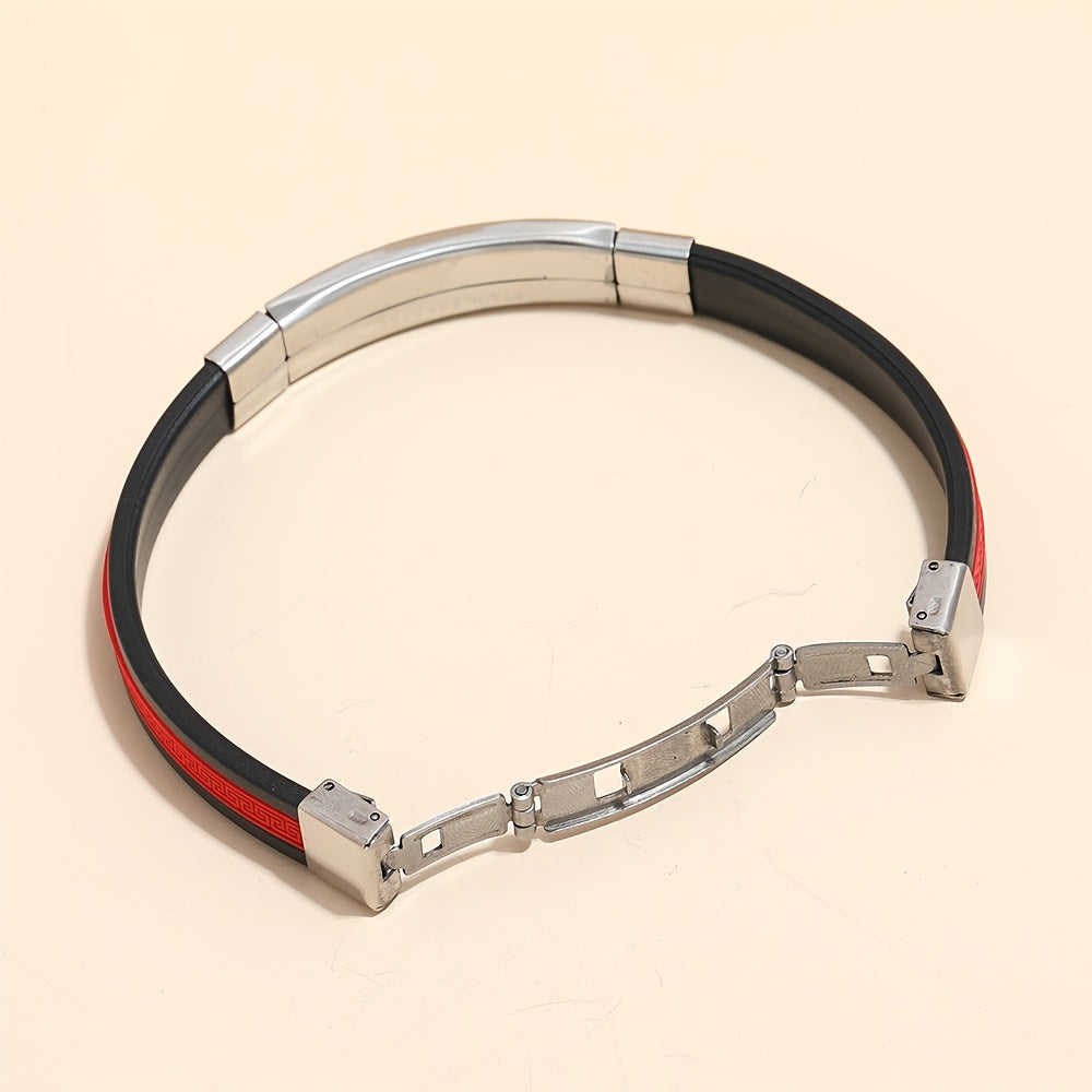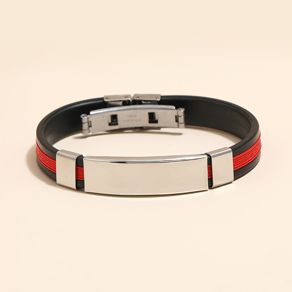 This stylish wristband bracelet features a blend of stainless steel, silicone, and leather for a modern and masculine look.