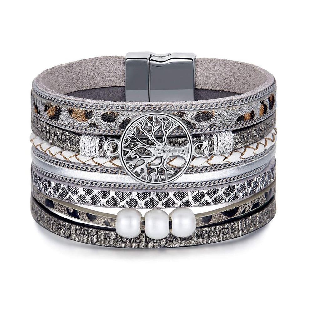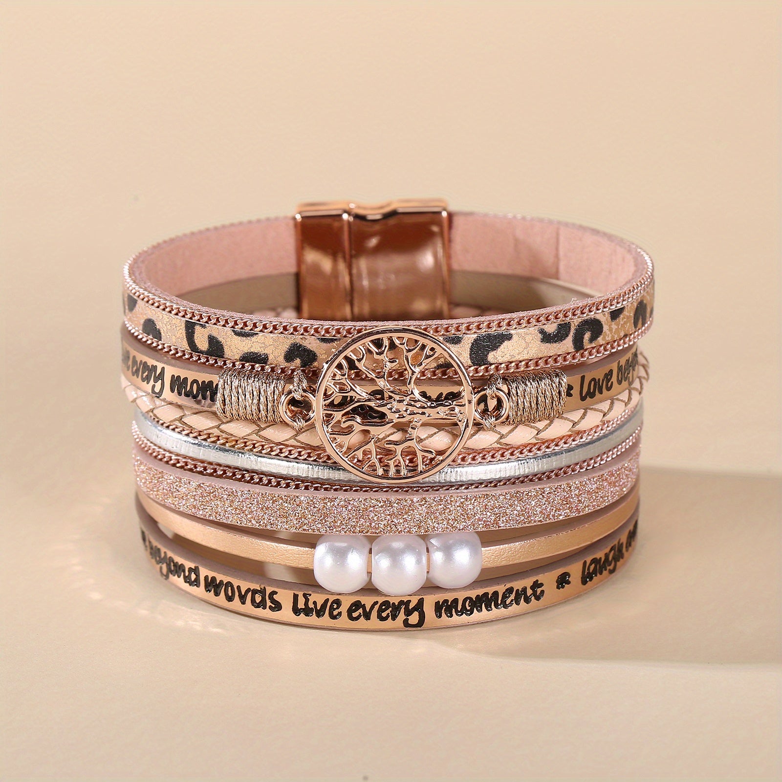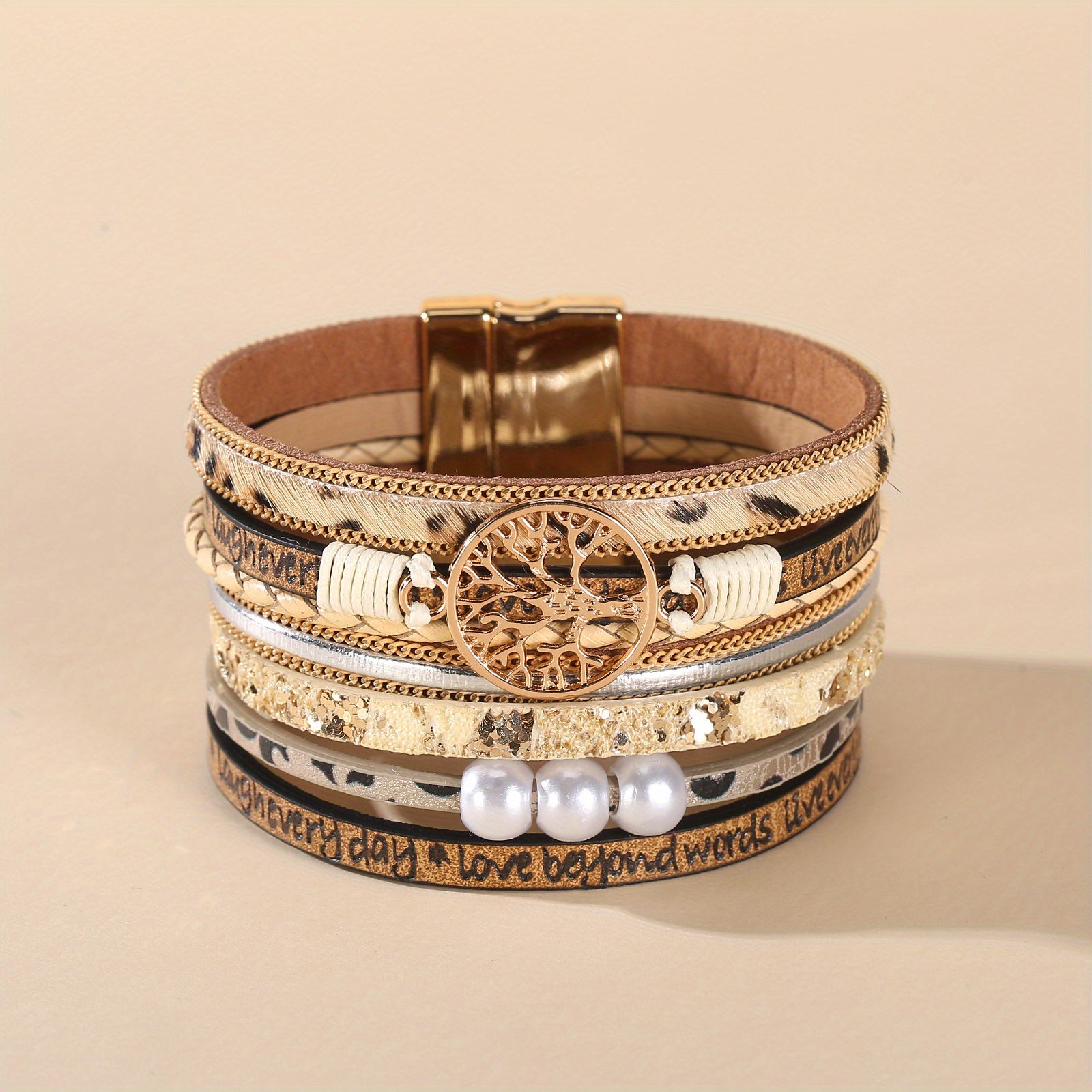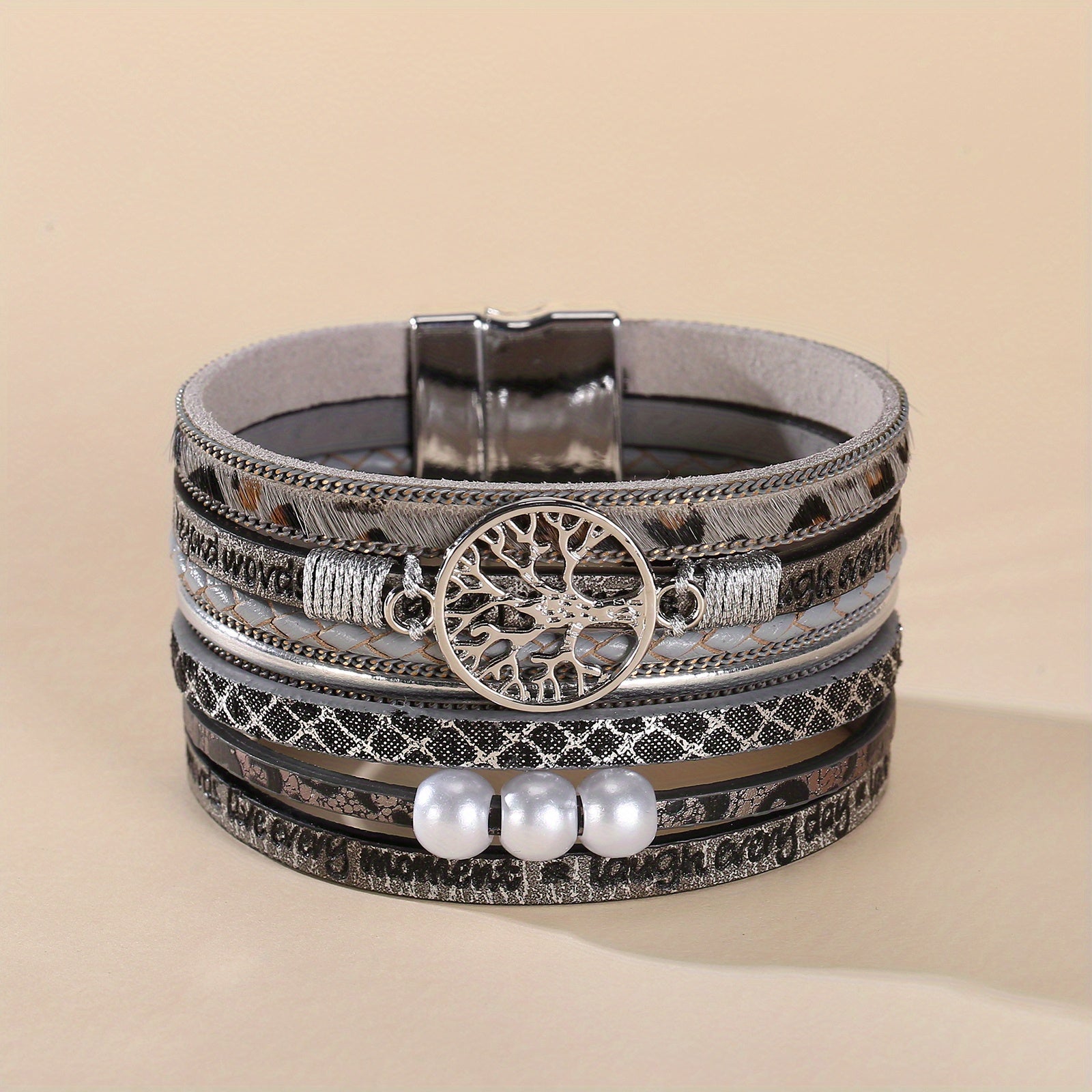 Tree Of Life Print Alphabet Pearl Magnetic Buckle Leather Bracelet