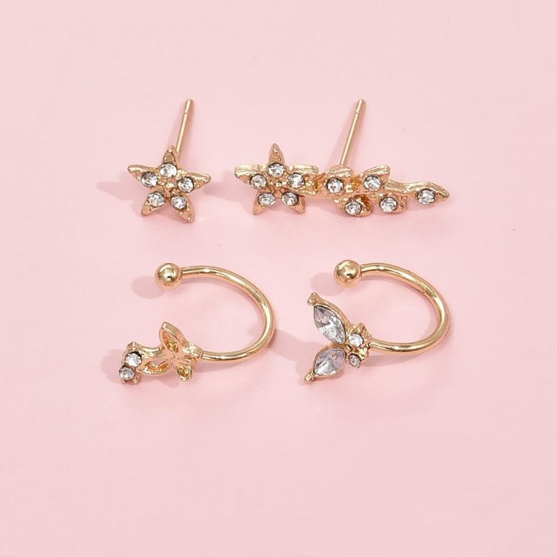 Enhance your style with this set of 4 creative crystal earrings. Perfect for non-pierced ears, featuring butterfly, star, and leaf designs.