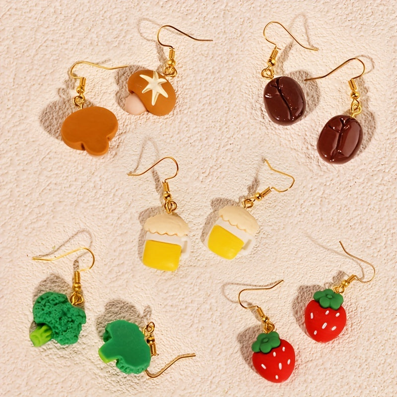 Adorn your ears with these quirky earrings featuring beer, broccoli, strawberry, and mushroom designs. Perfect for adding a touch of fun to your outfit!