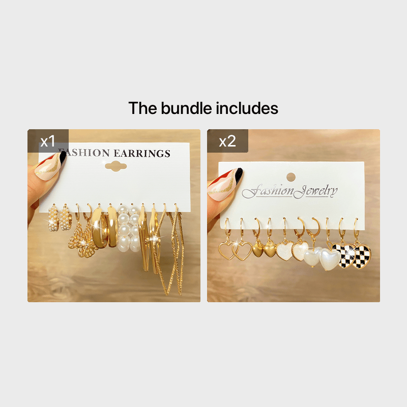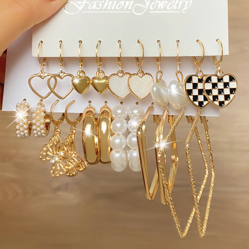 This elegant earring set includes butterfly, heart, pearl, square, and geometric designs.