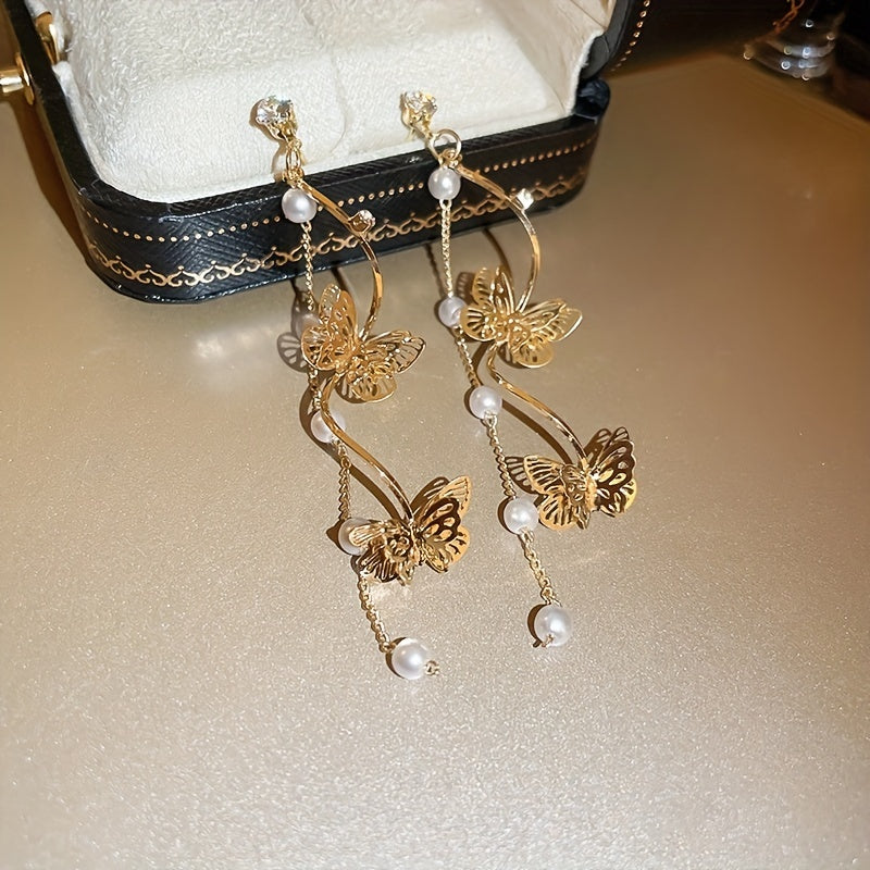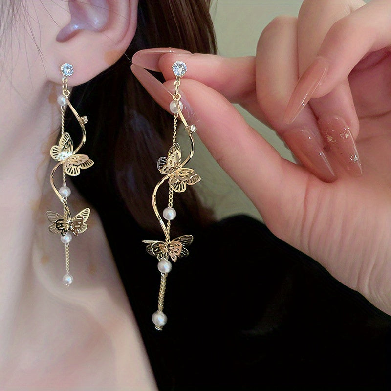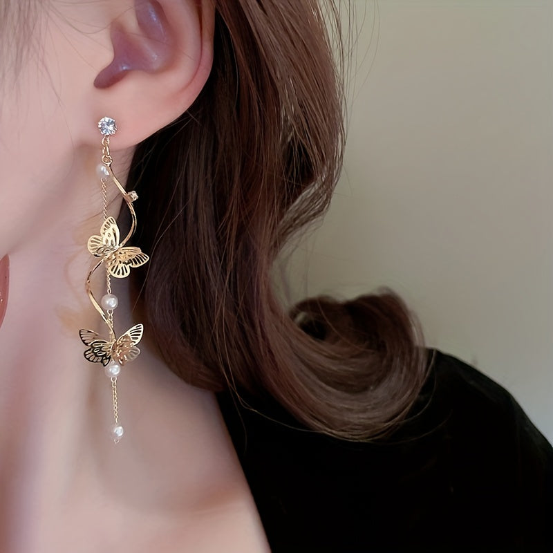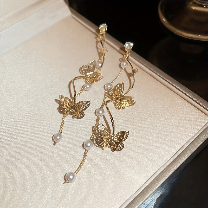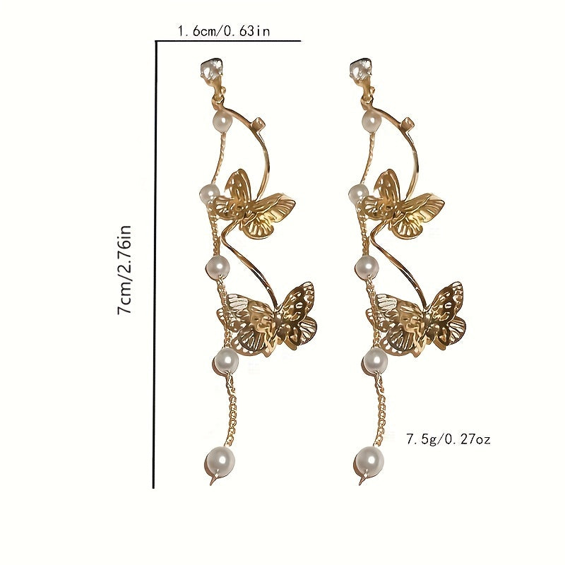 These stunning earrings feature a butterfly design with faux pearls and long tassel accents. The faux crystal and geometric details add a touch of elegance to your look.