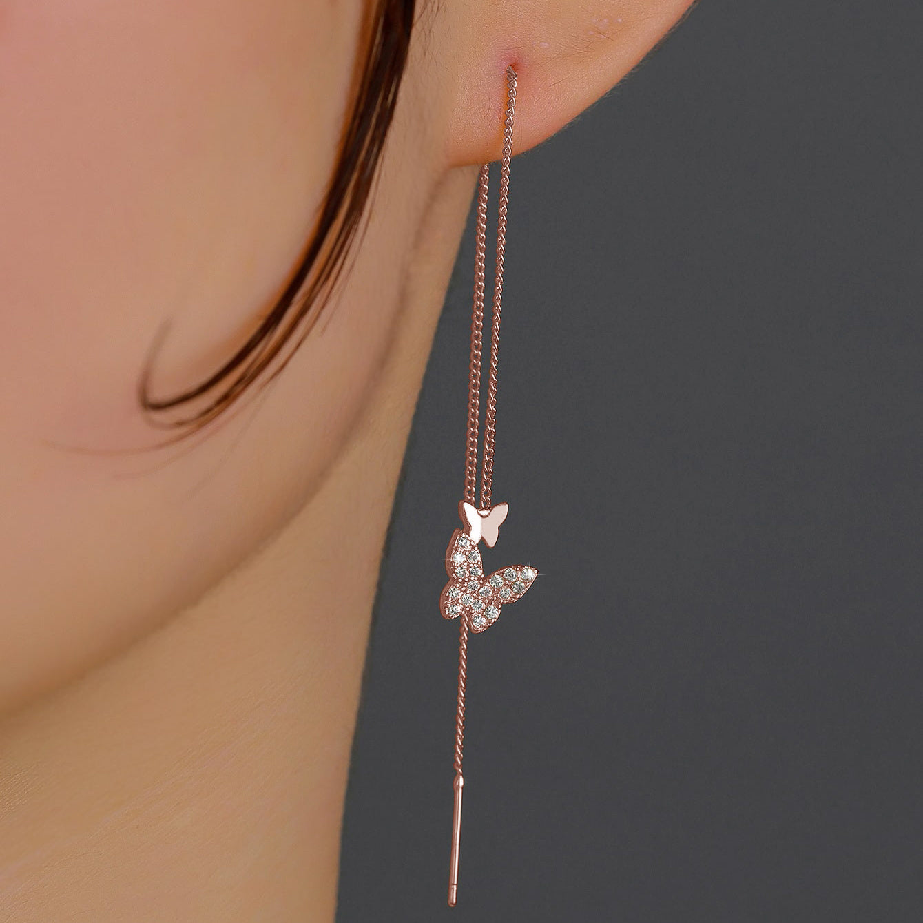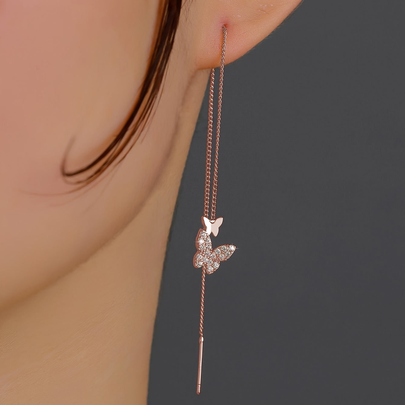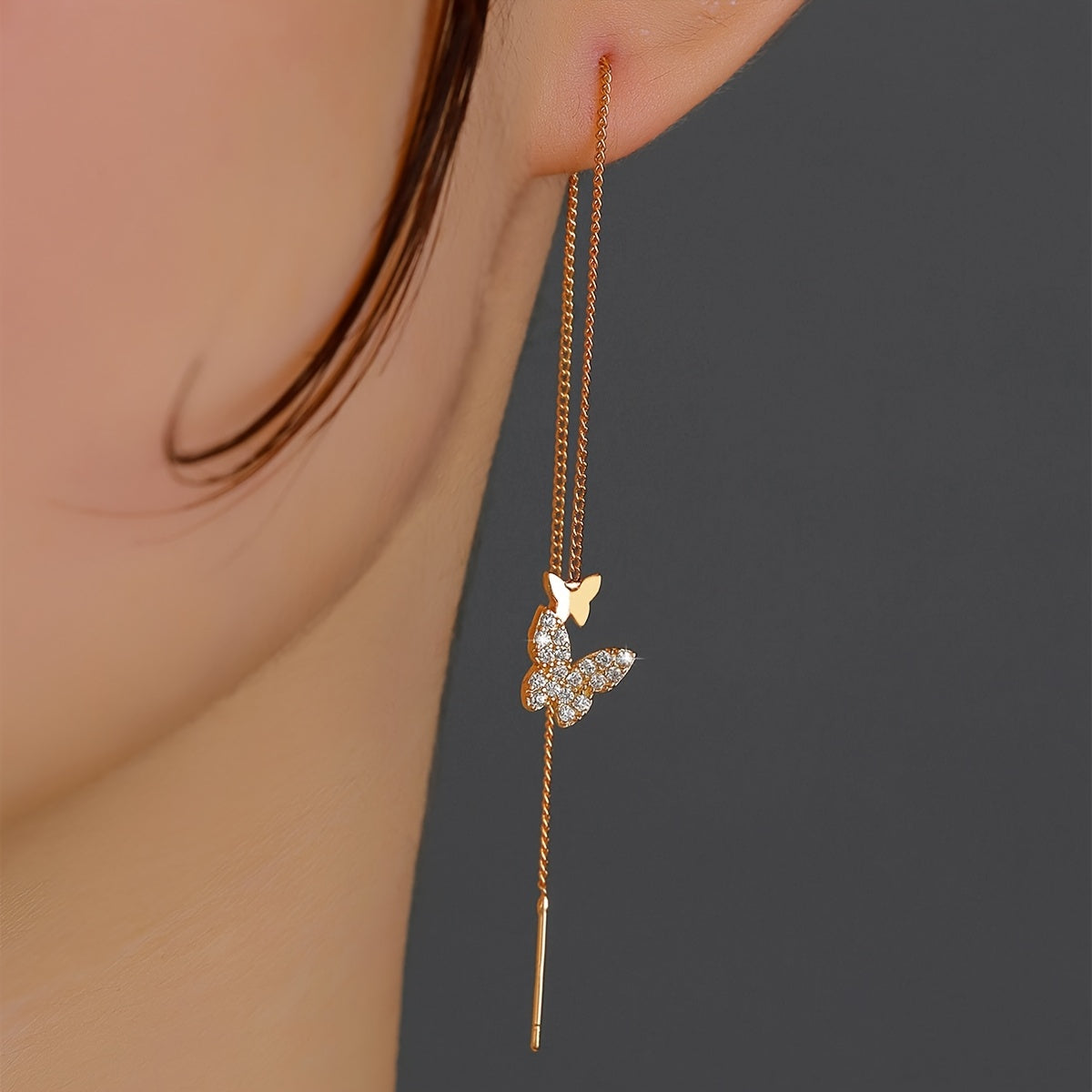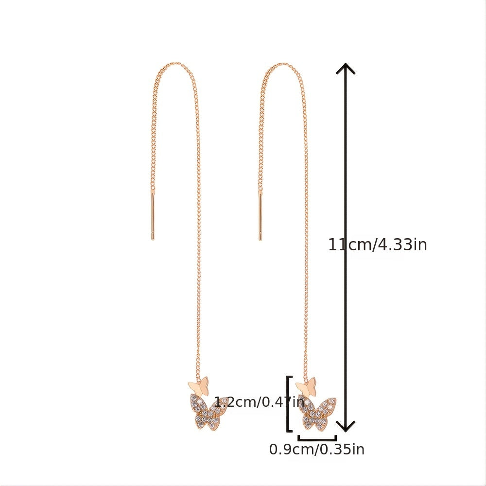 These elegant butterfly-shaped threader earrings feature zircon stones and a long chain design, making a stunning statement piece for any occasion.