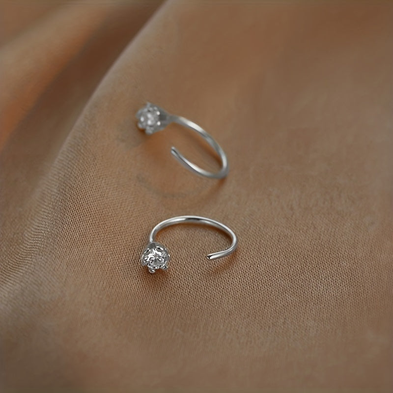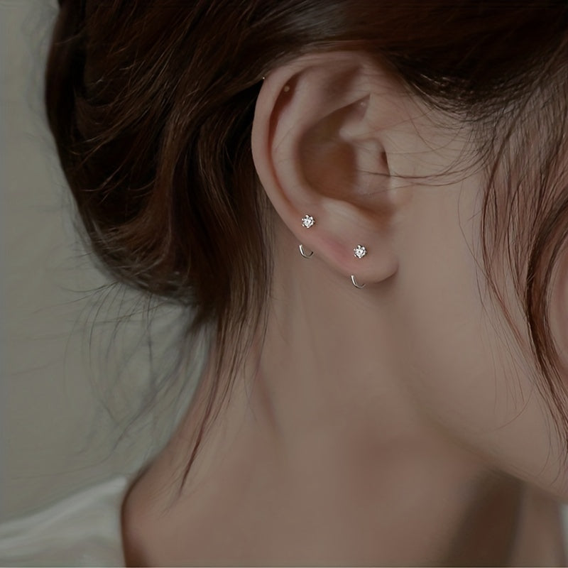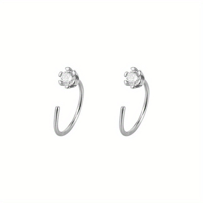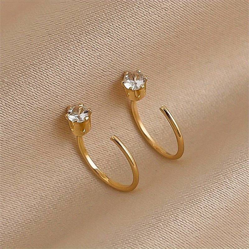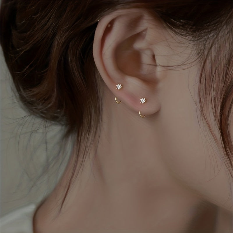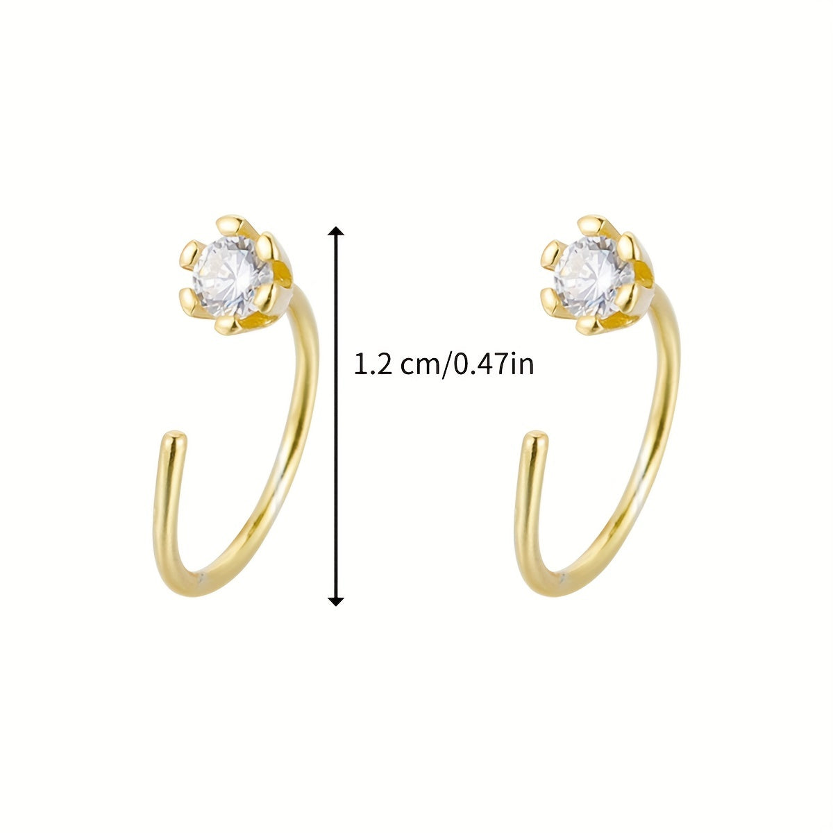 These elegant stud earrings are made of copper with 14K plating, featuring a C-shaped design with six claw-set zircon stones. They are hypoallergenic and perfect for everyday wear or special occasions. Makes a great gift for women.