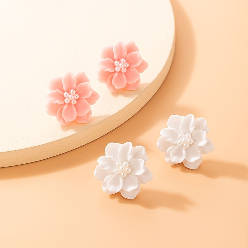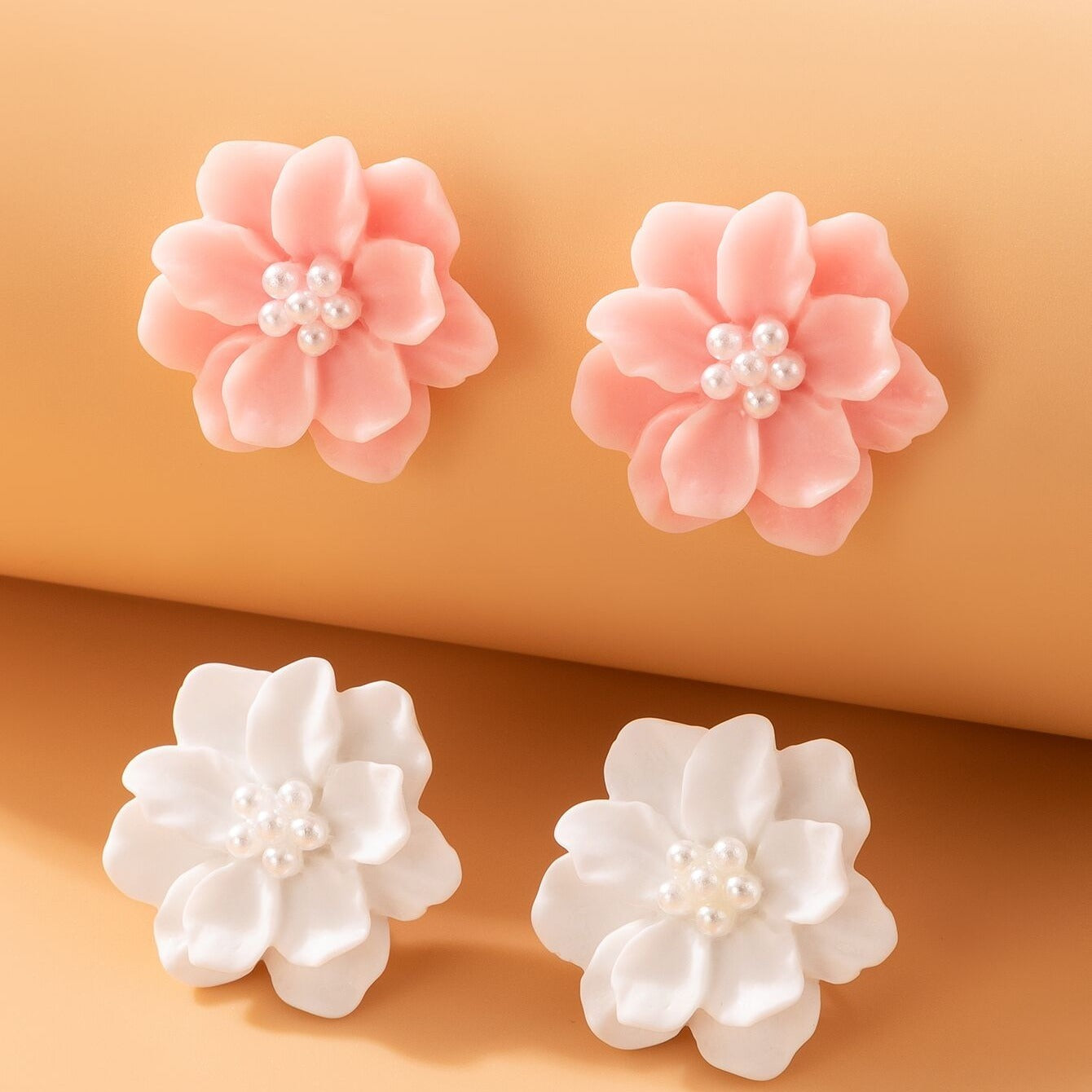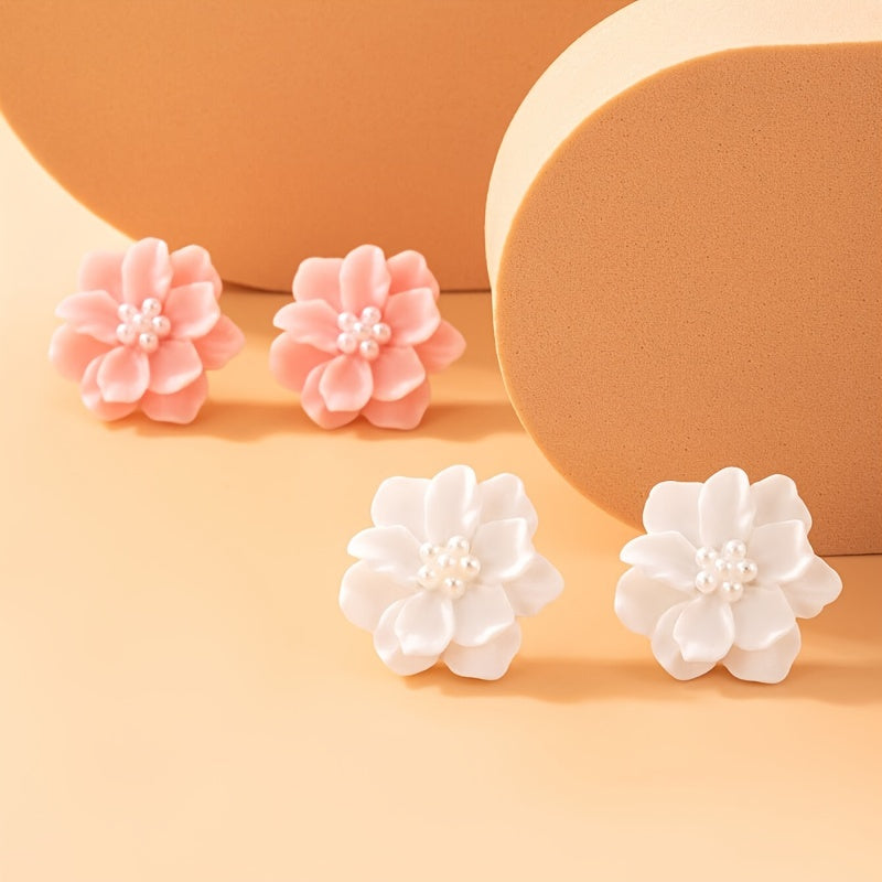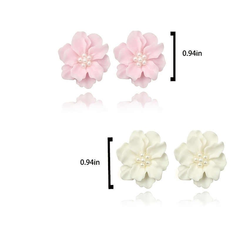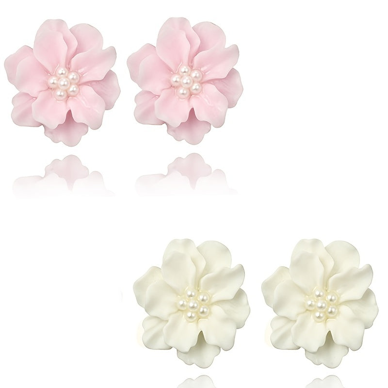 Camellia Stud Earrings 3D Flower Faux Pearl Ear Jewelry For Women