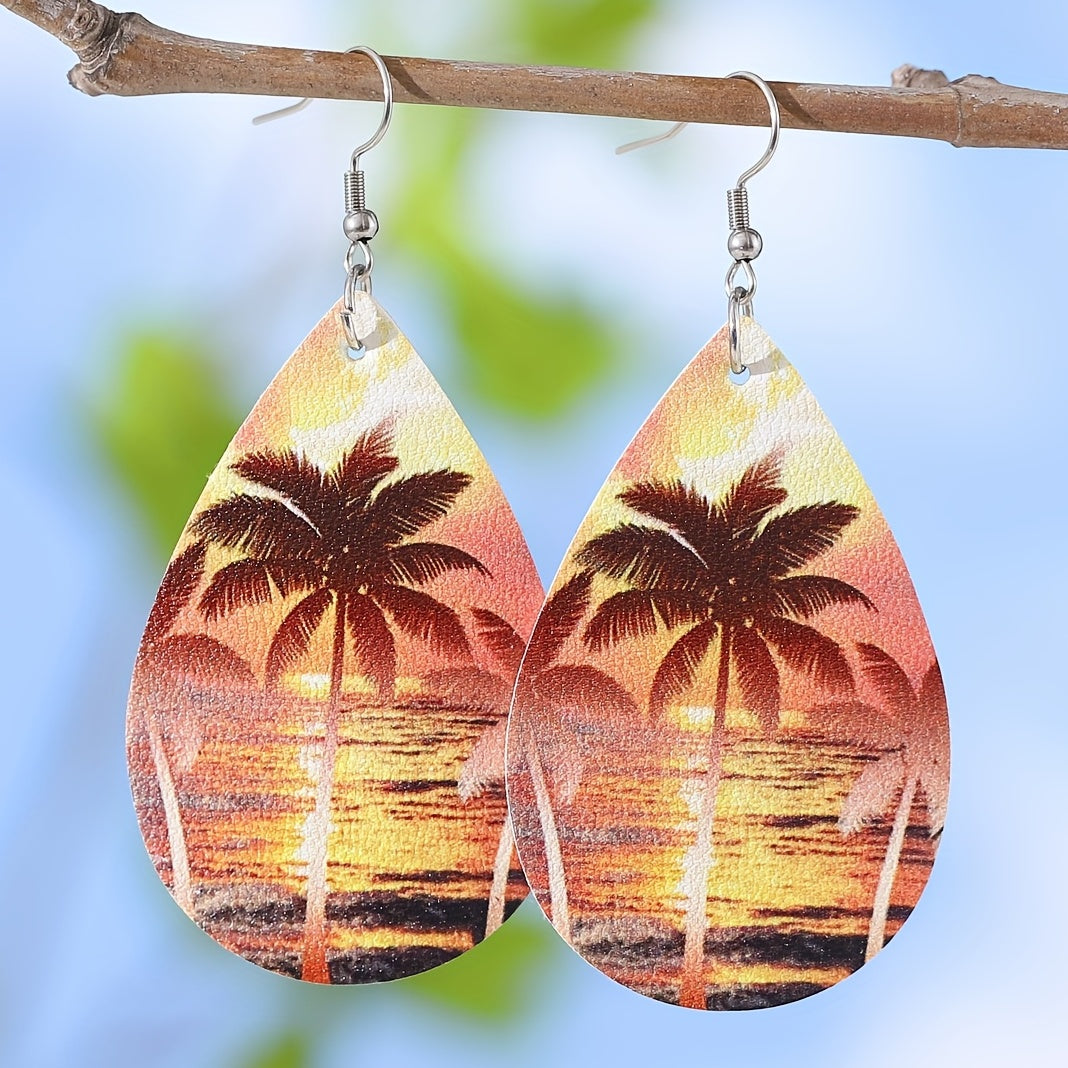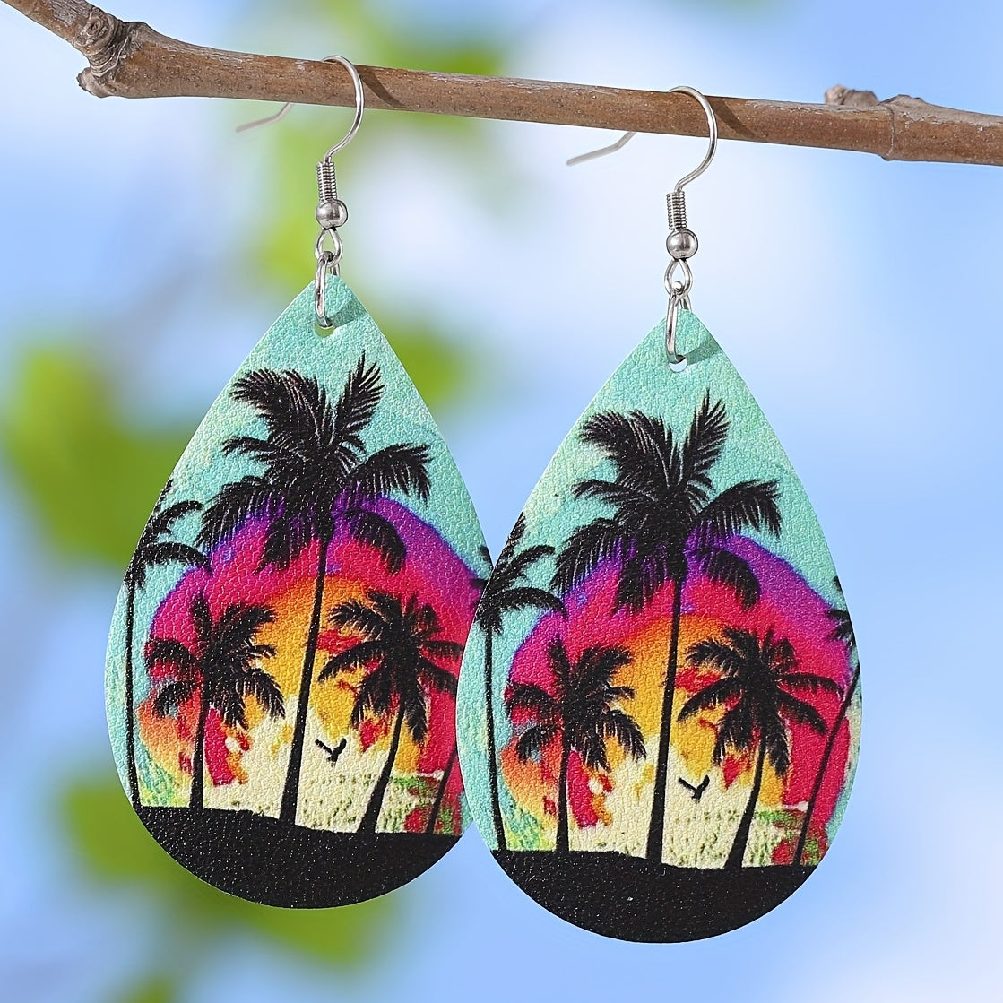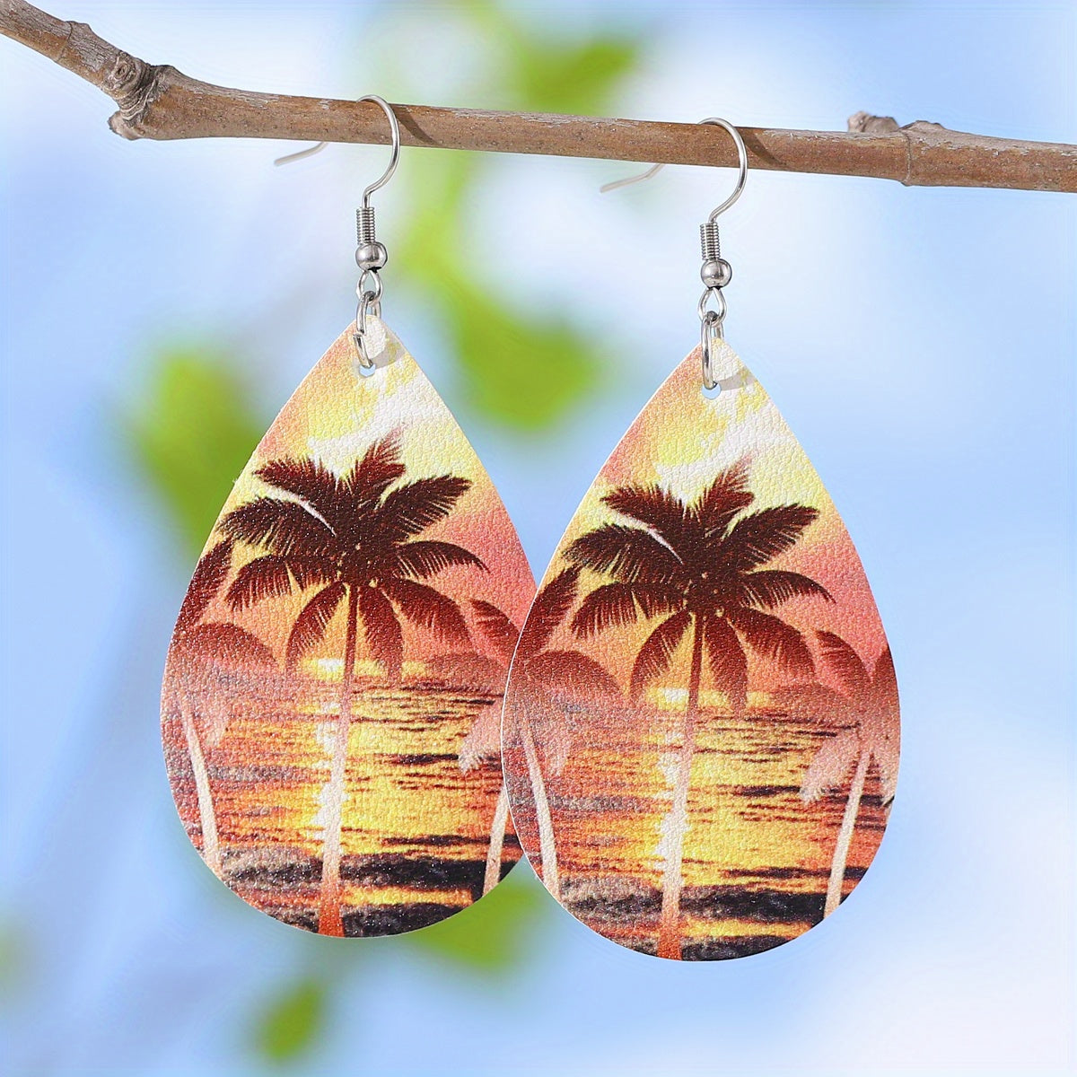 Coconut Tree Pattern Drop Hook Earrings PU Leather Ear Jewelry
