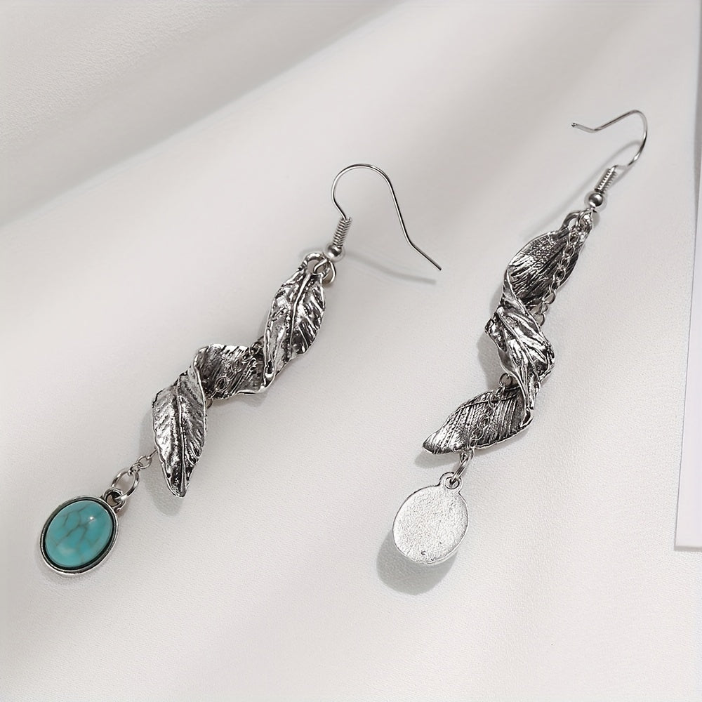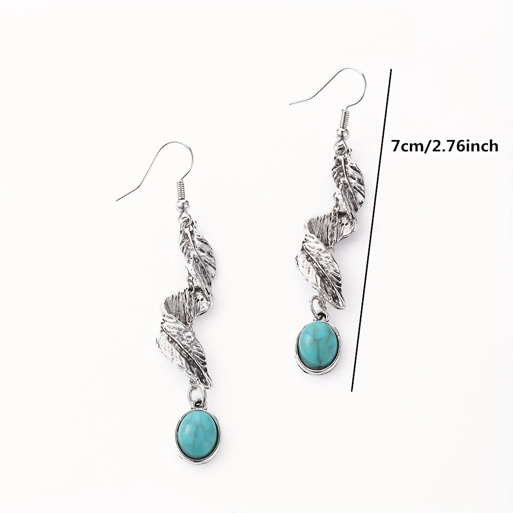These stylish dangle earrings feature spiral silvery leaf design with oval turquoise decor, making them a perfect gift for any female jewelry lover.