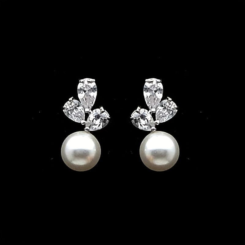 Elegant stud earrings featuring a faux pearl pendant with zircon decoration in a retro style design. Made of silver-plated metal, these earrings are perfect for weddings and special occasions.