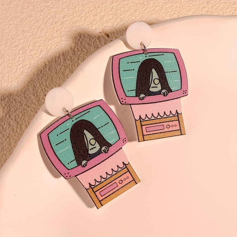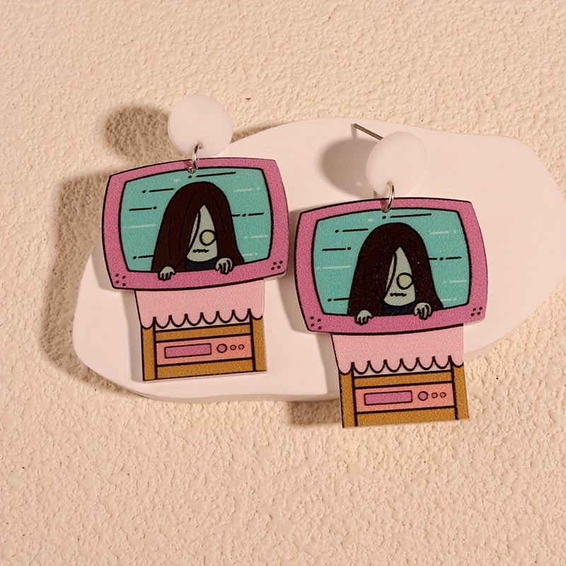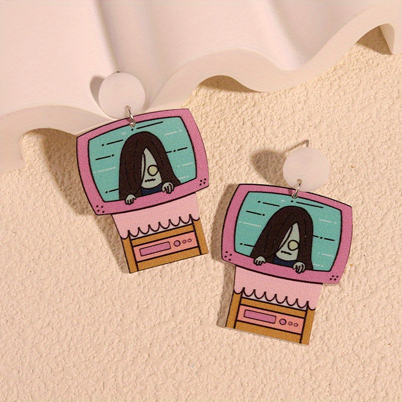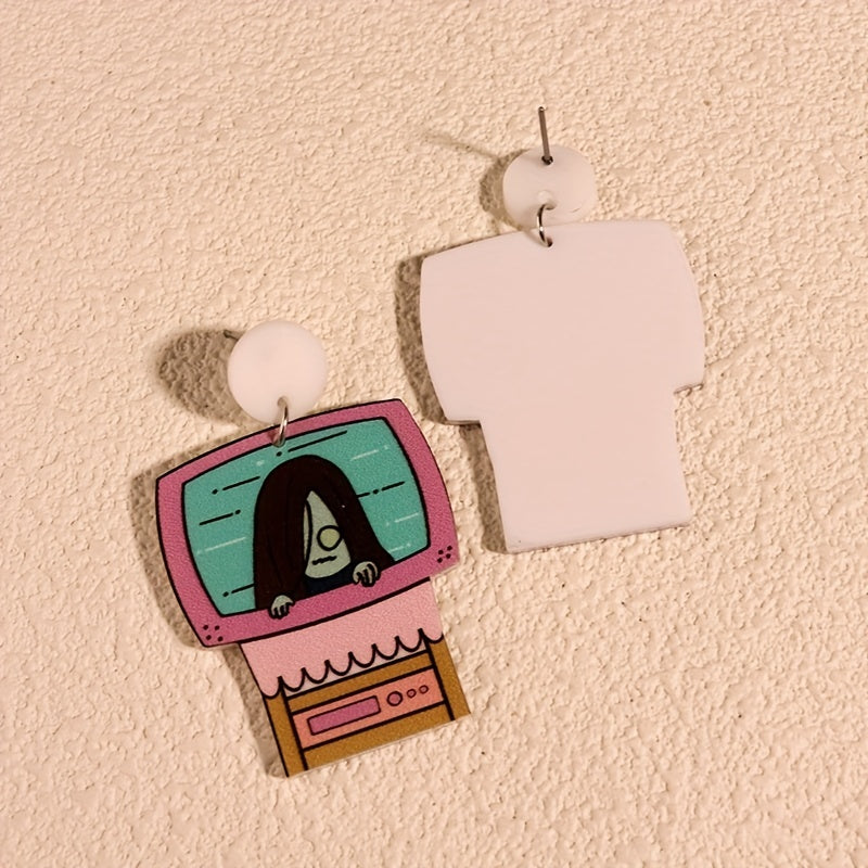 These spooky ghost television horror dangle earrings are perfect for women and girls who love unique accessories. Made from high-quality acrylic, these earrings make a great gift for any horror fan.
