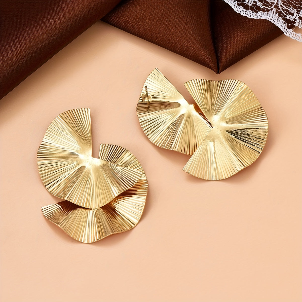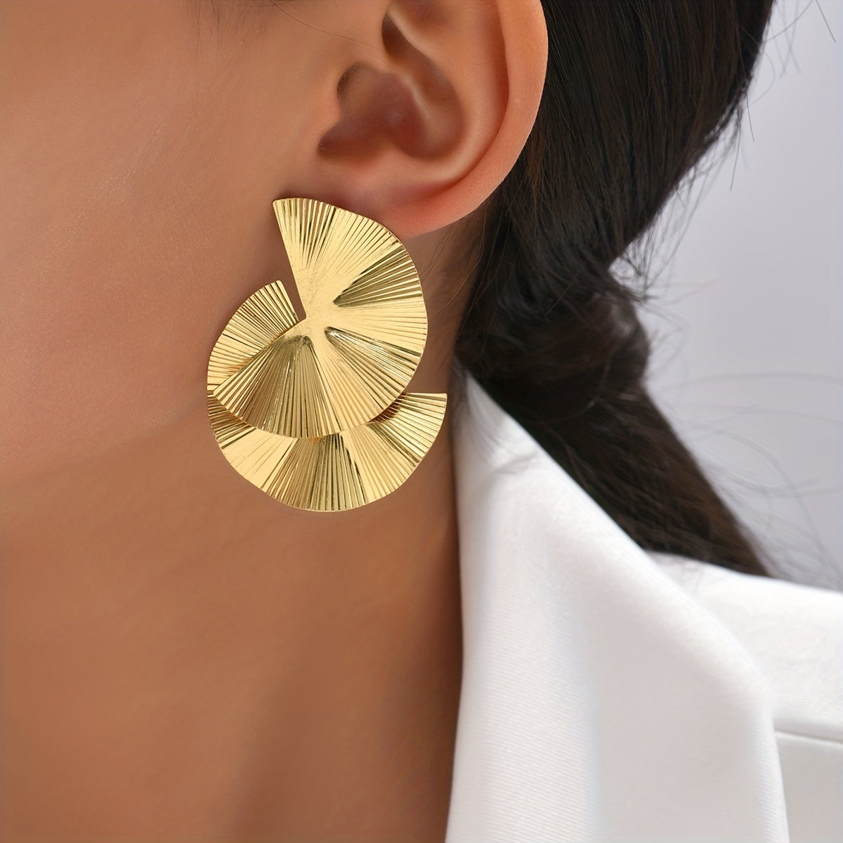 These stylish stud earrings feature a fan-shaped laser pattern design, making them a unique and creative jewelry piece. Crafted with 18K gold plating, these earrings are perfect for adding a touch of glamour to any outfit. They make a great gift for a special woman in your life.