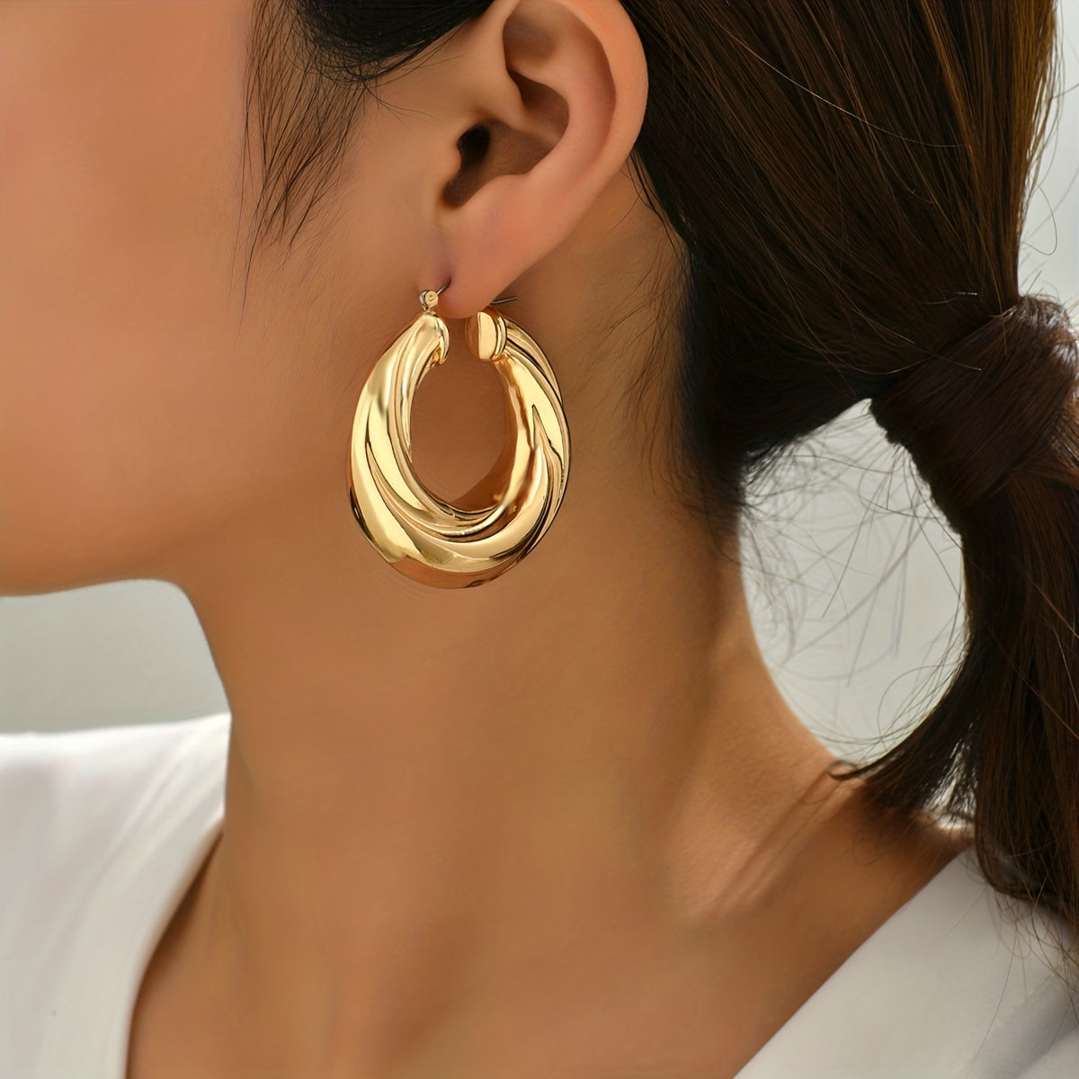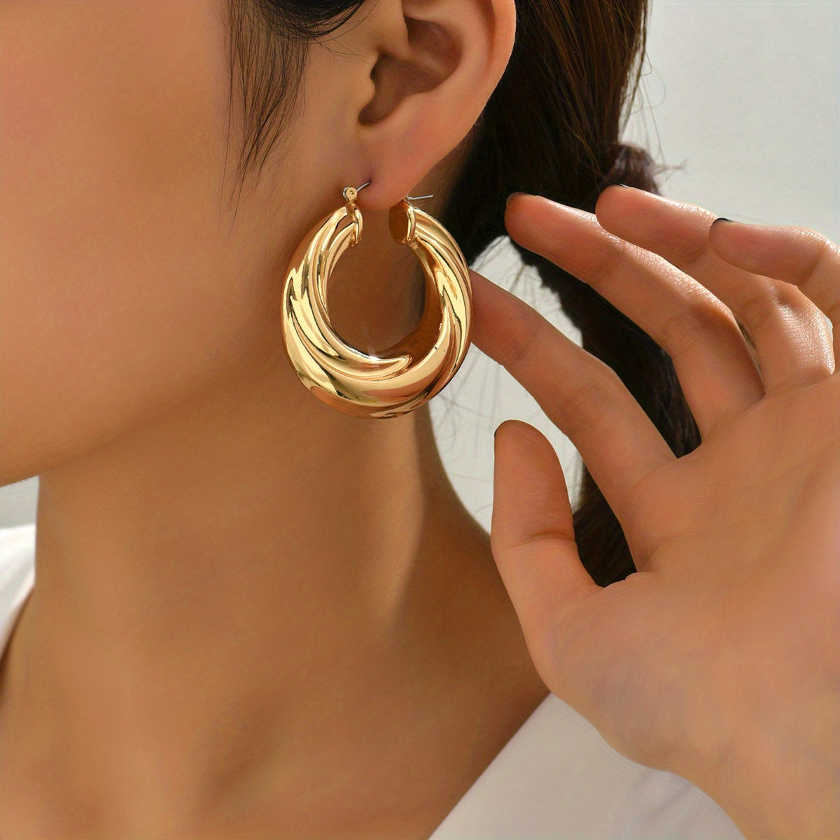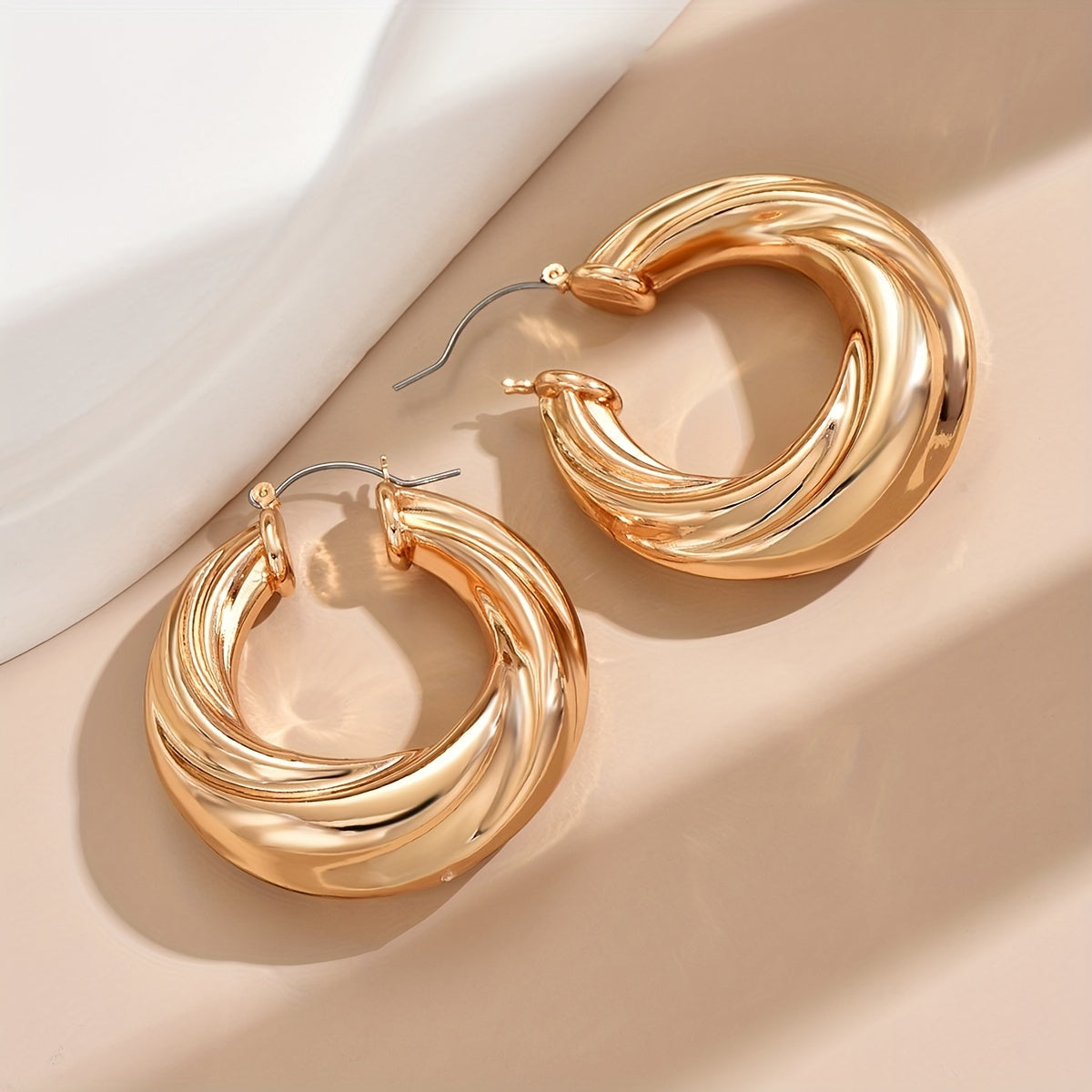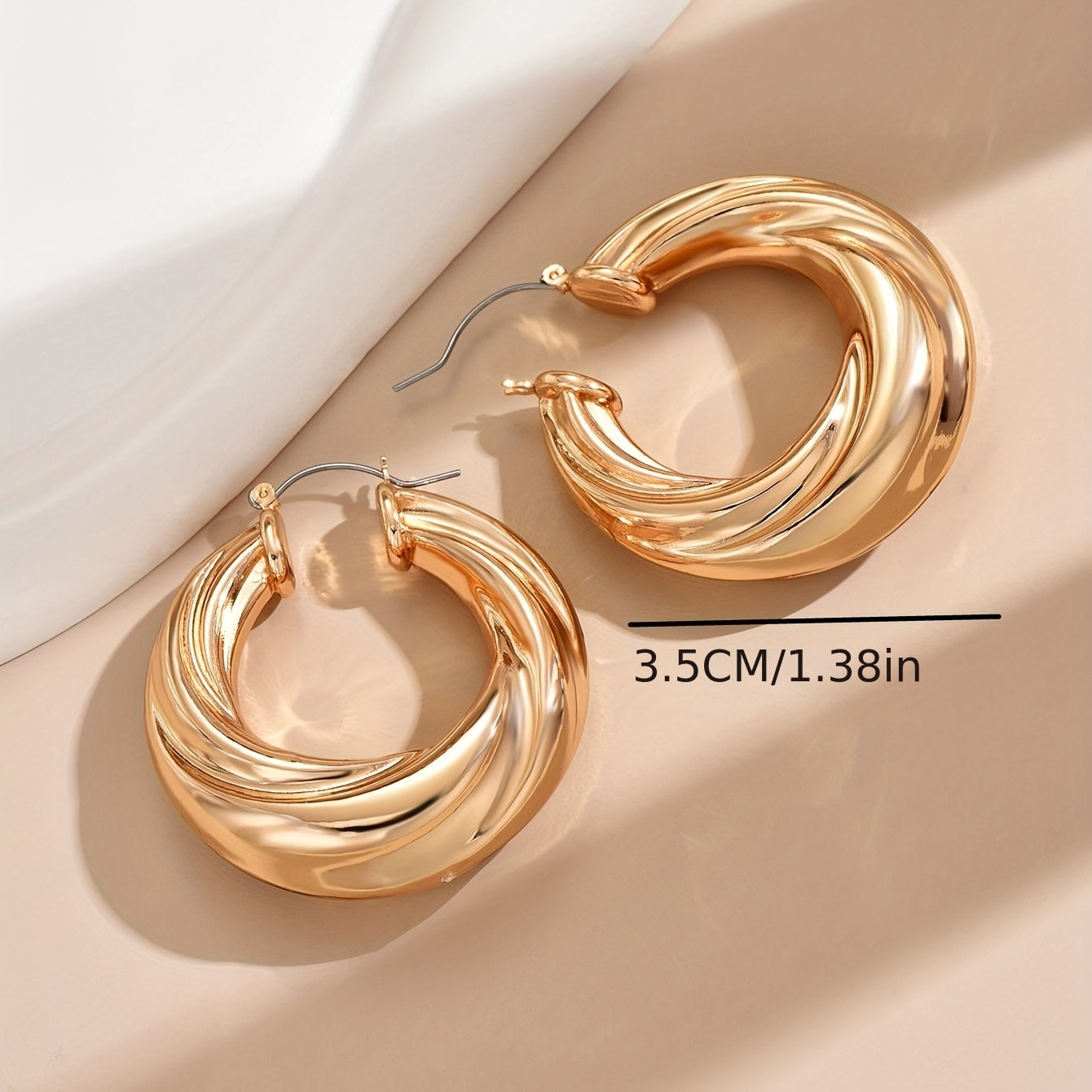 These chunky hoop earrings feature a stylish spiral pattern, making them versatile ornaments that can be worn with various outfits.