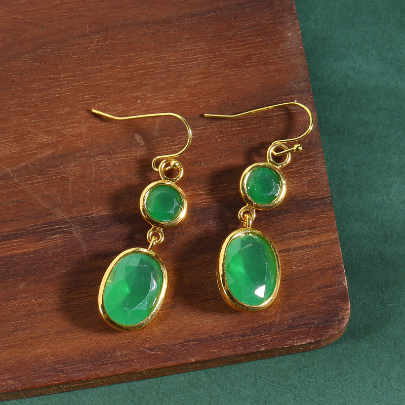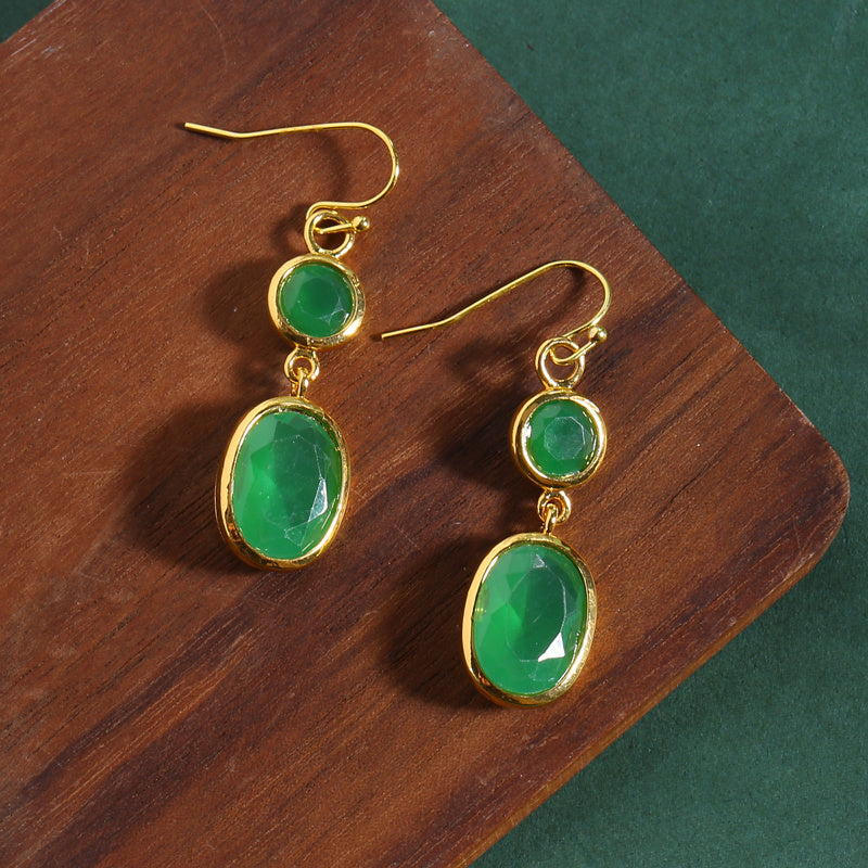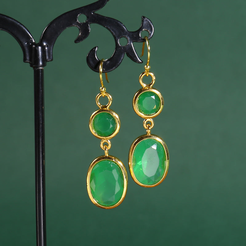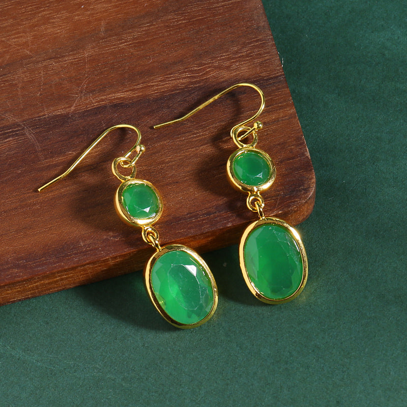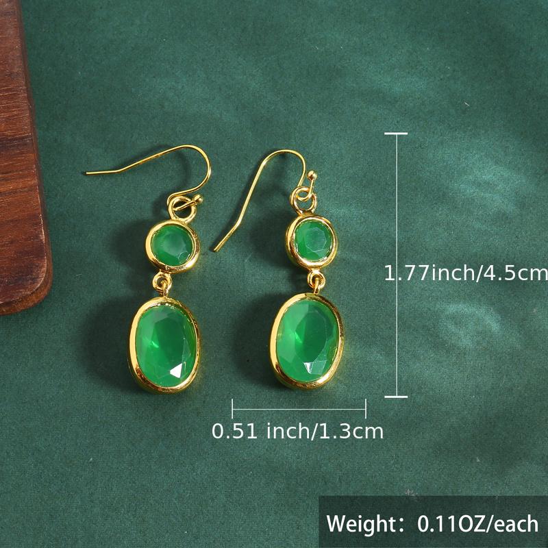 These elegant green oval cut drop dangle earrings are plated with 14K gold. They are perfect for enhancing any outfit and adding a touch of sophistication to your look.