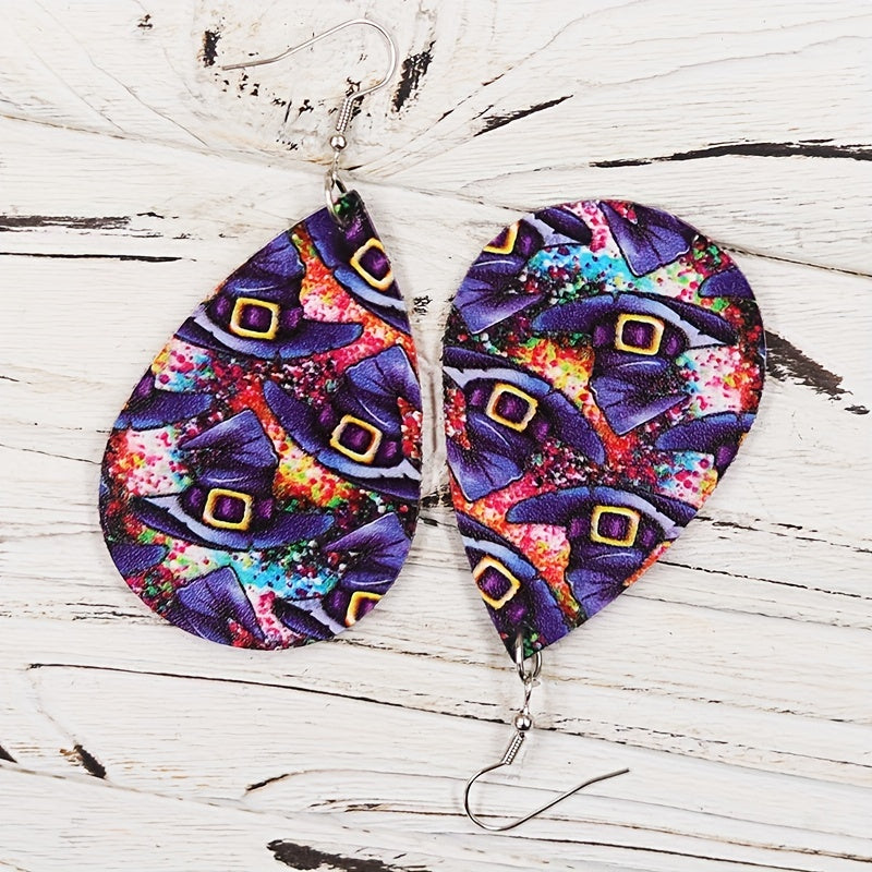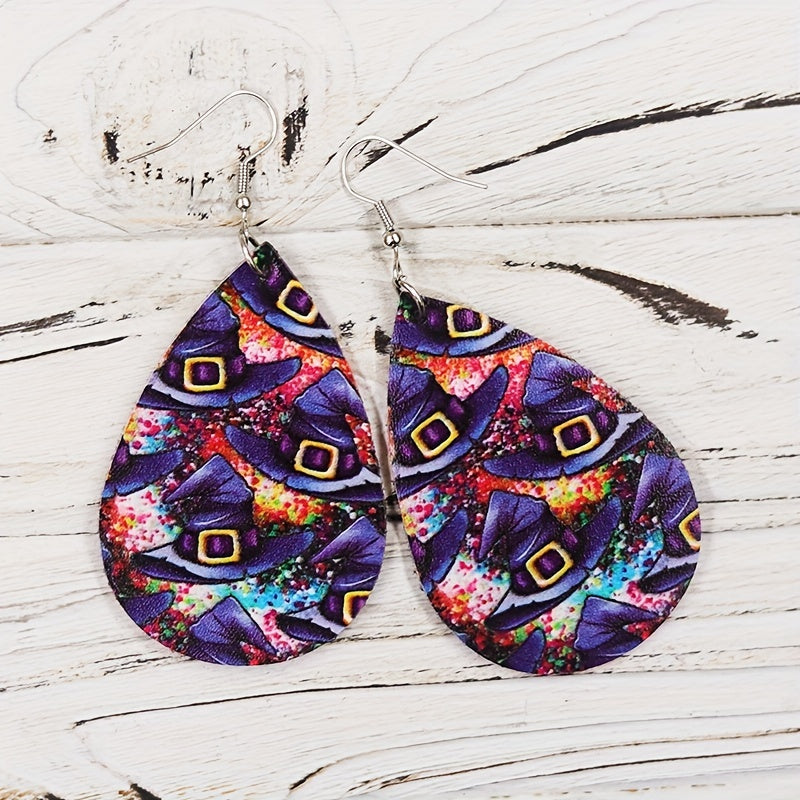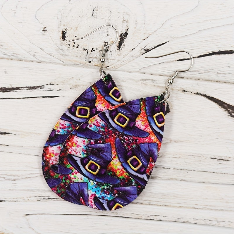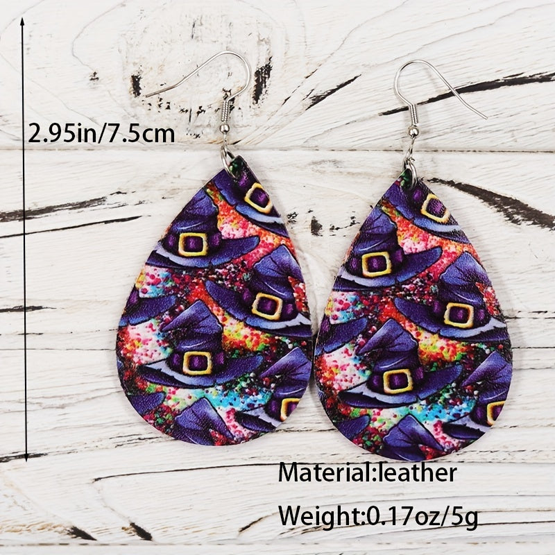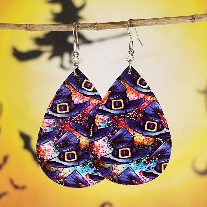 These teardrop dangle earrings feature a spooky witch's hat pattern, perfect for Halloween or vocation style. Made from high-quality PU leather, they make a great gift for females.