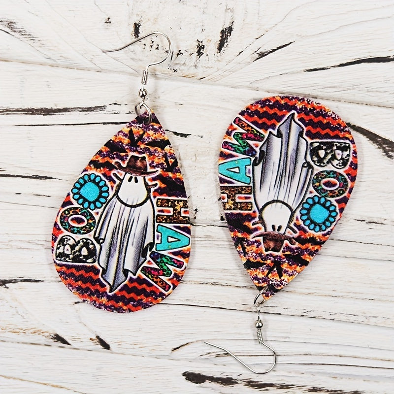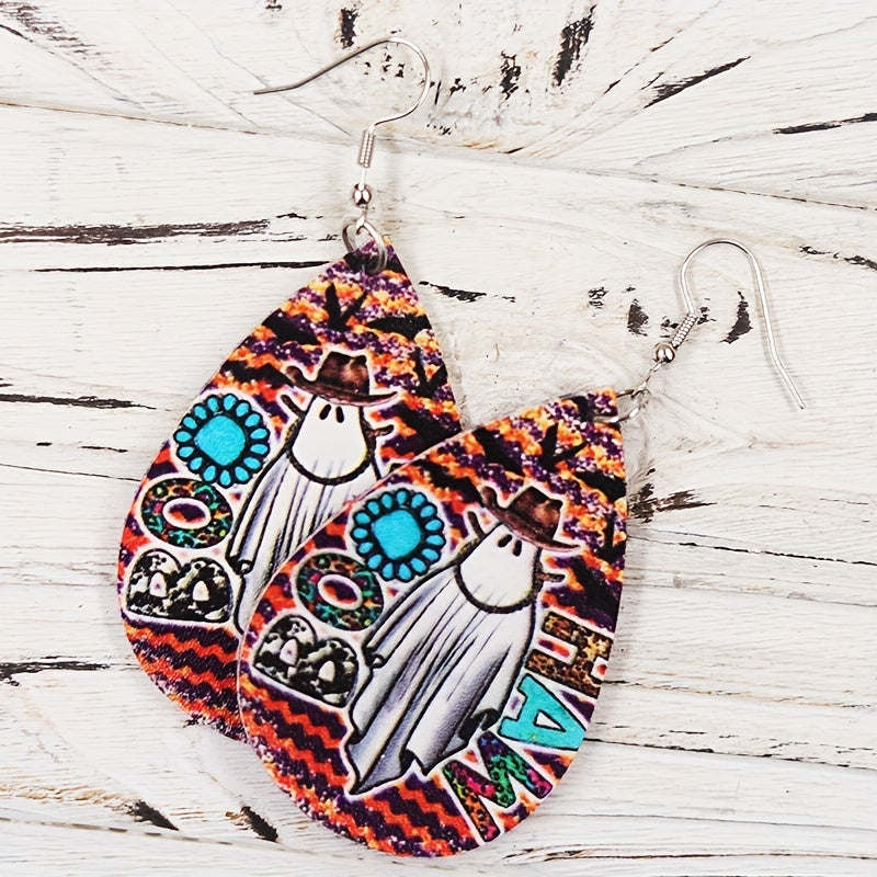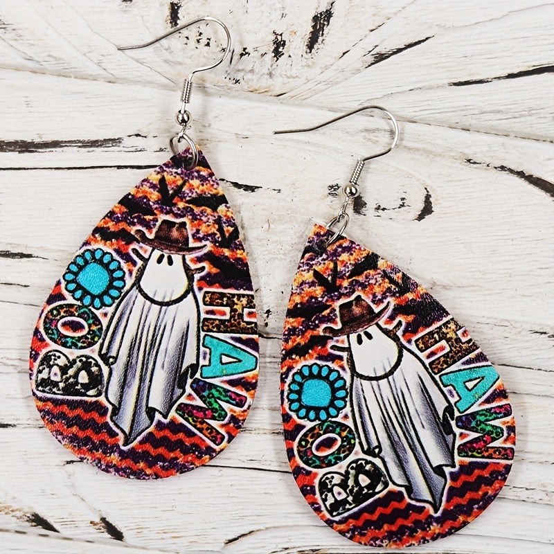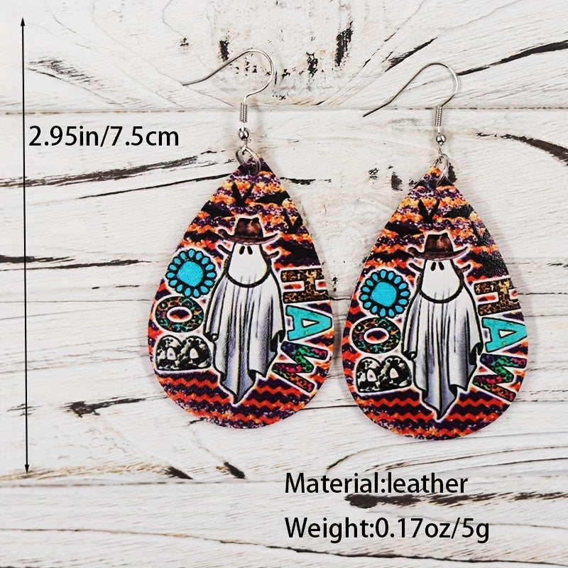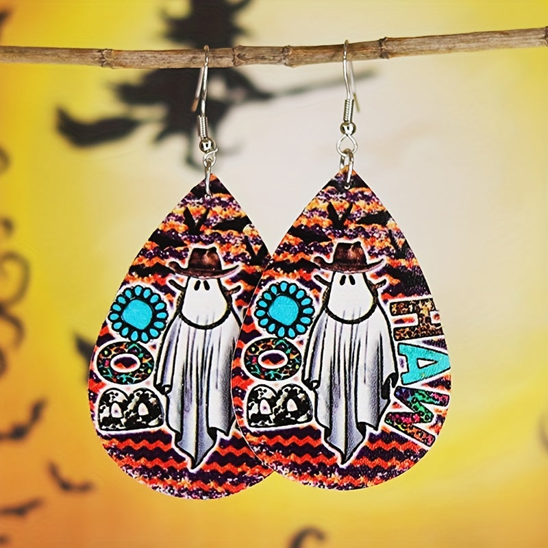 These spooky teardrop earrings feature a ghost cowboy hat and 'Boo' pattern, perfect for adding a vocation style touch to your Halloween outfit. Ideal as a gift for females who love Halloween.