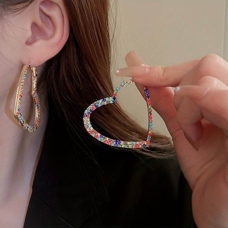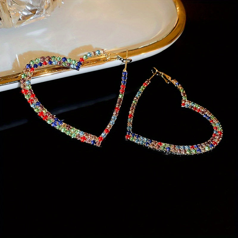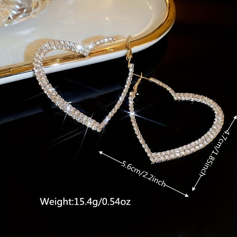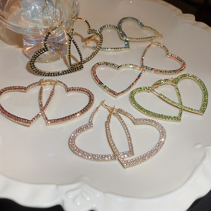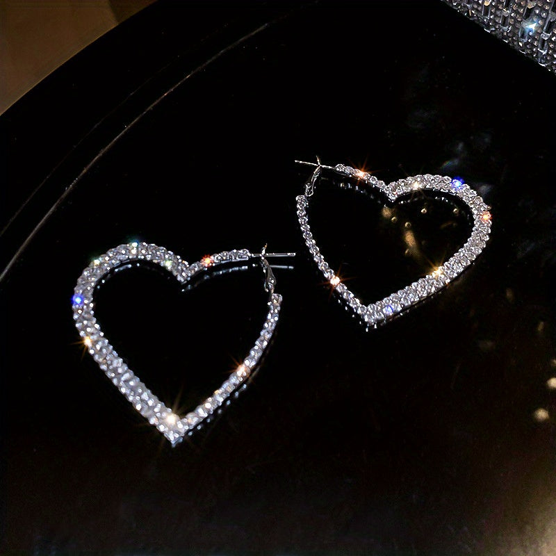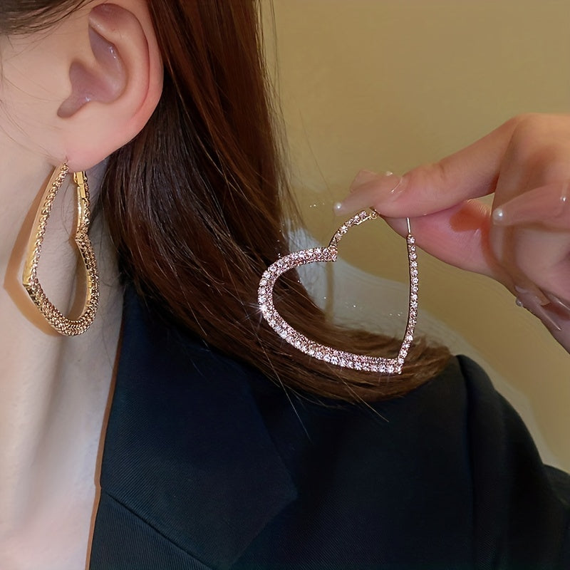Elegant hollow hoop earrings with exaggerated heart design, adorned with rhinestones. Crafted from high-quality alloy with 18K plating. Perfect jewelry gift for women.
