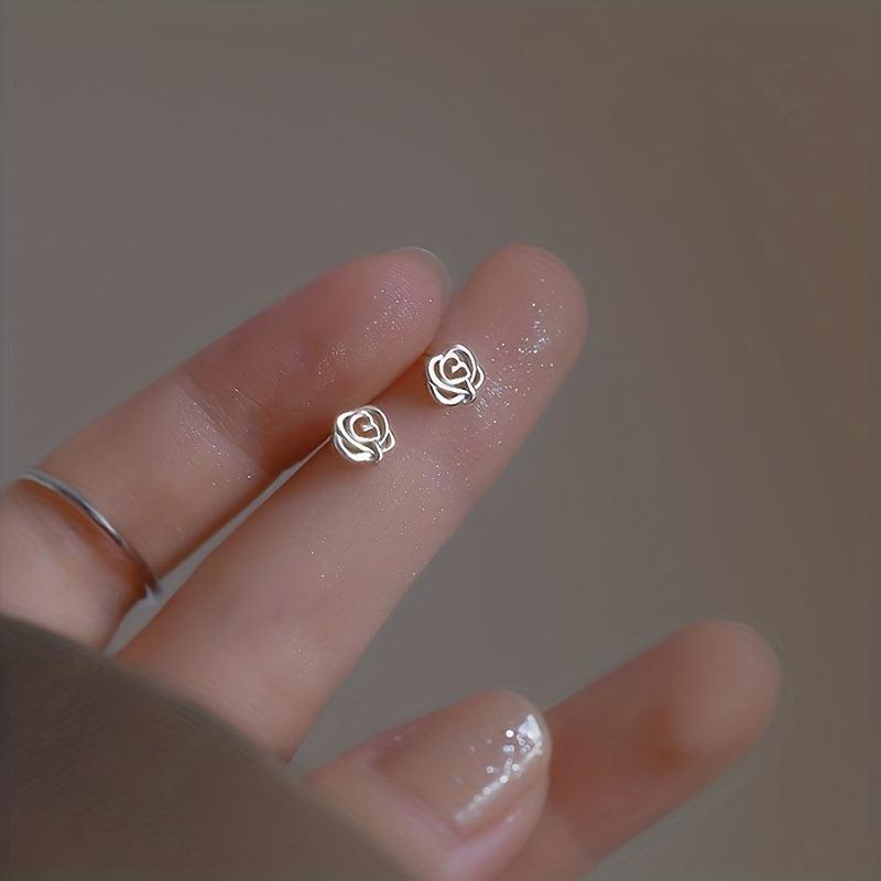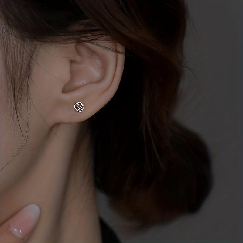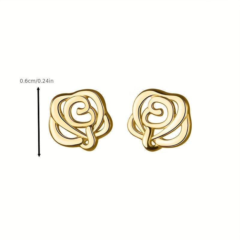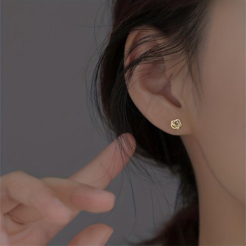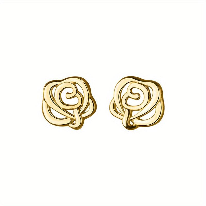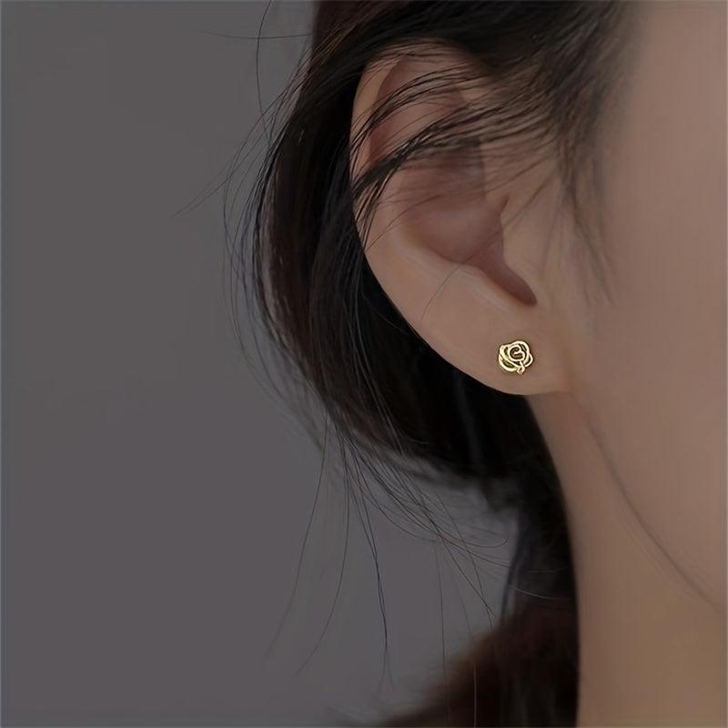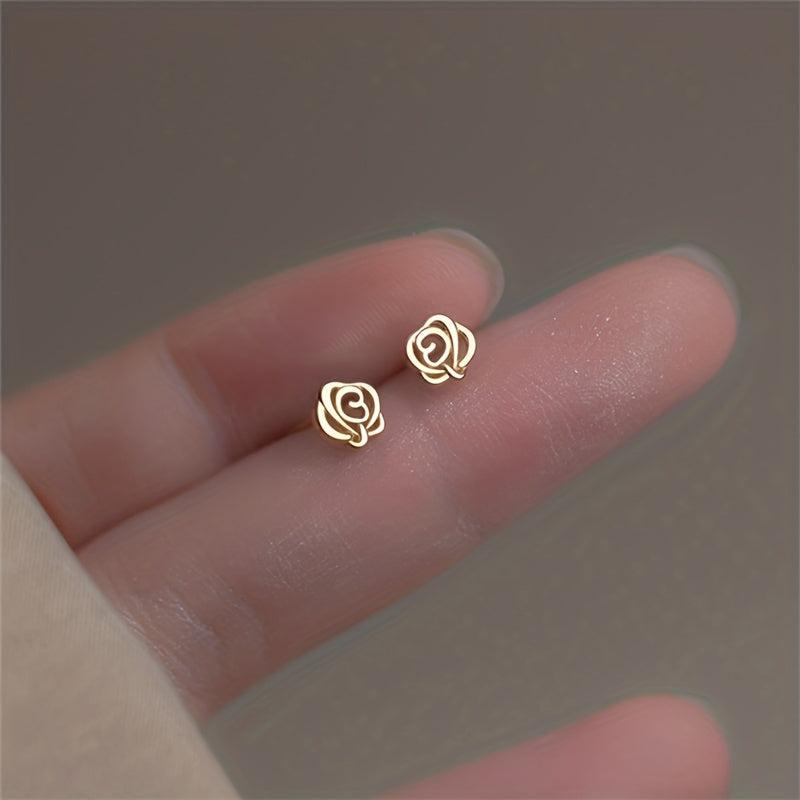 These delicate copper plated stud earrings feature a hollow rose flower design. Perfect for daily wear or as a thoughtful gift for a special woman.