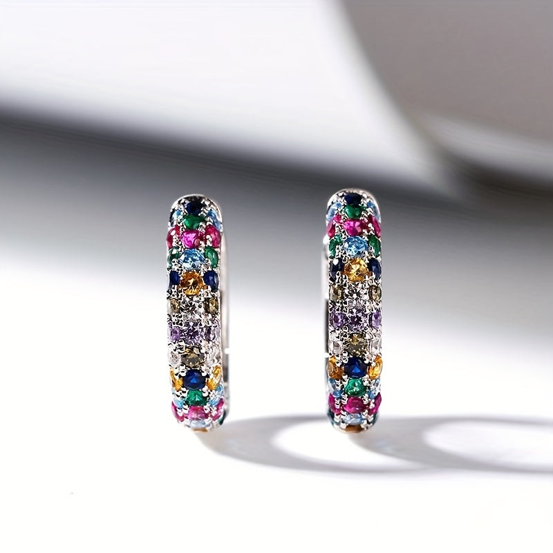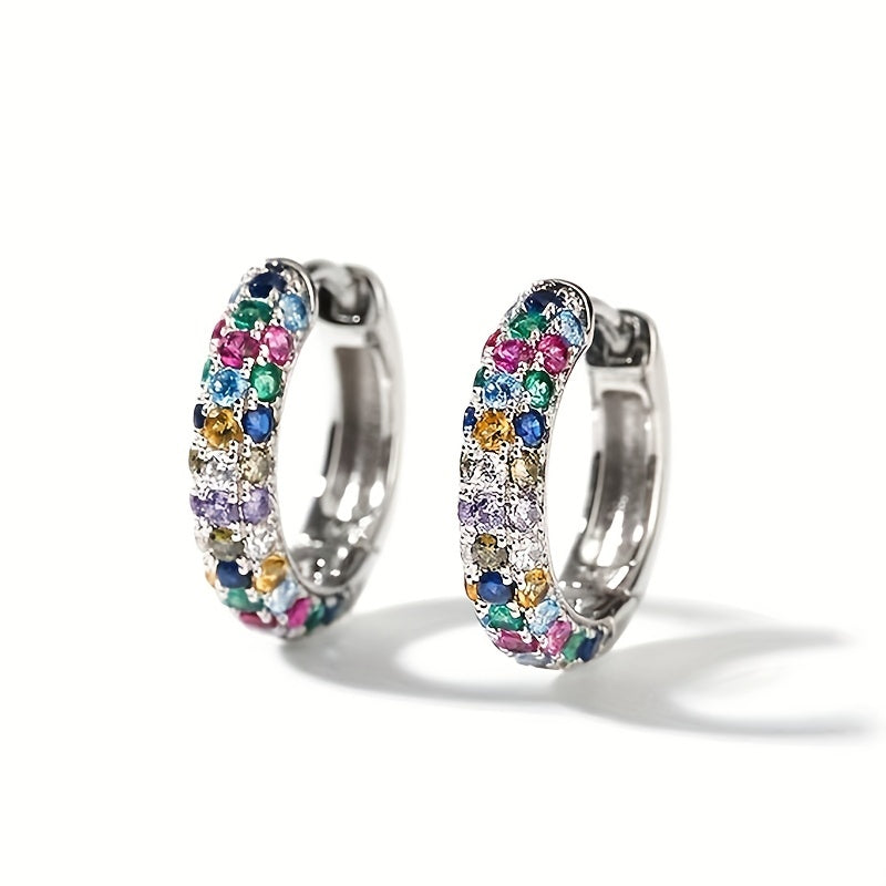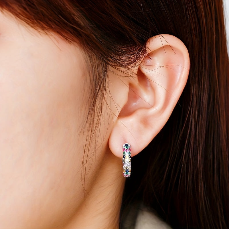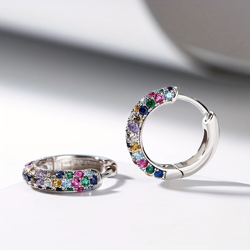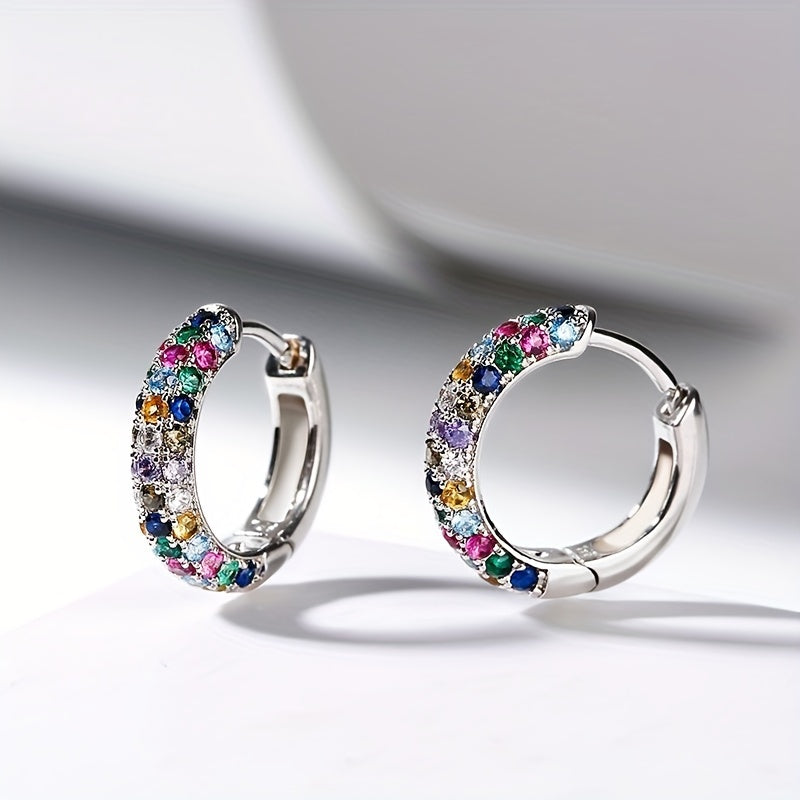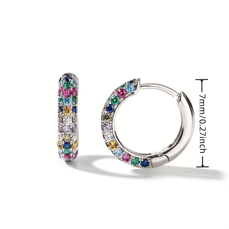 Men's Silver Plate Round Earrings Set with Colorful Zircon, Small Hoop
