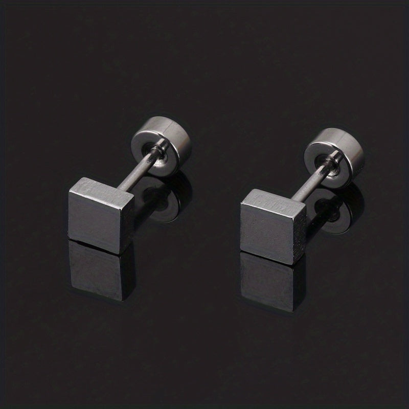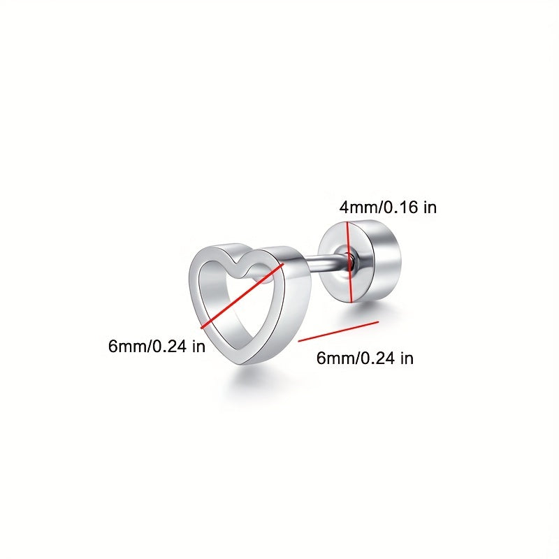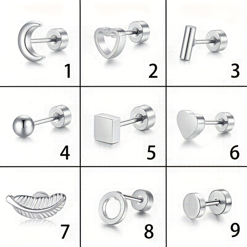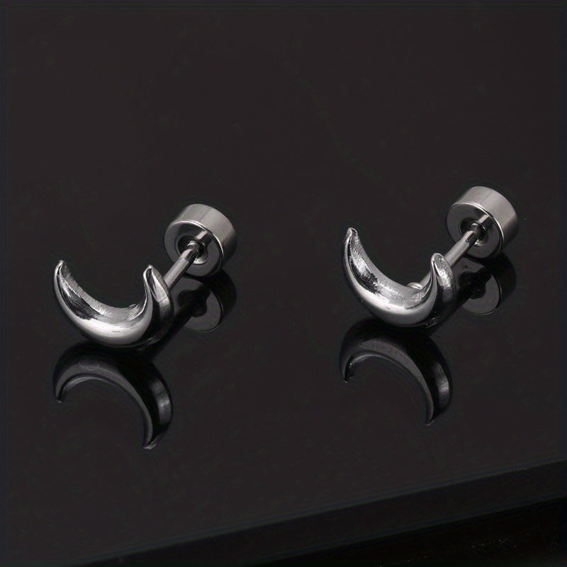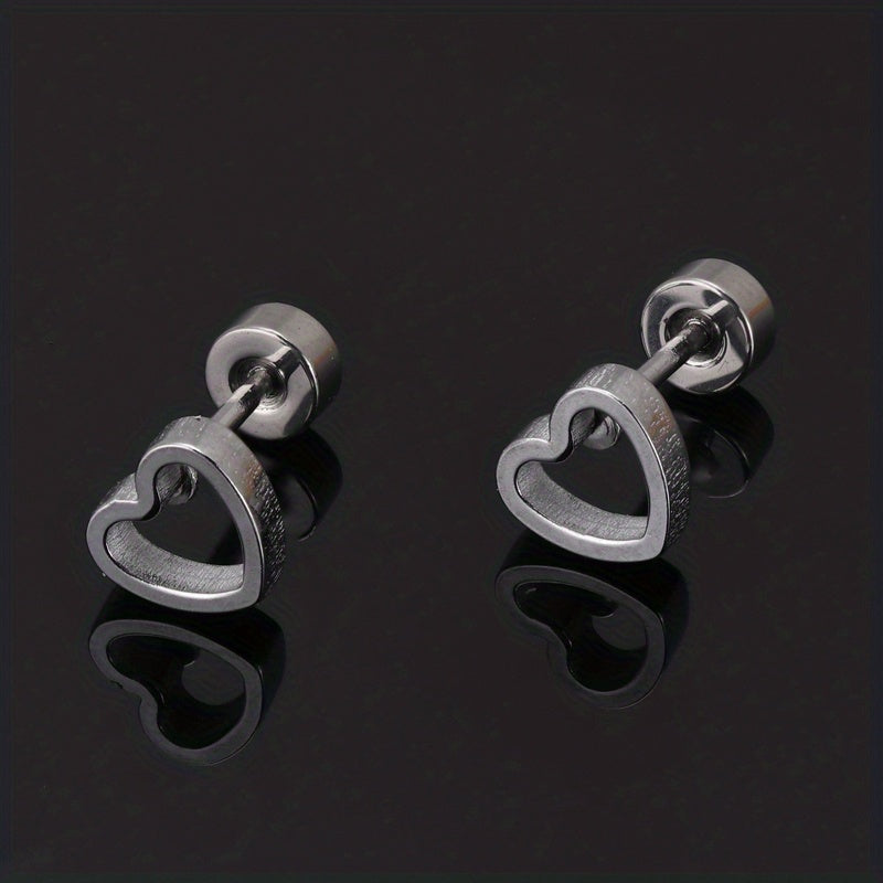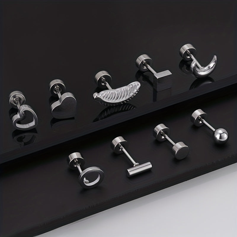 These stainless steel stud earrings feature heart, moon, cone, and leaf designs, making them stylish and versatile accessories for men.