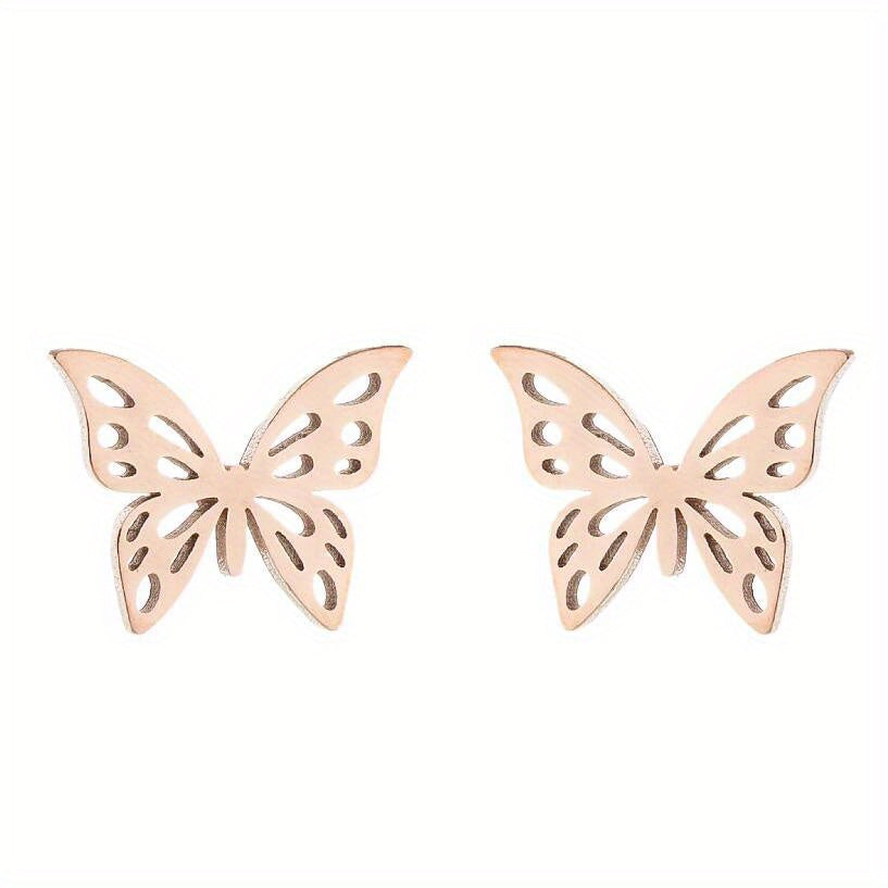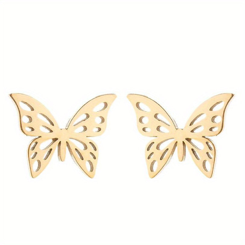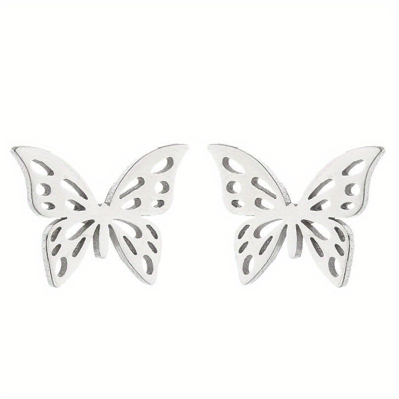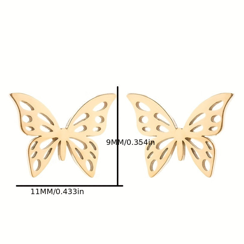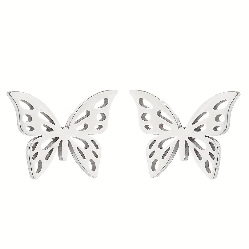 These stainless steel ear studs feature a hollow out butterfly design, adding a touch of personality and temperament to your look. Perfect for matching with any outfit.