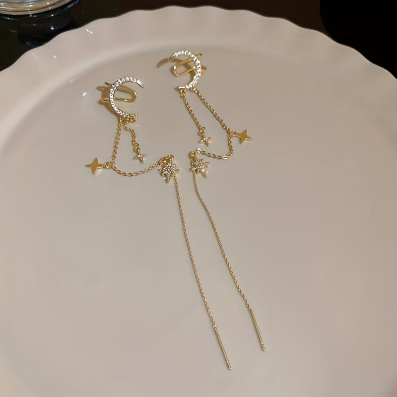 Elegant moon star tassel earrings with a touch of Japanese style crafted in alloy and 14K plated for a creative female gift.