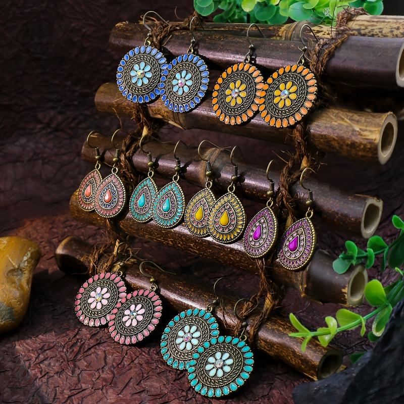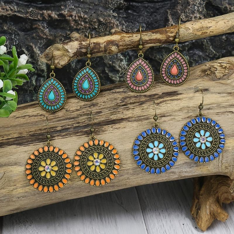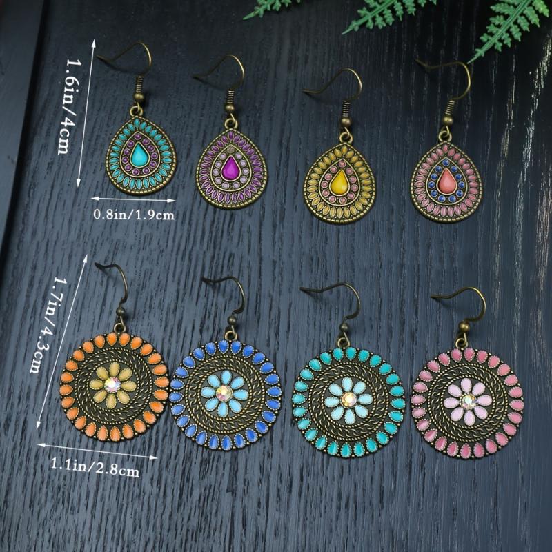 Elevate your style with this retro-inspired earrings set featuring round flower drop pendants in multicolor design. Each pair is adorned with rhinestone and turquoise embellishments for a chic look.