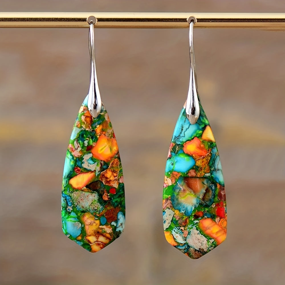 Add a pop of color to your look with these vibrant natural imperial stone dangle earrings. The bohemian style design is perfect for any occasion. Silver plated for a sleek finish.