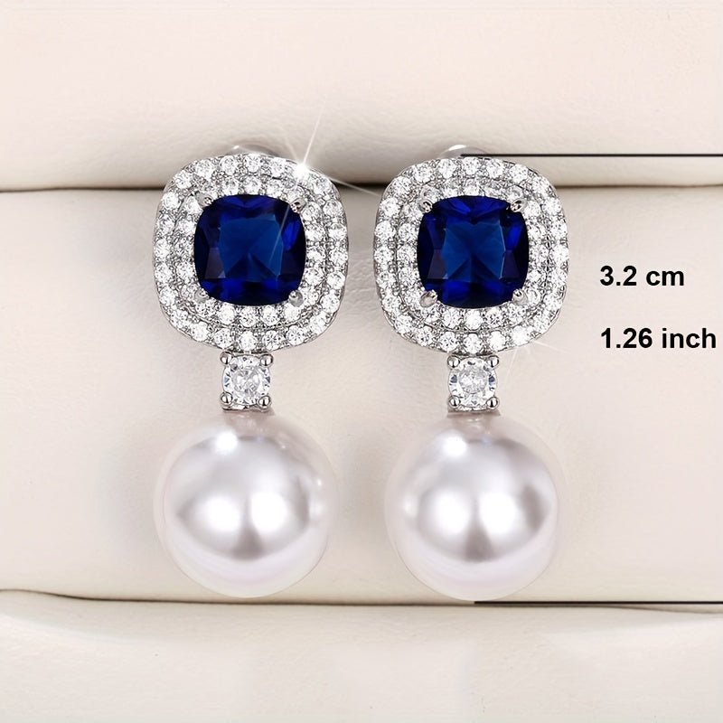 Navy Zircon Decor Faux Pearl Pendant Dangle Earrings Silver Plated