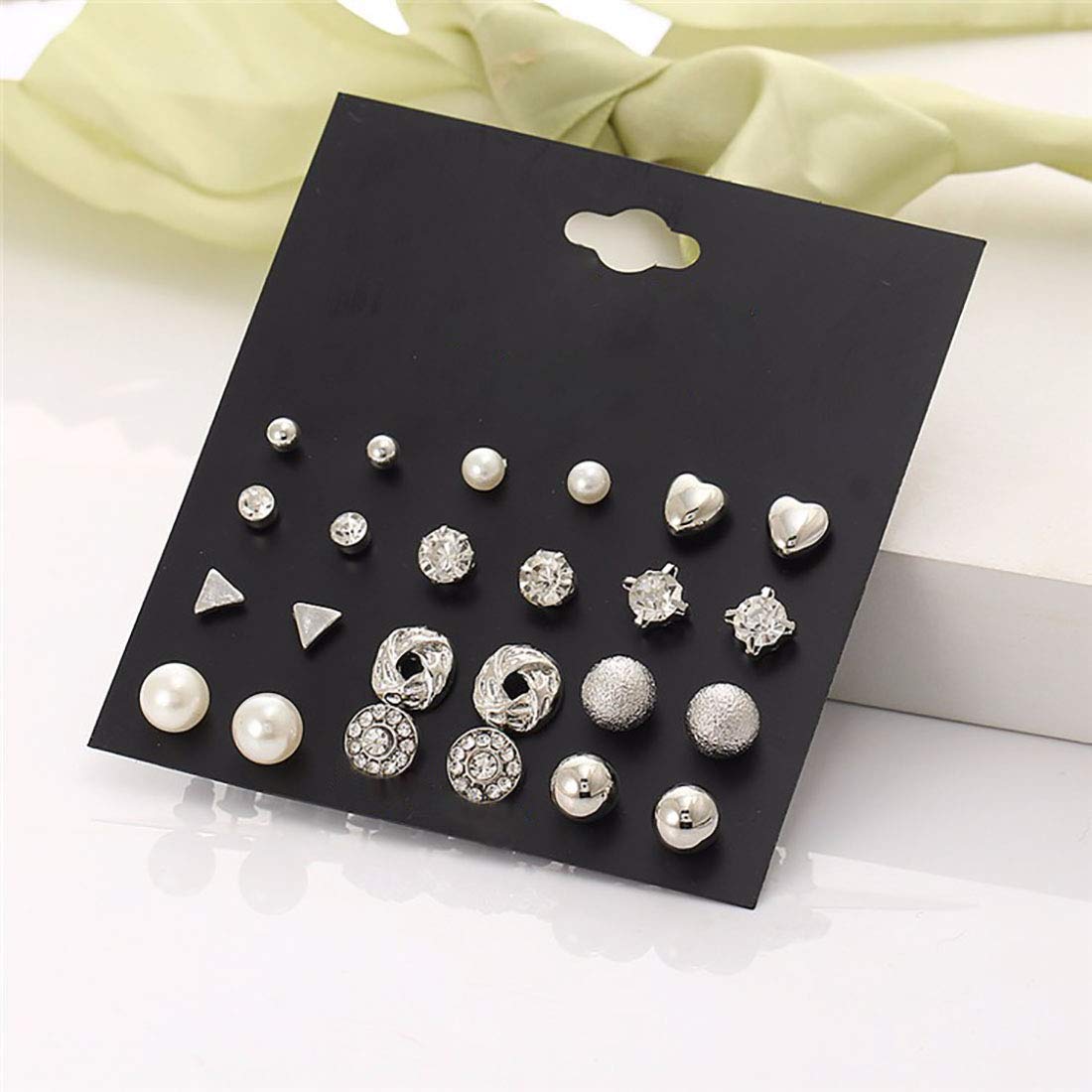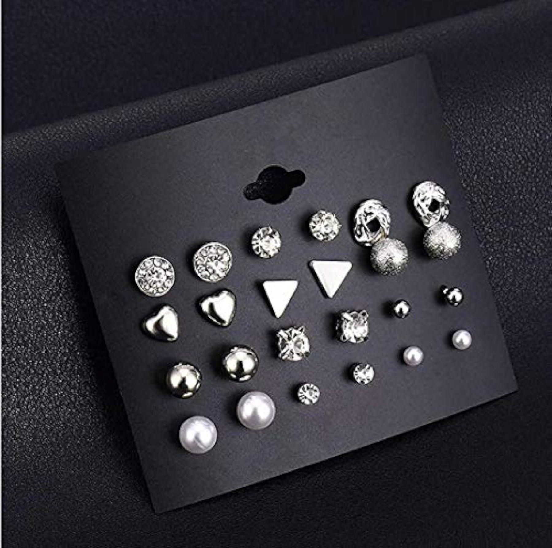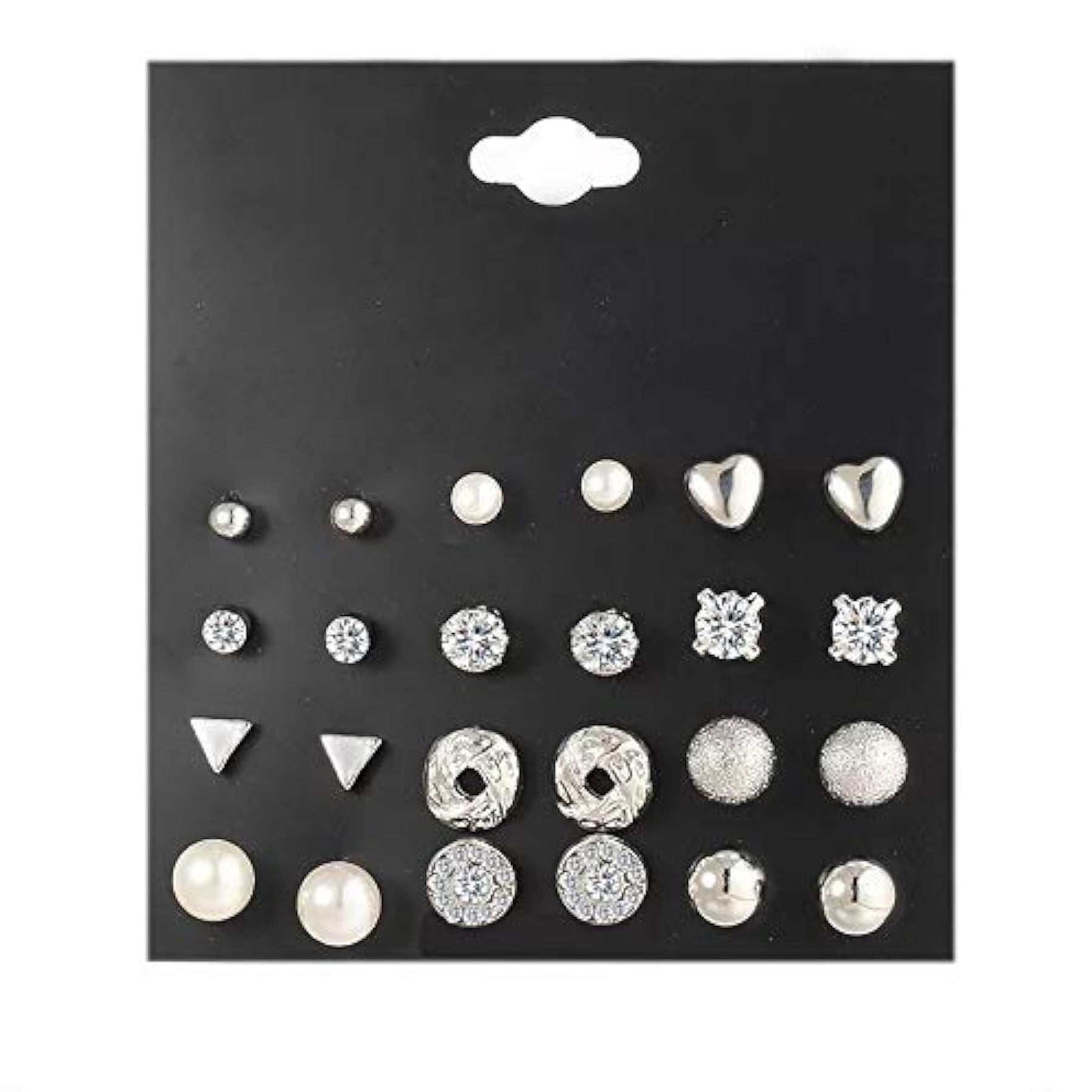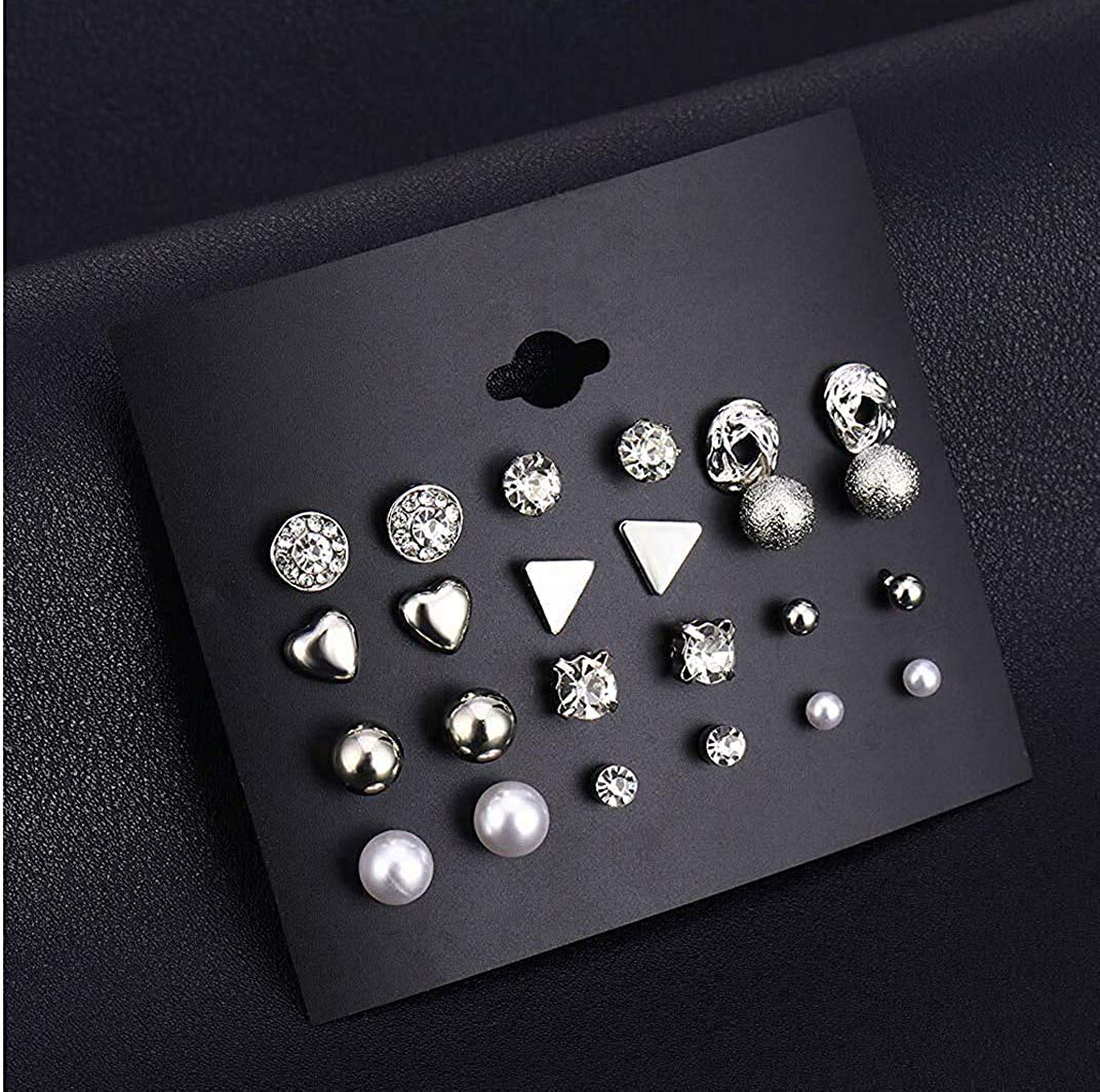 Elevate your style with this combo set of 12 pairs of silver stud earrings. These earrings are made from non-precious base metal, making them durable and long-lasting. Perfect for everyday wear or special occasions.