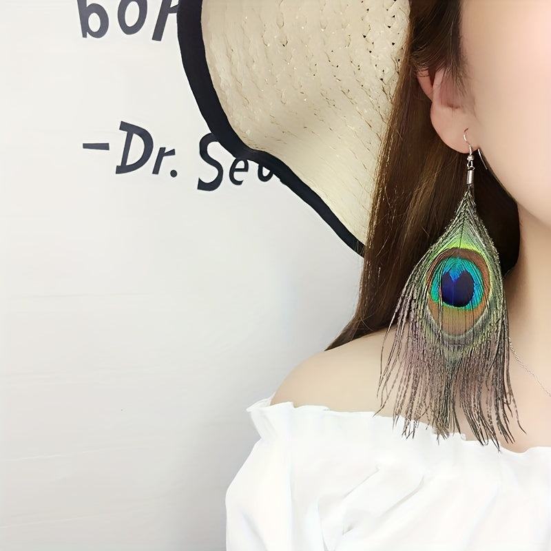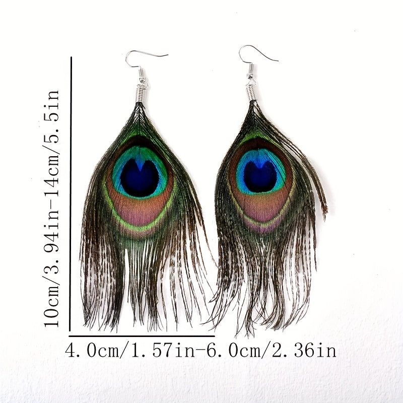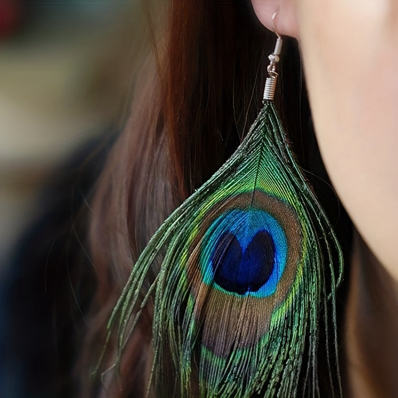 Add a touch of bohemian charm to your daily wear with these stunning peacock feather dangle earrings. The silver plated jewelry is perfect for adding a pop of color and style to any outfit.