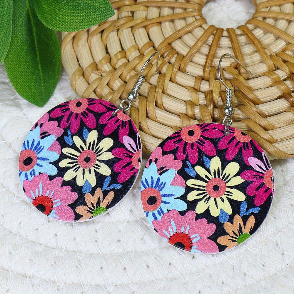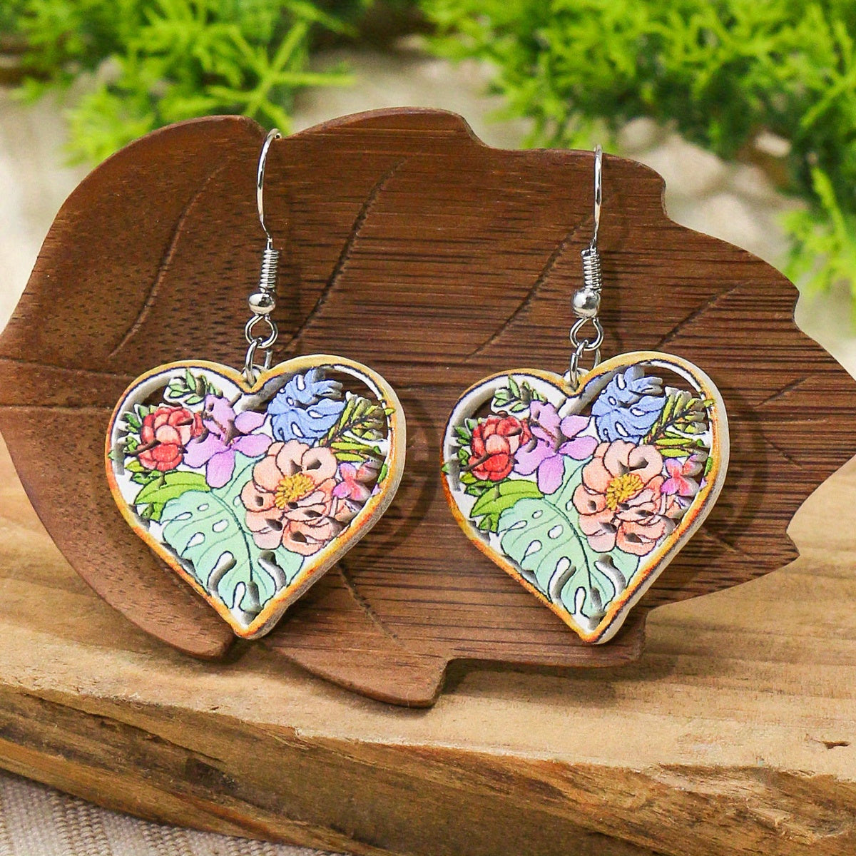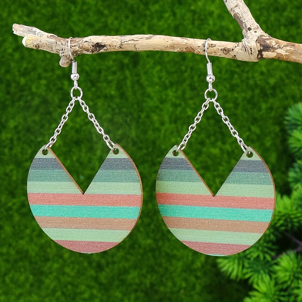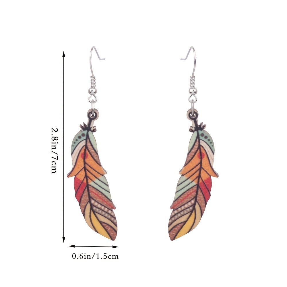 These charming earrings feature a polka dot print with feather and wooden leaf charms. Perfect for adding a unique touch to your outfit.