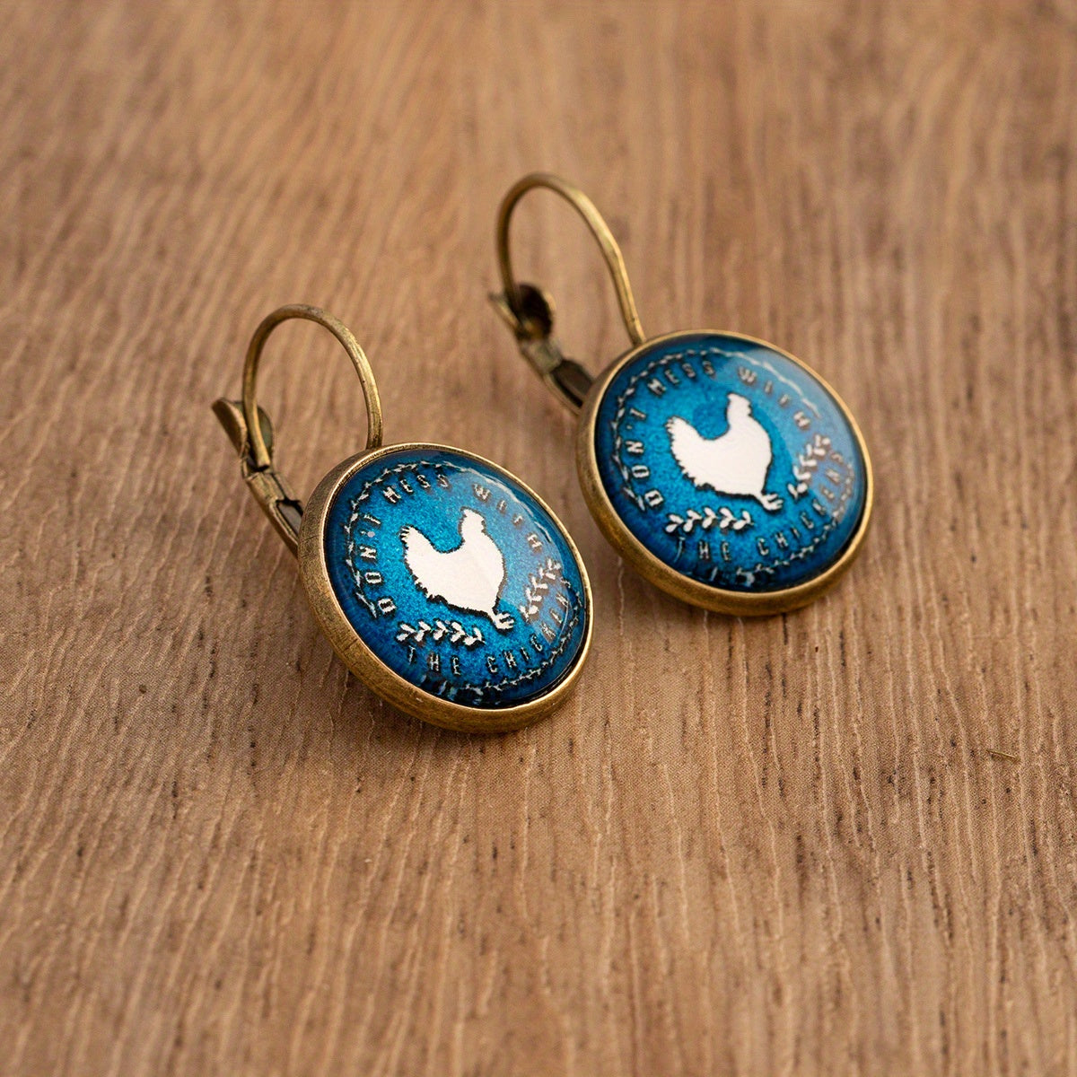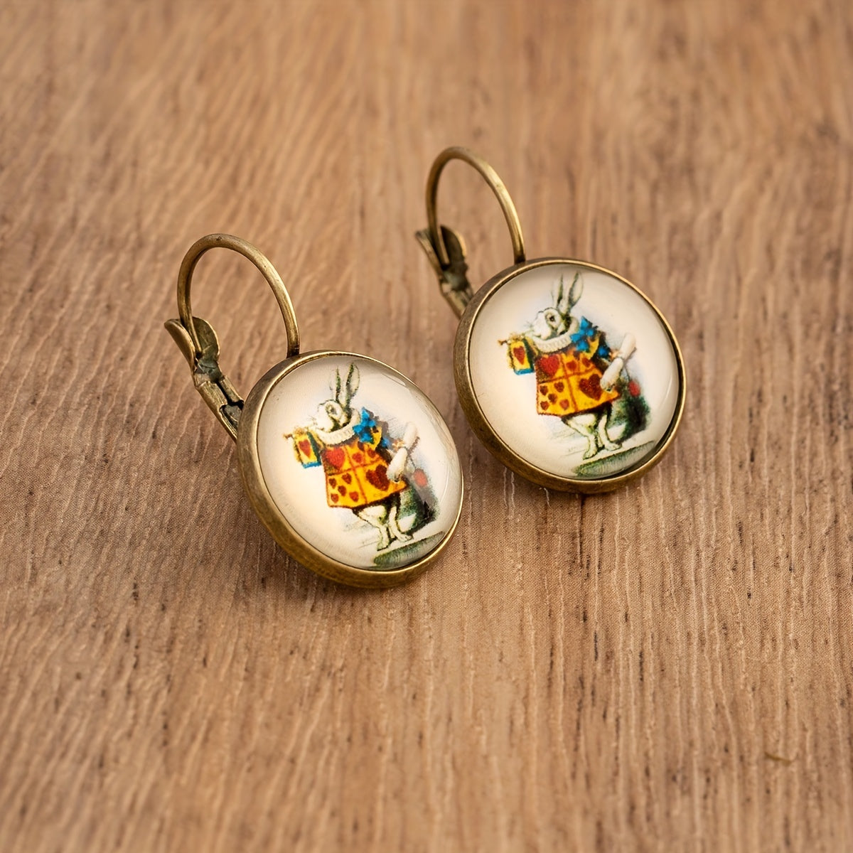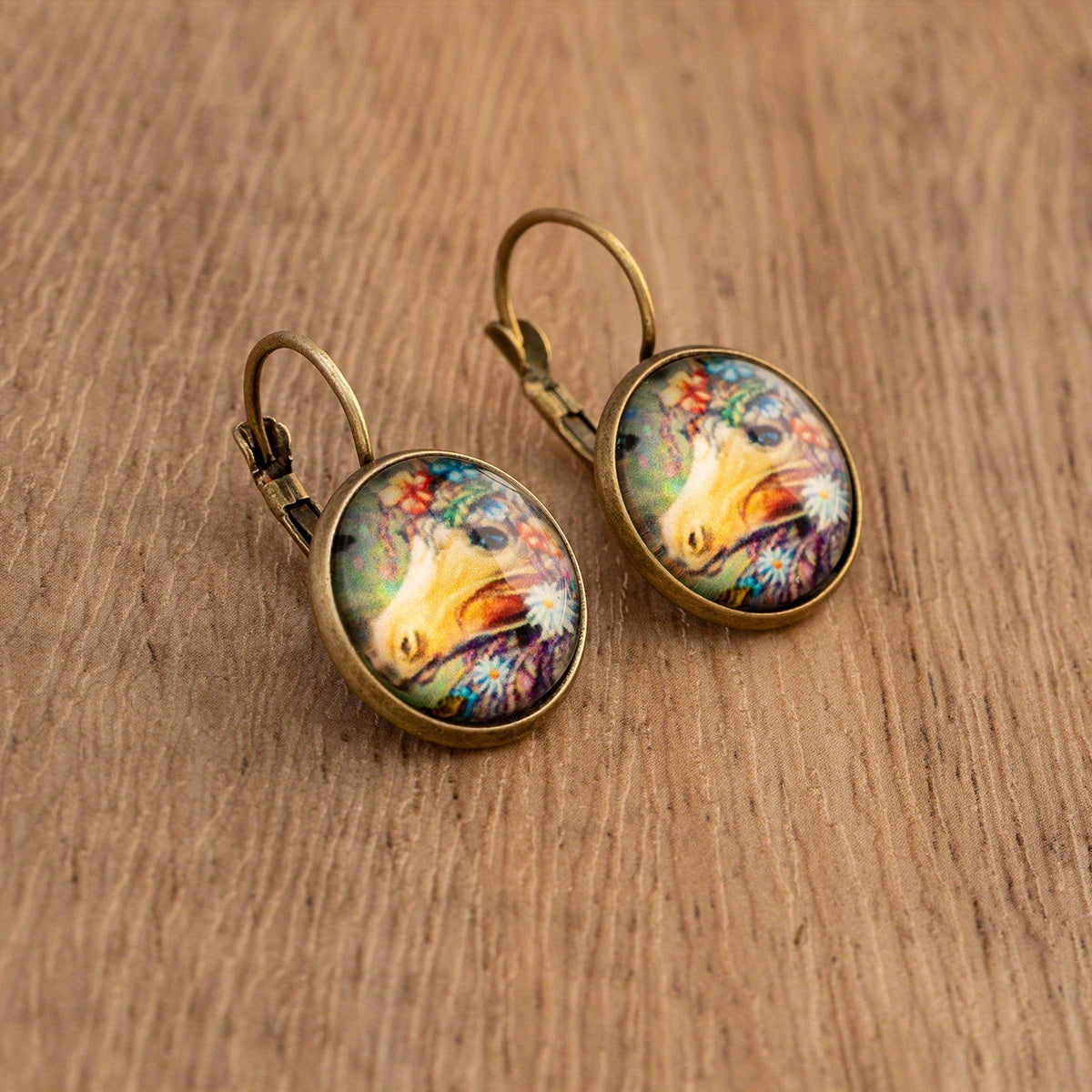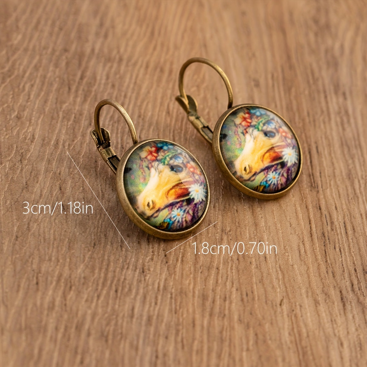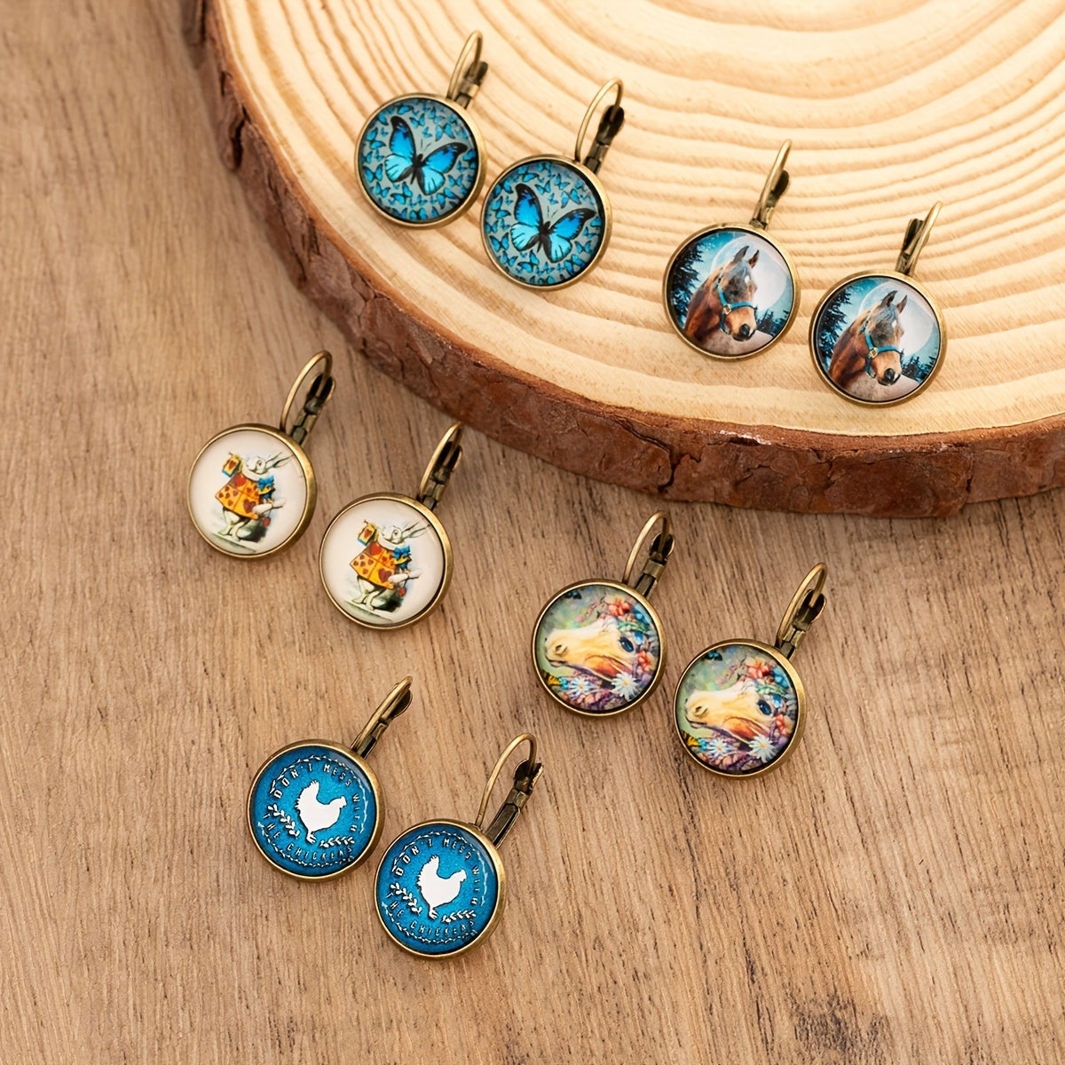 Vintage-inspired round earrings featuring a charming rabbit, chick, horse, butterfly, and flower pattern. A perfect gift for women and girls who love unique jewelry pieces.