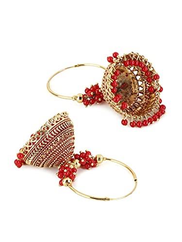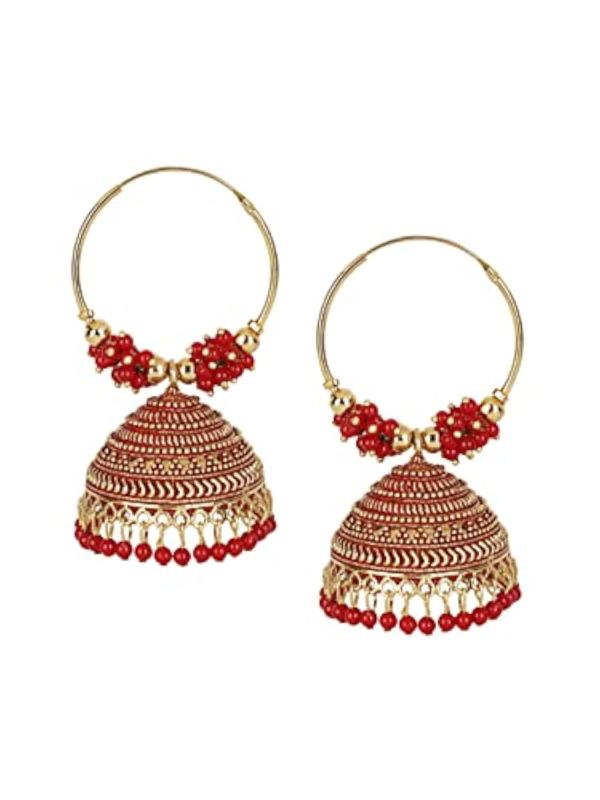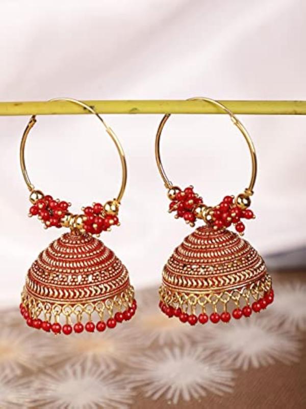 Stunning red and gold-plated jhumkas earrings that blend traditional and modern styles. Perfect for special occasions.