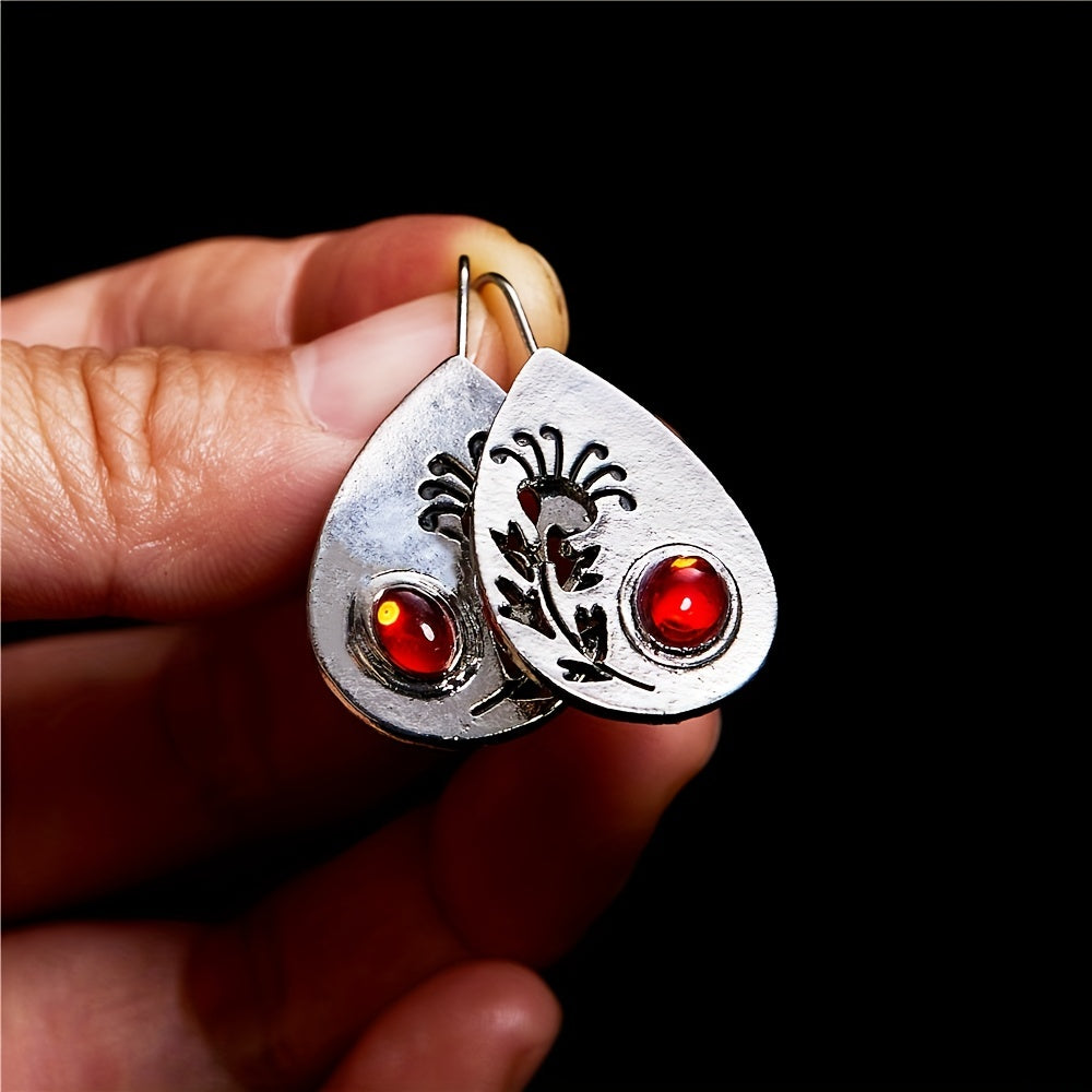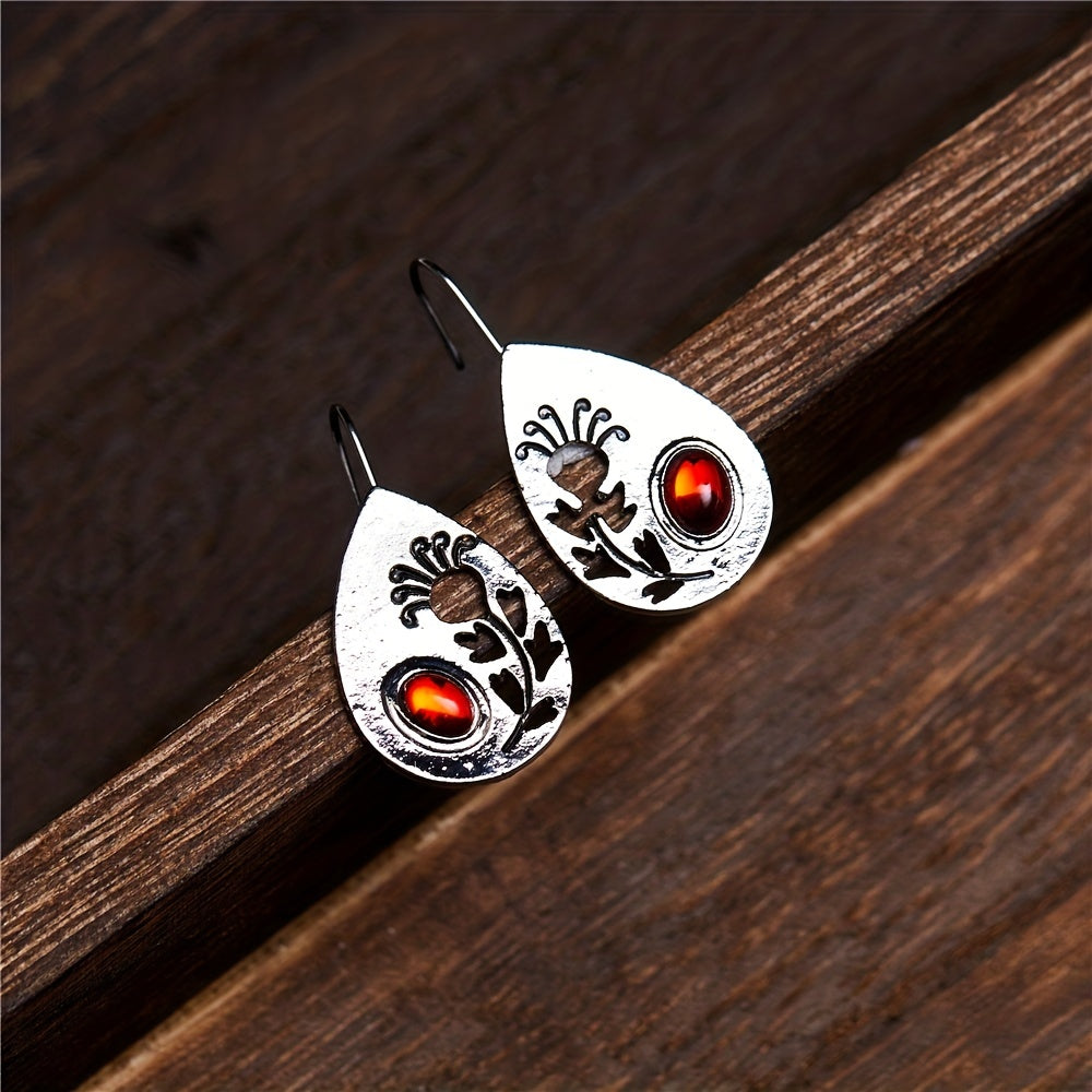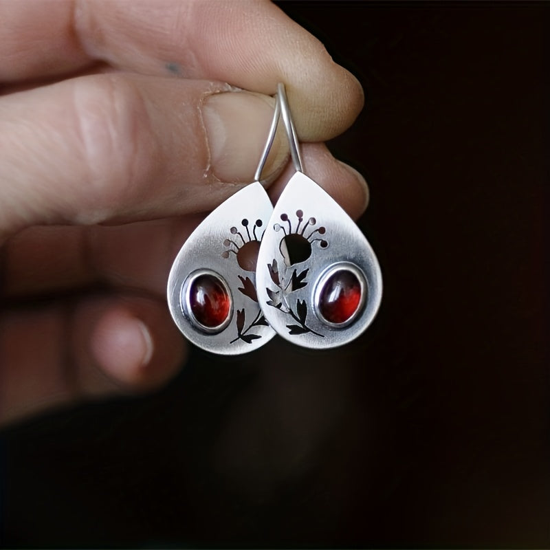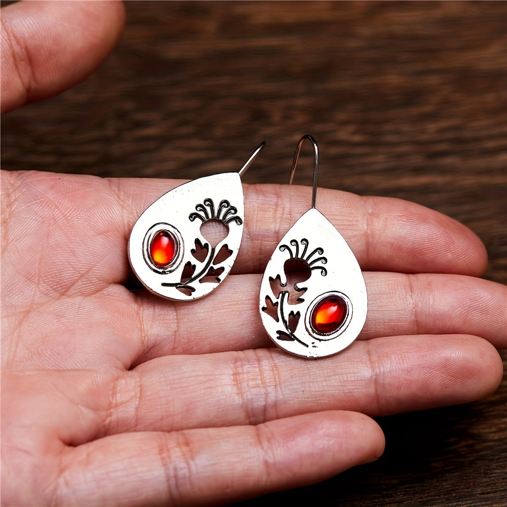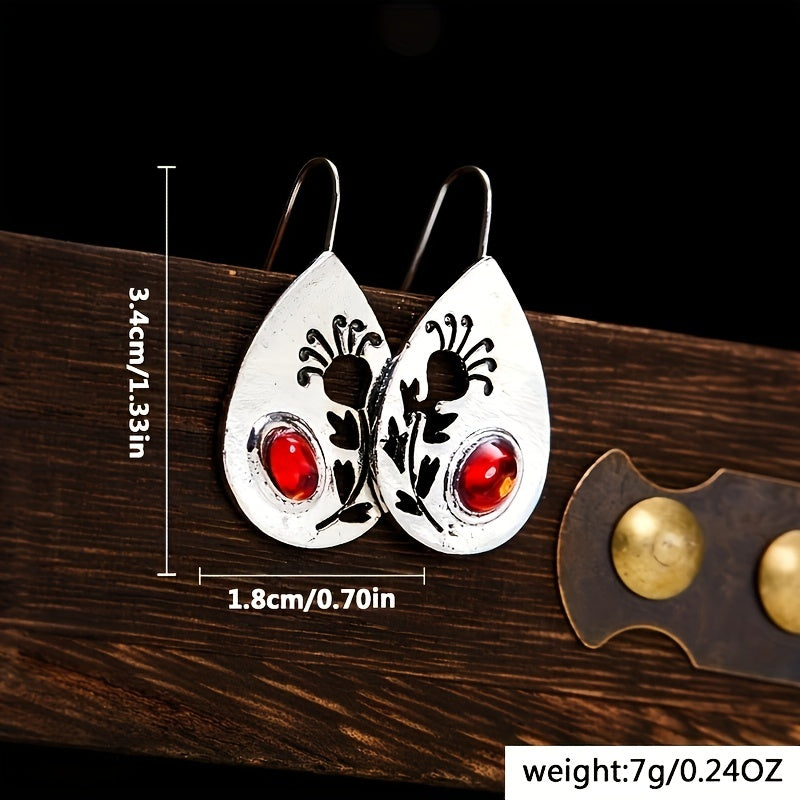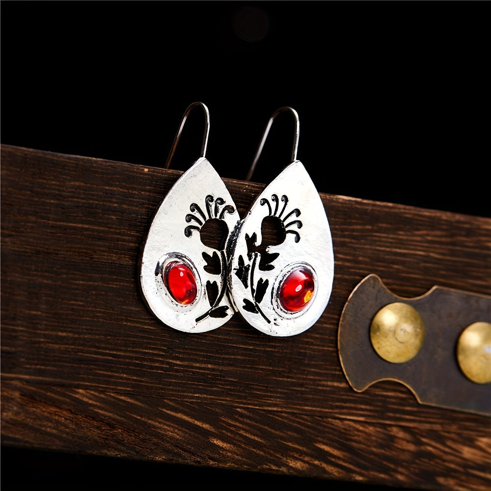 These stunning retro water drop shaped earrings feature a hollow out flower design with ruby accents for a touch of elegance.