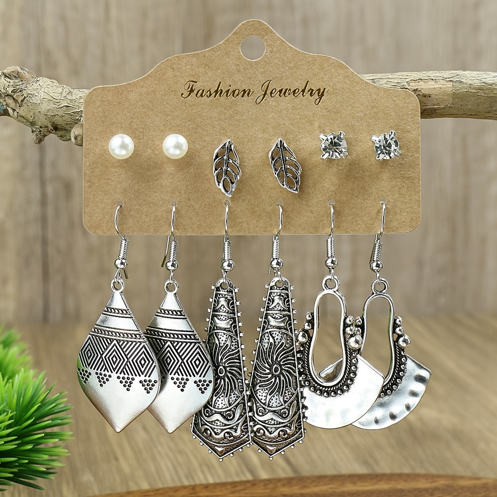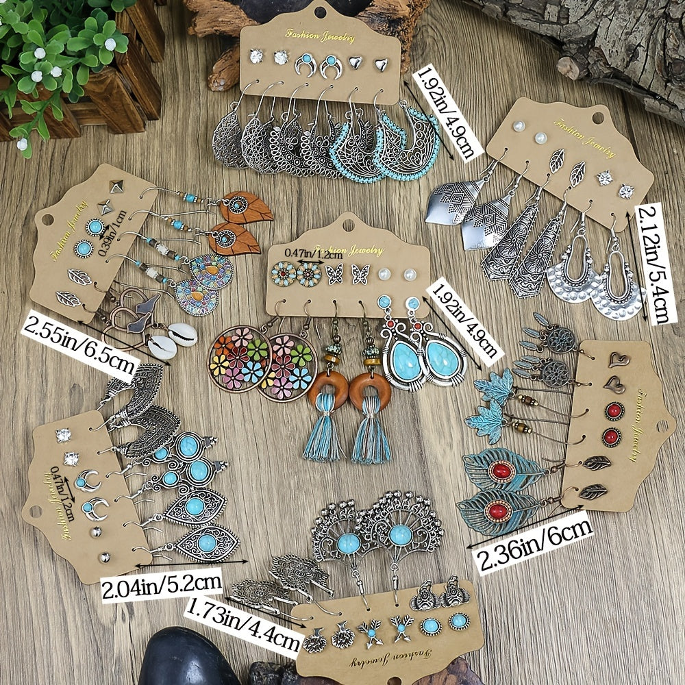 Enhance your retro style with this set of 42 pairs of earrings featuring turquoise embellished geometric designs. Perfect for various occasions.