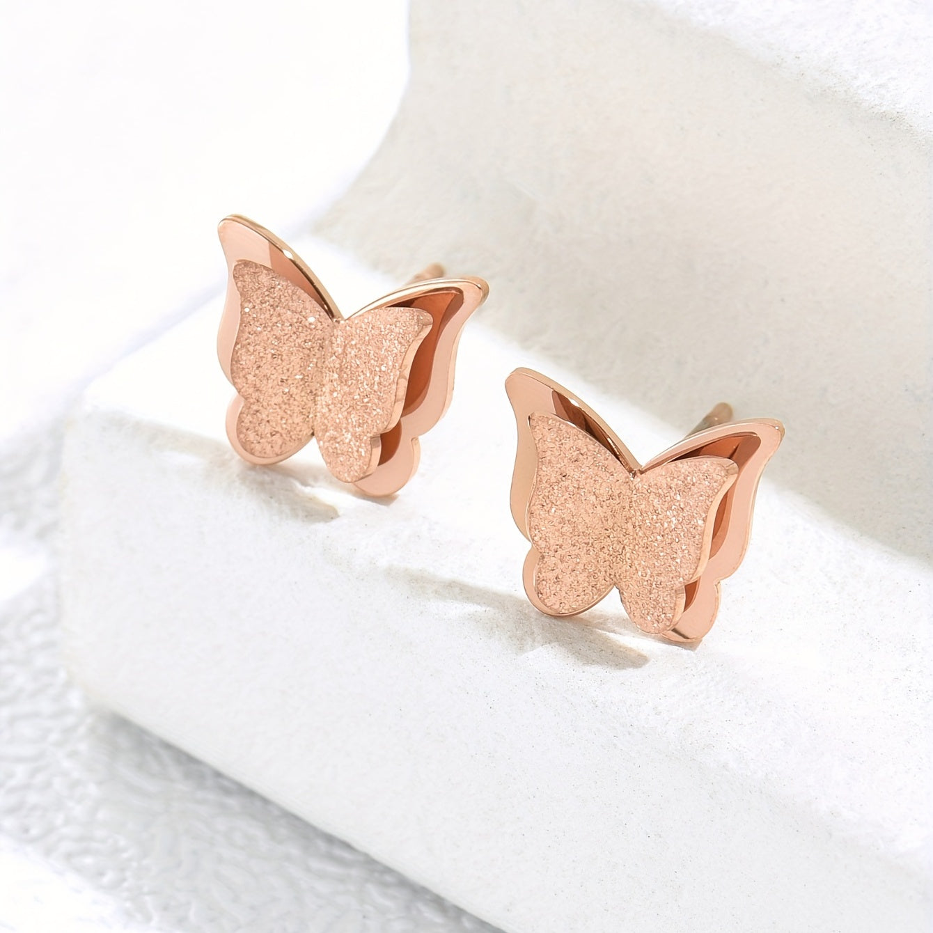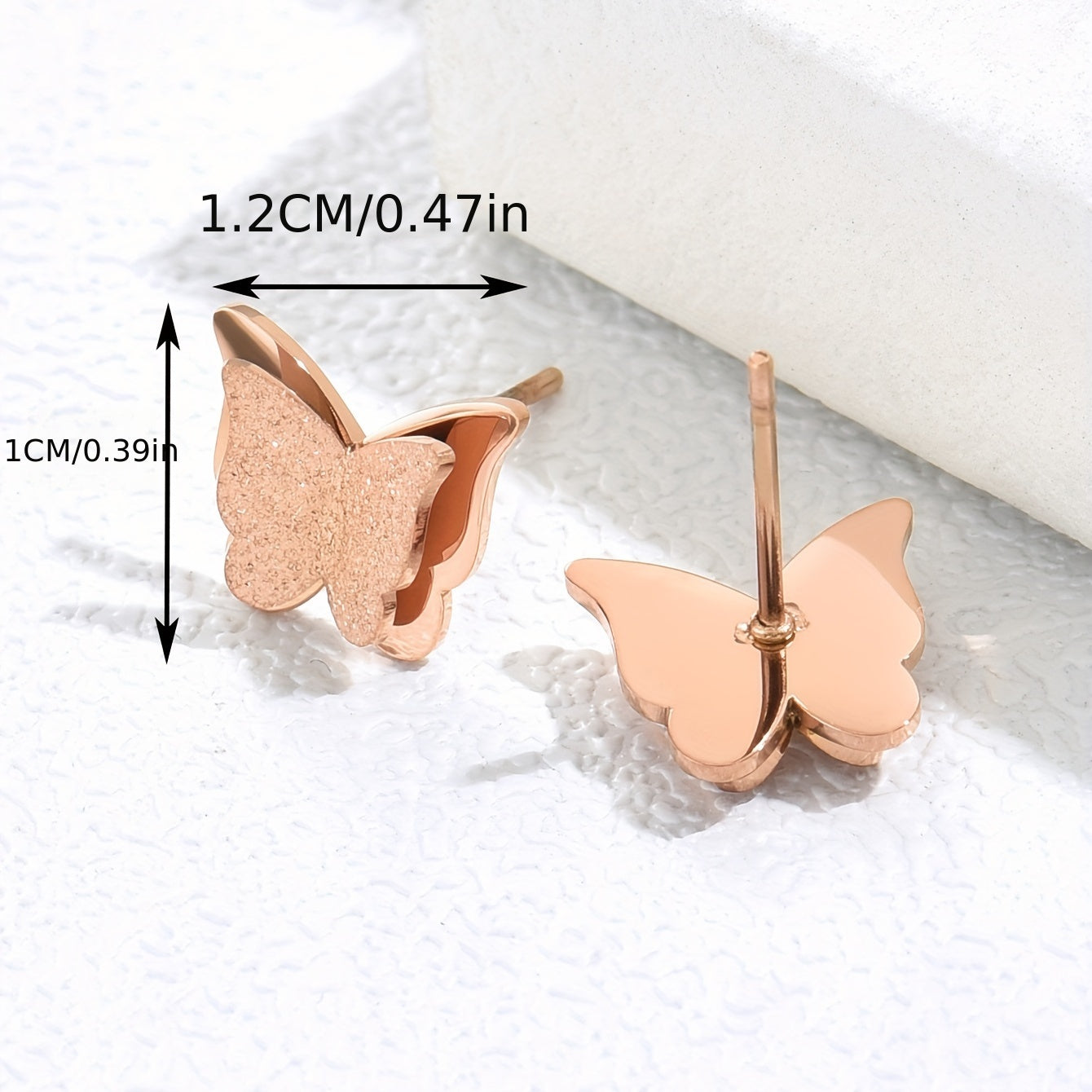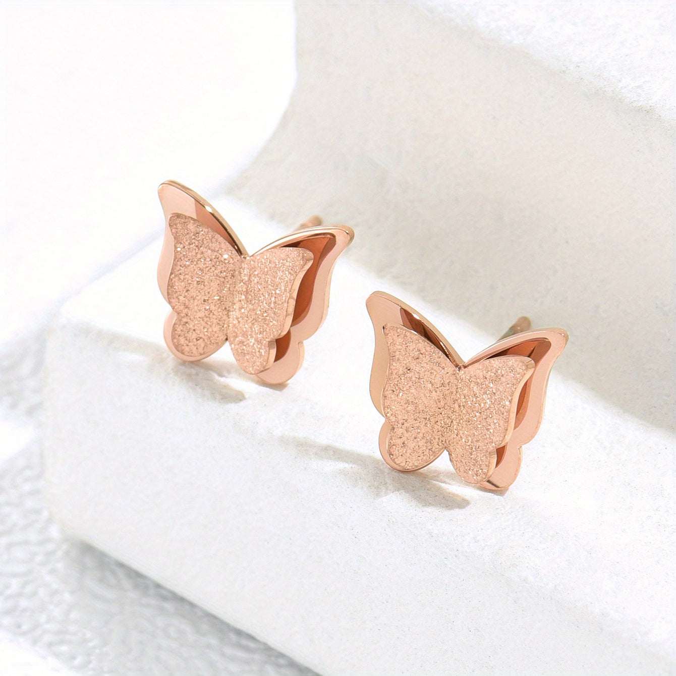 Add a touch of elegance to your daily look with these double-layer rose golden butterfly stud earrings. Made of high-quality stainless steel with 14K gold plating, these earrings are perfect for both casual and formal occasions.
