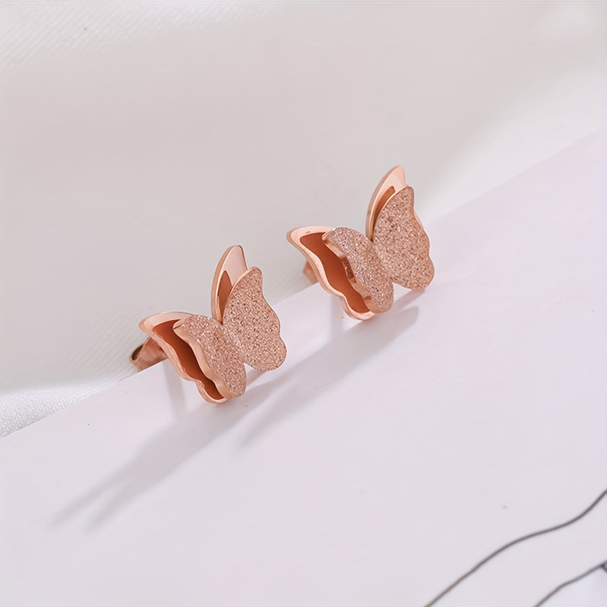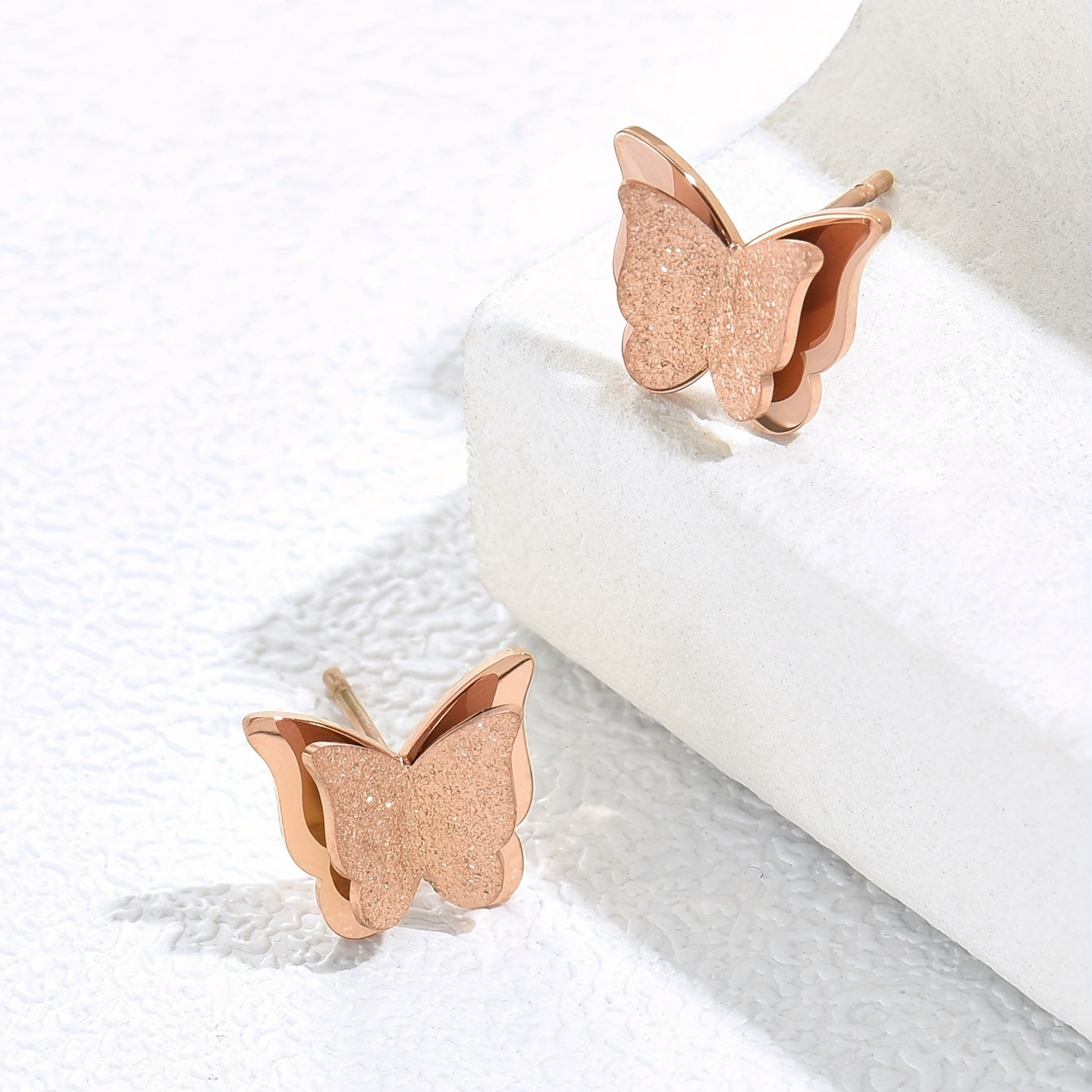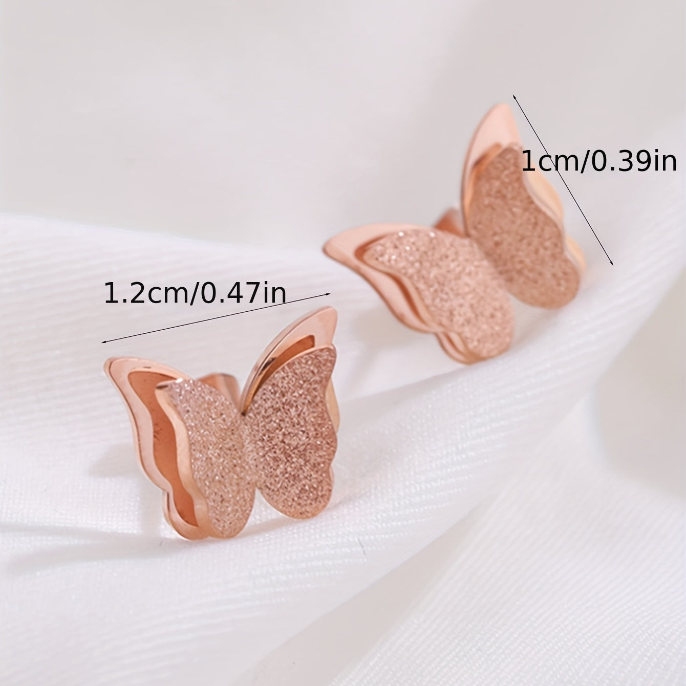 Add a touch of elegance to your daily look with these double-layer rose golden butterfly stud earrings. Made of high-quality stainless steel with 14K gold plating, these earrings are perfect for both casual and formal occasions.