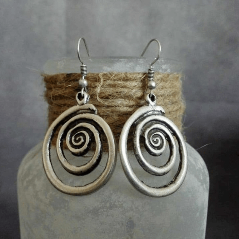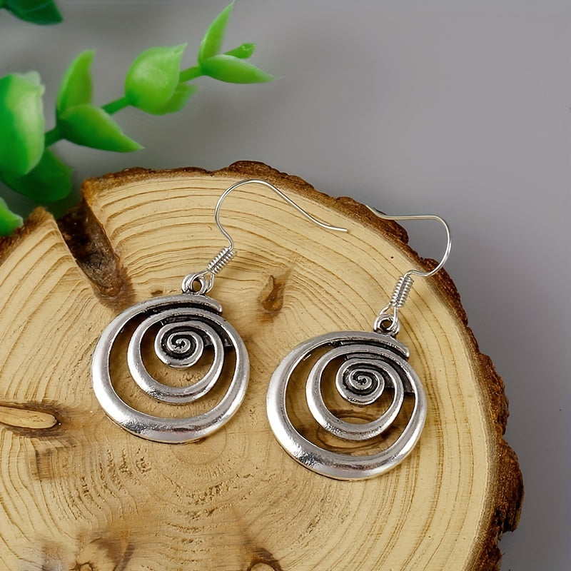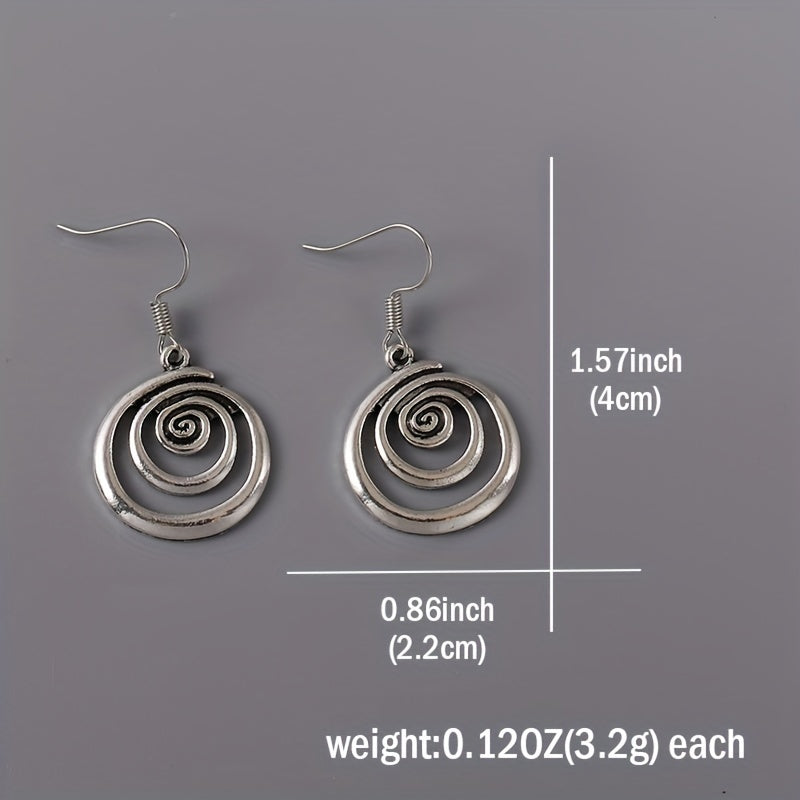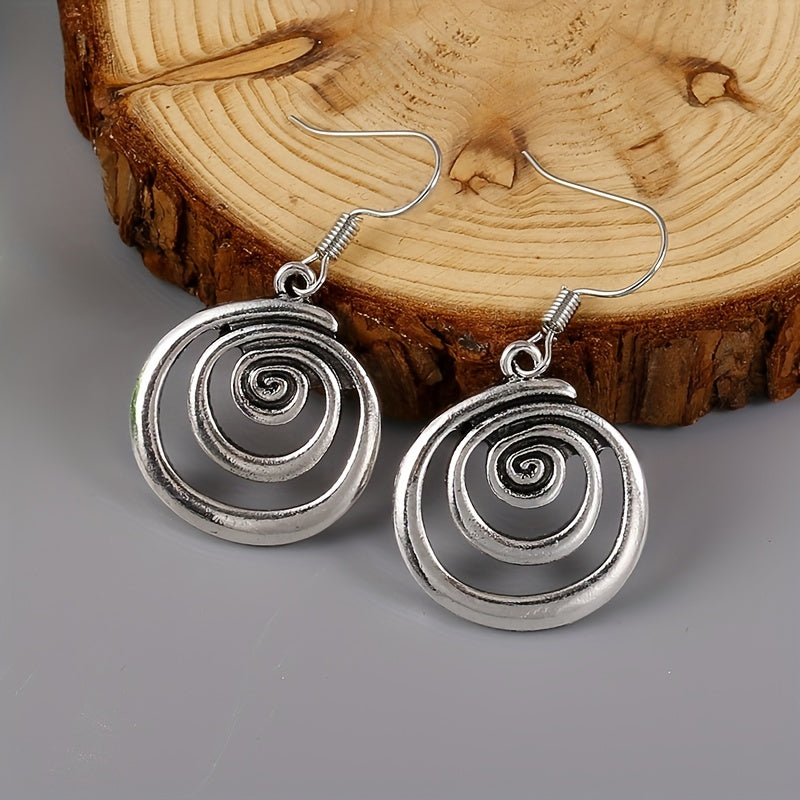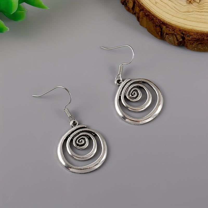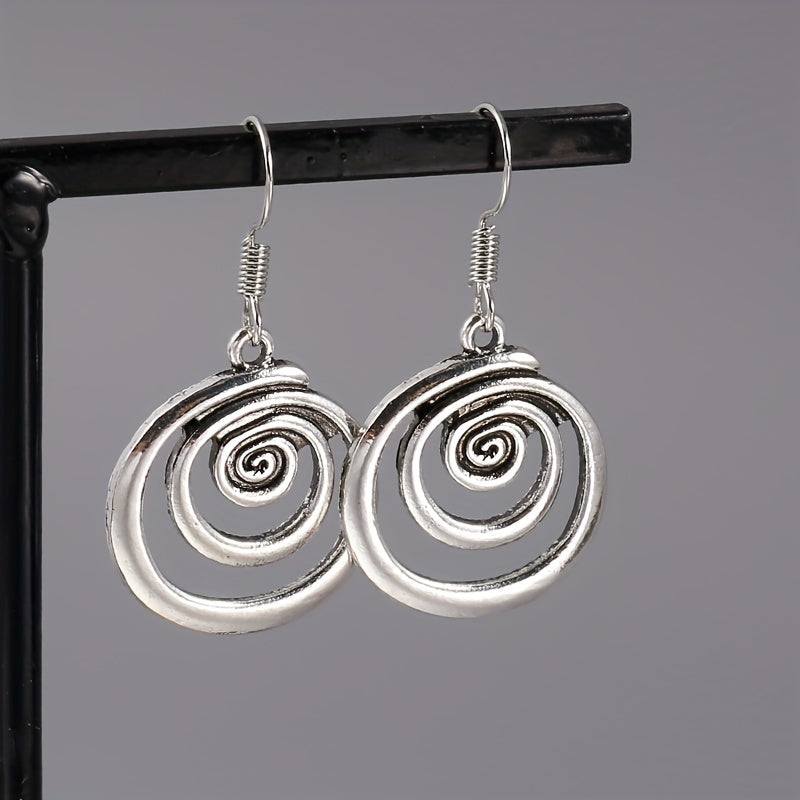 These retro-inspired zinc alloy dangle earrings feature a silvery spiral hook design. Perfect as a gift or souvenir for females who love bohemian style jewelry.