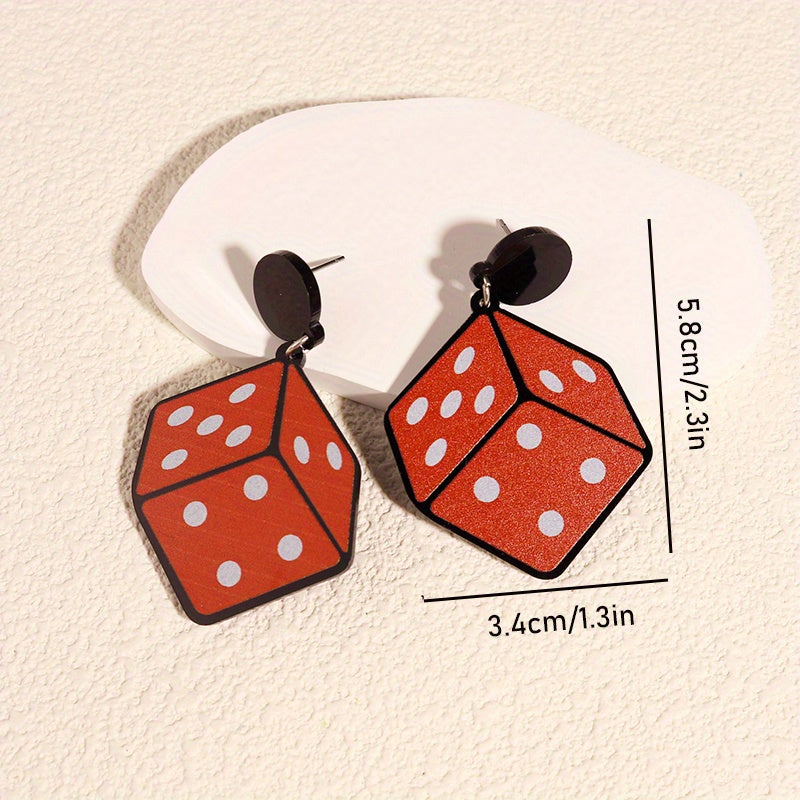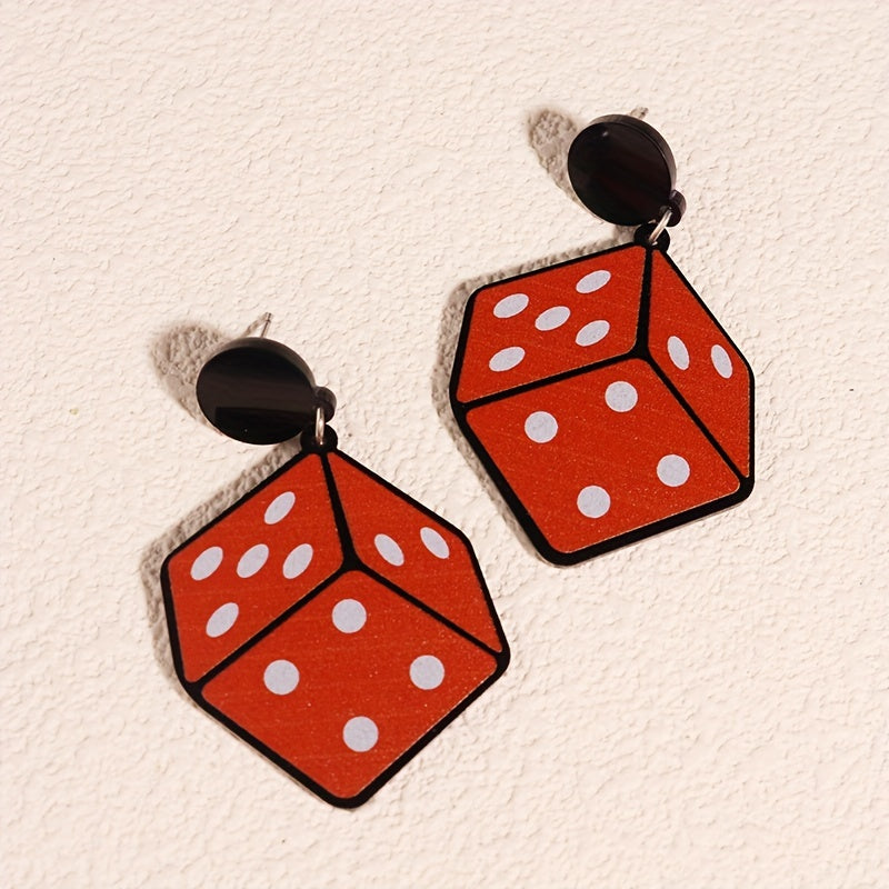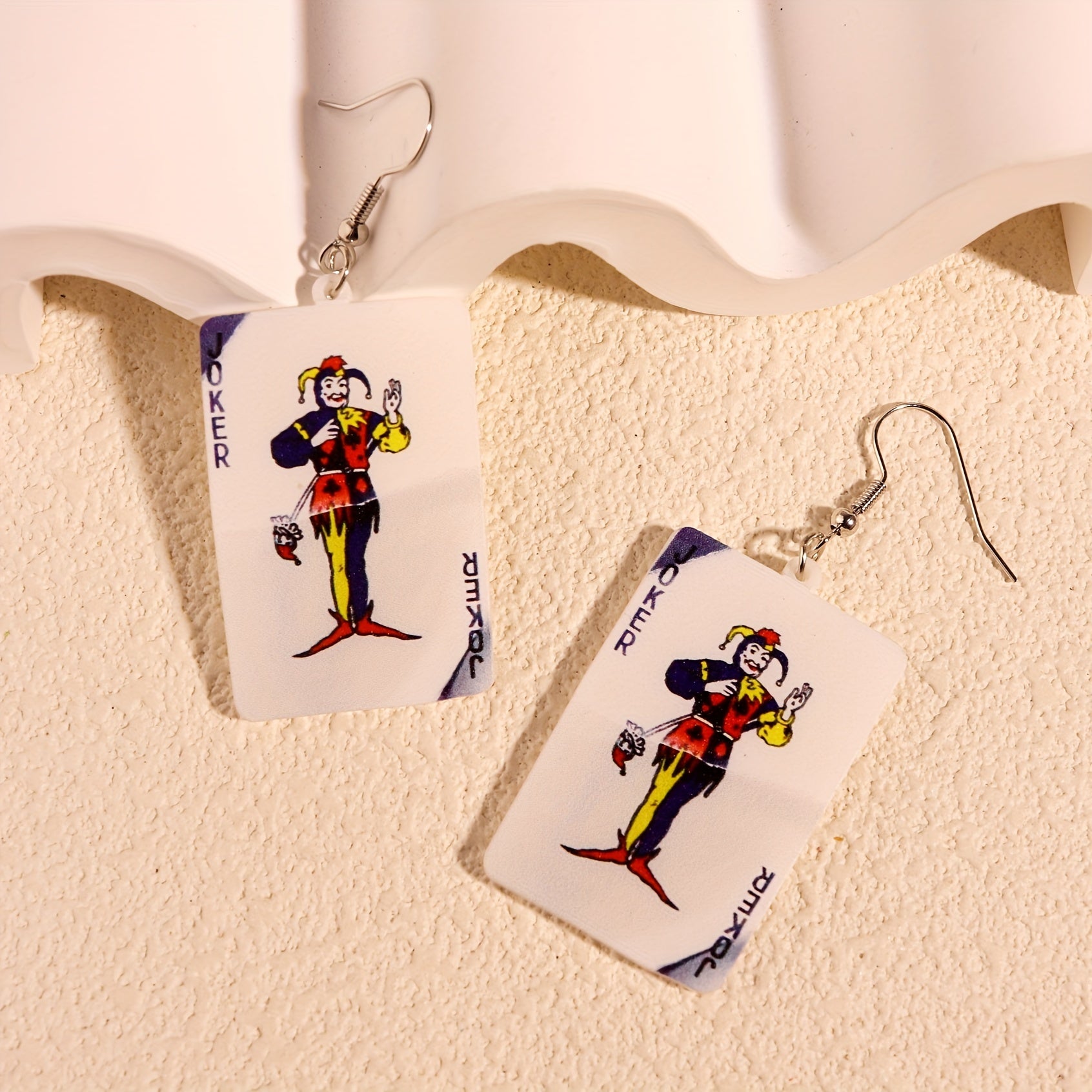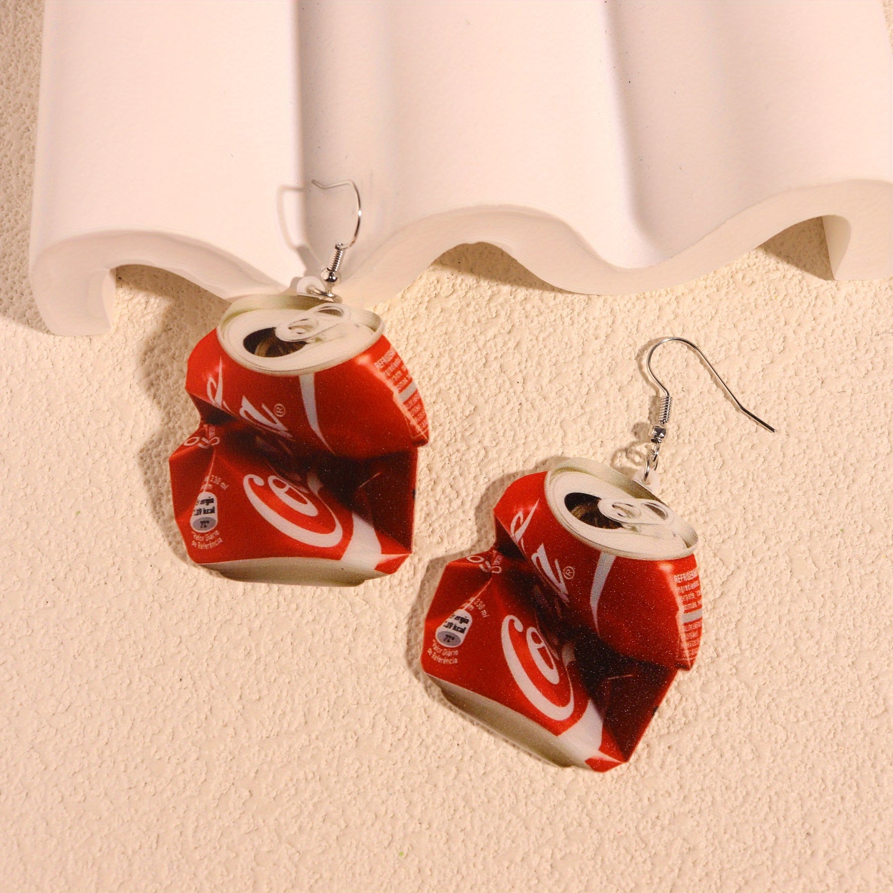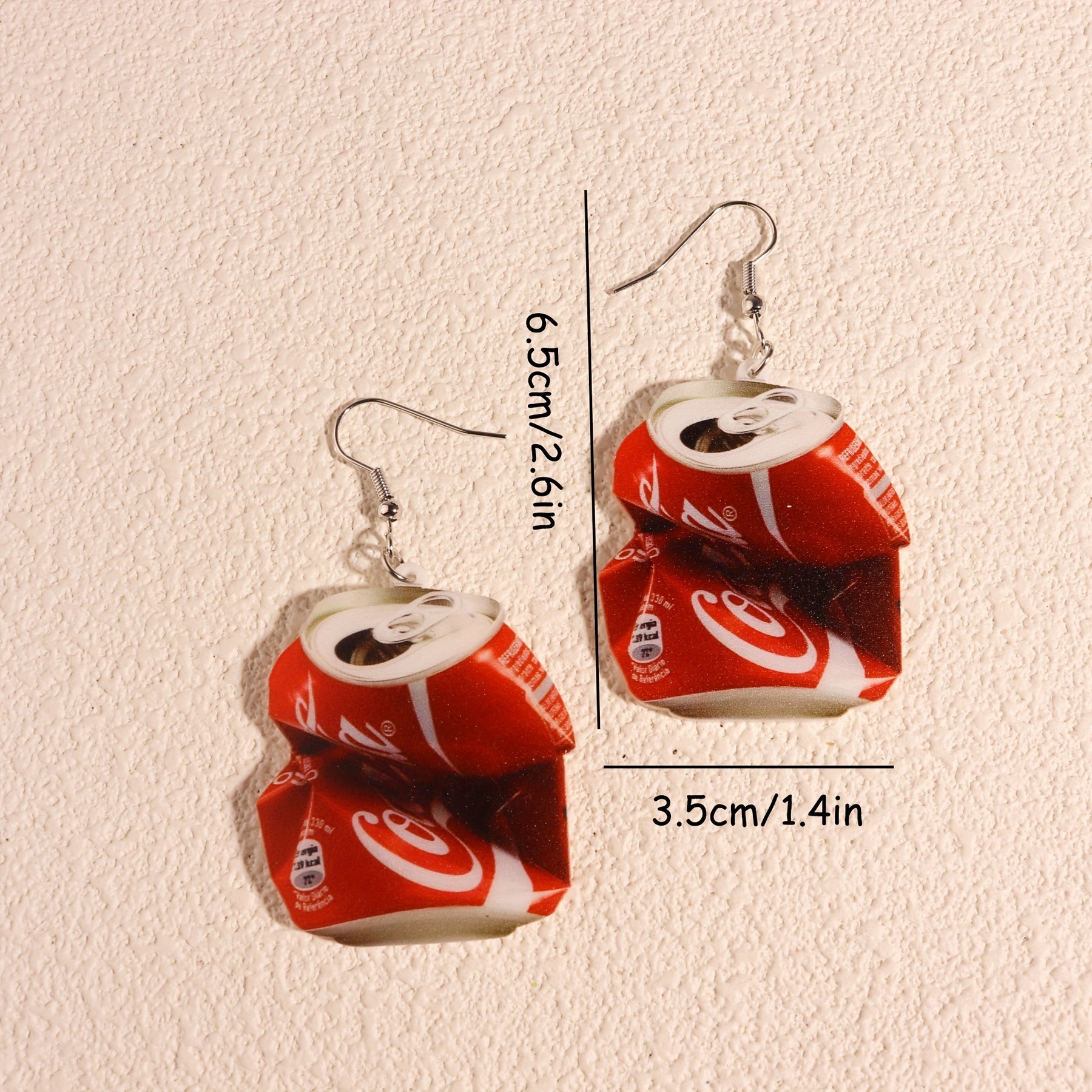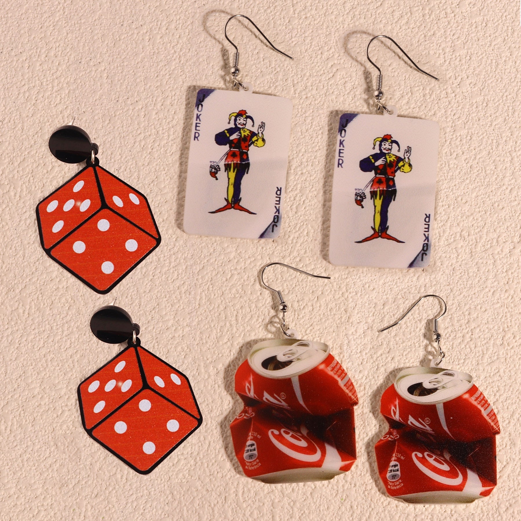 Hip hop style earrings featuring tin can and playing card design. Made of acrylic, this unique jewelry piece is a great gift for females.