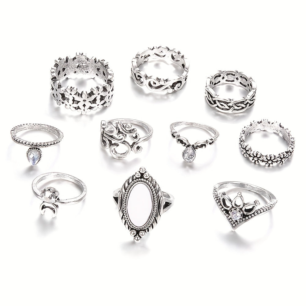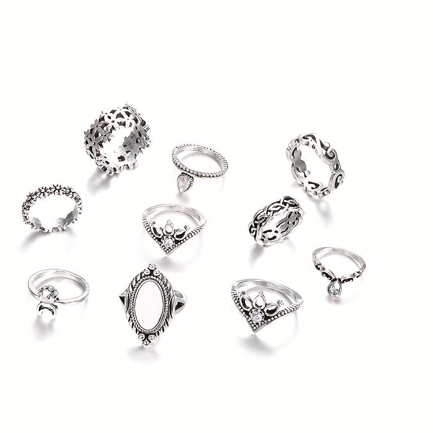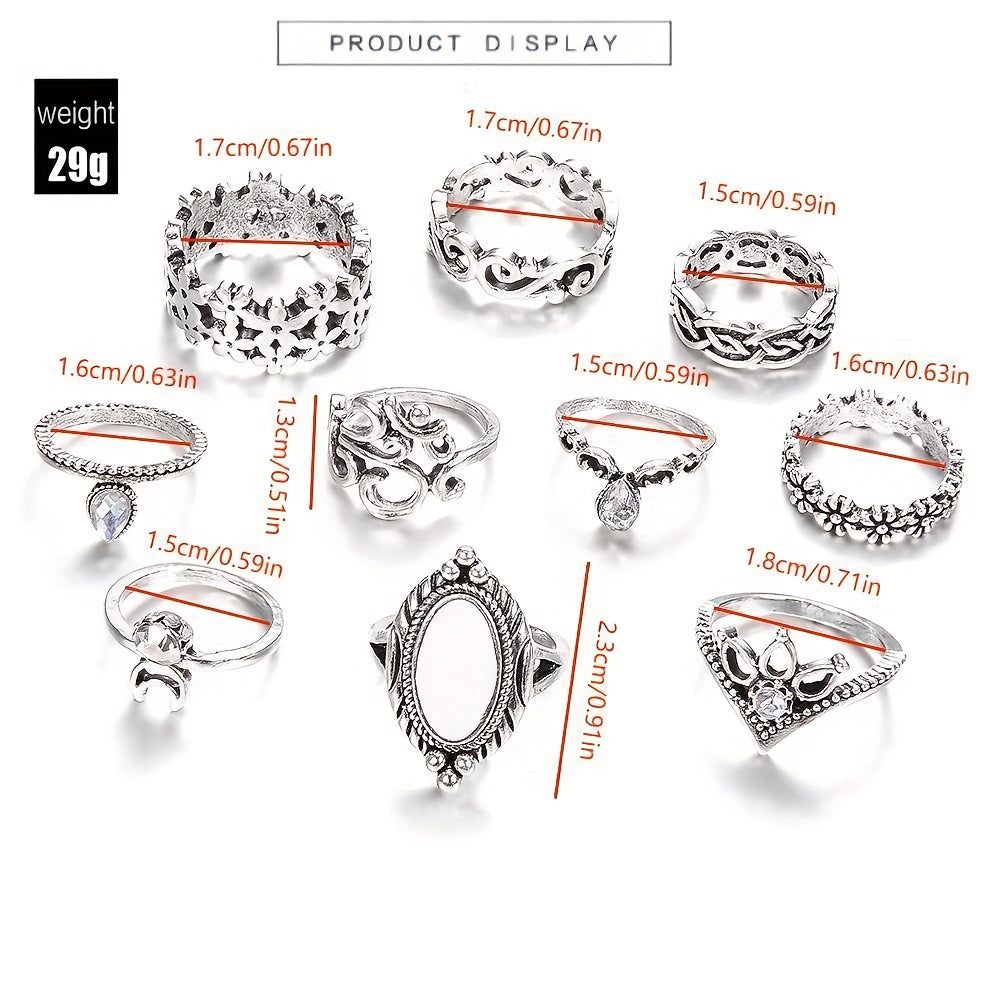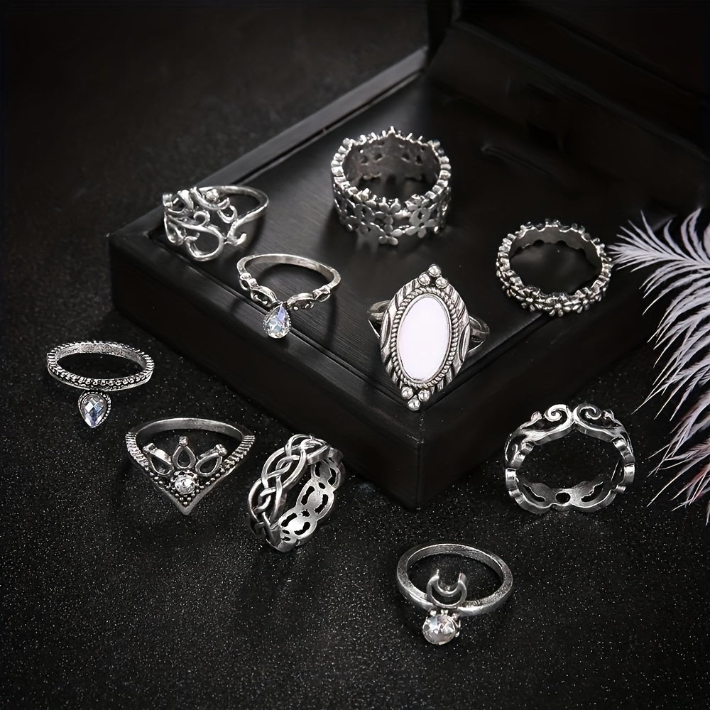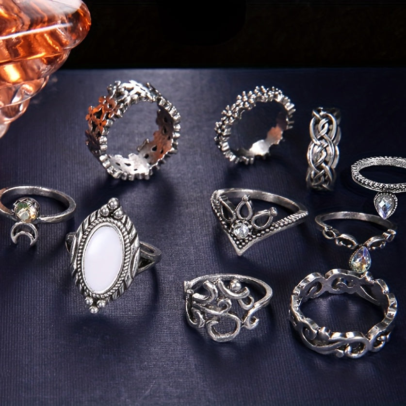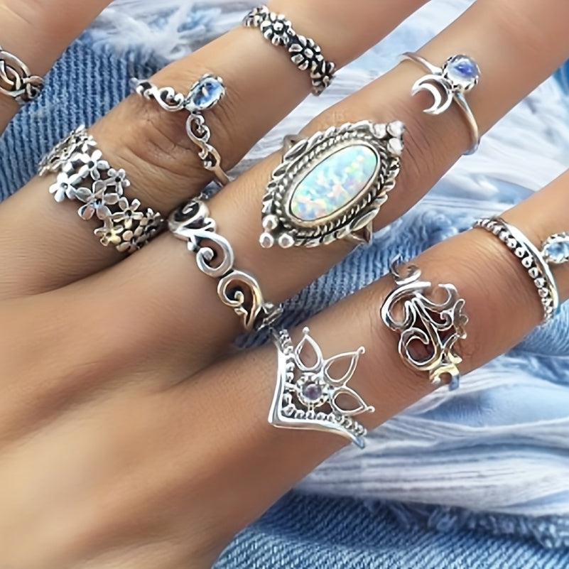 10 Pcs Opal Moon Crown Ring Set Men's Jewelry Gift For Couple Holiday Party